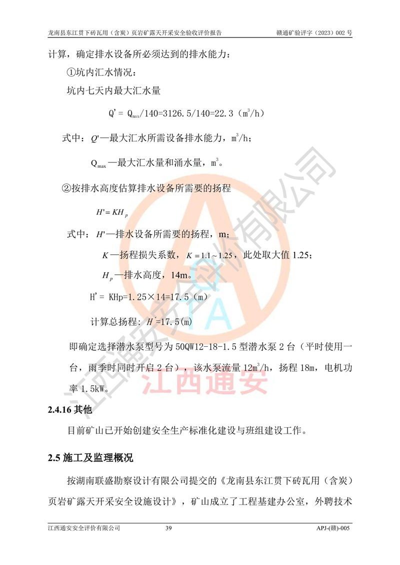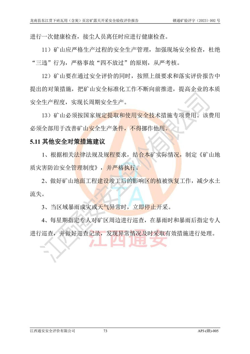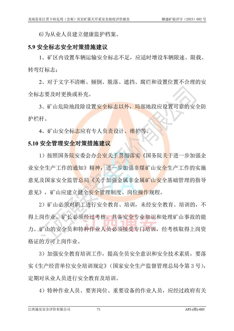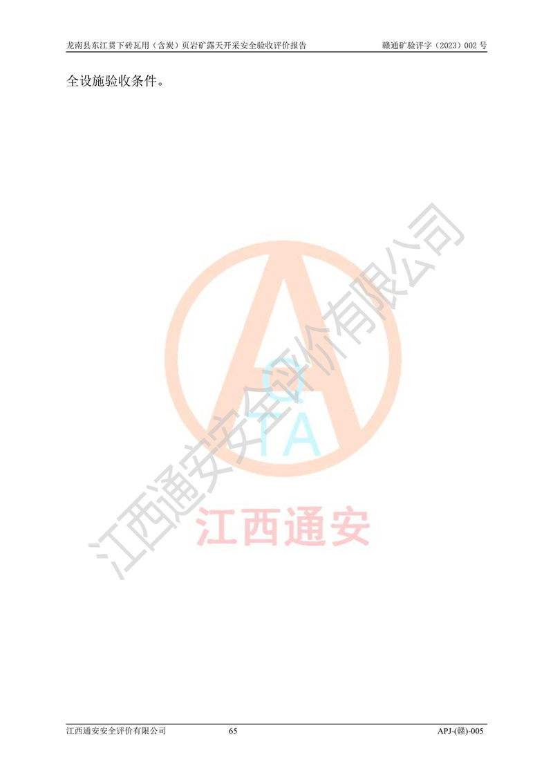 其它 | 1、该评价项目中存在的主要危险因素坍塌(滑坡)、**伤害、高处坠落、物体打击、触电、机械伤害、火灾、泥石流、淹溺等。 2、该评价项目中存在的有害因素包括:粉尘、噪声与振动、不良作业环境和其他不利的环境因素等。 3、该评价项目为页岩矿开采矿山,无瓦斯和自燃发火危险,水文地质条件属简单类型。该矿山无瓦斯和自燃发火危险。不使用有毒有害危险化学品药剂进行原矿深度加工,矿山开采未使用**明令禁止使用的设备、材料和工艺等,本建设项目不存在重大危险源。 上述主要危险、有害因素在采取本报告第五章中提出的安全对策措施后,能得到**控制。该项目从安全生产角度符合**有关安全生产法律、法规、规章和技术标准的要求,龙南县东江贯下砖瓦用(含炭)页岩矿露天开采项目,通过矿山基建和试生产,符合安全设施与主体工程同时设计、同时施工、同时投入生产和使用的要求;安全设施符合《龙南县东江贯下砖瓦用(含炭)页岩矿露天开采安全设施设计》的要求,龙南县东江贯下砖瓦用(含炭)页岩矿露天开采项目符合安全设施验收条件。 | ||||