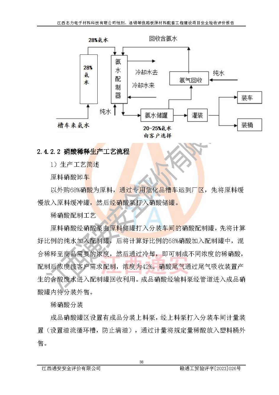项目简介 | 江西志力电子材料科技有限公司成立于2017年12月1日,并取得营业执照,营业执照统一社会信用代码:91360828MA36YAHRX6,法定**人:伍择斌。注册资本:壹仟万元人民币。公司类型:有限责任公司(自然人投资或控股)。 该公司于2022年6月28日取得了万安县应急管理颁发的《危险化学品经营许可证》,证书编号为“赣吉危化经字[2019]万009号”,经营范围:批发、零售:硫酸、盐酸、**、氢氧化钠、氨水(含氨>10%)、过硫酸钠、次氯酸钠、硝酸铁、硫化钠、氢氧化钾、甲醛、氢氟酸、液碱(**期限至2025年8月1日); 该公司于2022年7月15日取得了吉安市应急管理颁发的《危险化学品经营许可证》,证书编号为“赣吉危化经字[2022]360800000035”,零售:硝酸(100t/a)、双氧水(100t/a)、氯酸钠(200t/a)、高锰酸钾(100t/a)(**期至2025年7月24日); 该公司于2022年7月13日取得了万安县应急管理颁发的《非药品类易制毒化学品经营备案证明》,证书编号为“赣万安(易制毒)备字[2019]01”,批发、零售:硫酸(20000t/a)、盐酸(20000t/a)、**(100t/a)、高锰酸钾(100t/a)。 江西志力电子材料科技有限公司2022年8月1日取得了万安县发展和改革委员会出具的《江西省企业投资项目备案通知书》(社会统一代码:2018-360828-26-03-000458)。 根据《国民经济行业分类》GB/T 4754-2017 、《国民经济行业分类》**标准**号修改单GB/T 4754-2017/XG1-2019及《关于修订<冶金有色建材机械轻工纺织烟草商贸行业安全监管分类标准(试行)>的通知》(应急厅[2019]17号),江西志力电子材料科技有限公司蚀刻、退锡等线路板原材料配套工程建设项目属于电子**材料制造〔C3985〕。 项目生产过程中涉及的危险化学品有:氨水(含氨>10%)、硝酸、盐酸、硫酸、硝酸铁、磷酸、液碱、高锰酸钾、双氧水、氯酸钠、柴油(柴油发电机用)等。 项目涉及的高锰酸钾、硫酸和盐酸属于第三类易制毒化学品。项目涉及的氯酸钠为重点监管的危险化学品。项目涉及的硝酸、氯酸钠、高锰酸钾、双氧水为易制爆危险化学品。项目涉及的氯酸钠为特别管控的危险化学品。项目不涉及重点监管的危险化工工艺。项目各生产和储存单元均未构成危险化学品重大危险源。 | |||