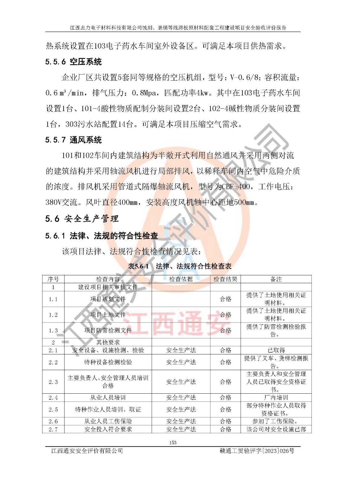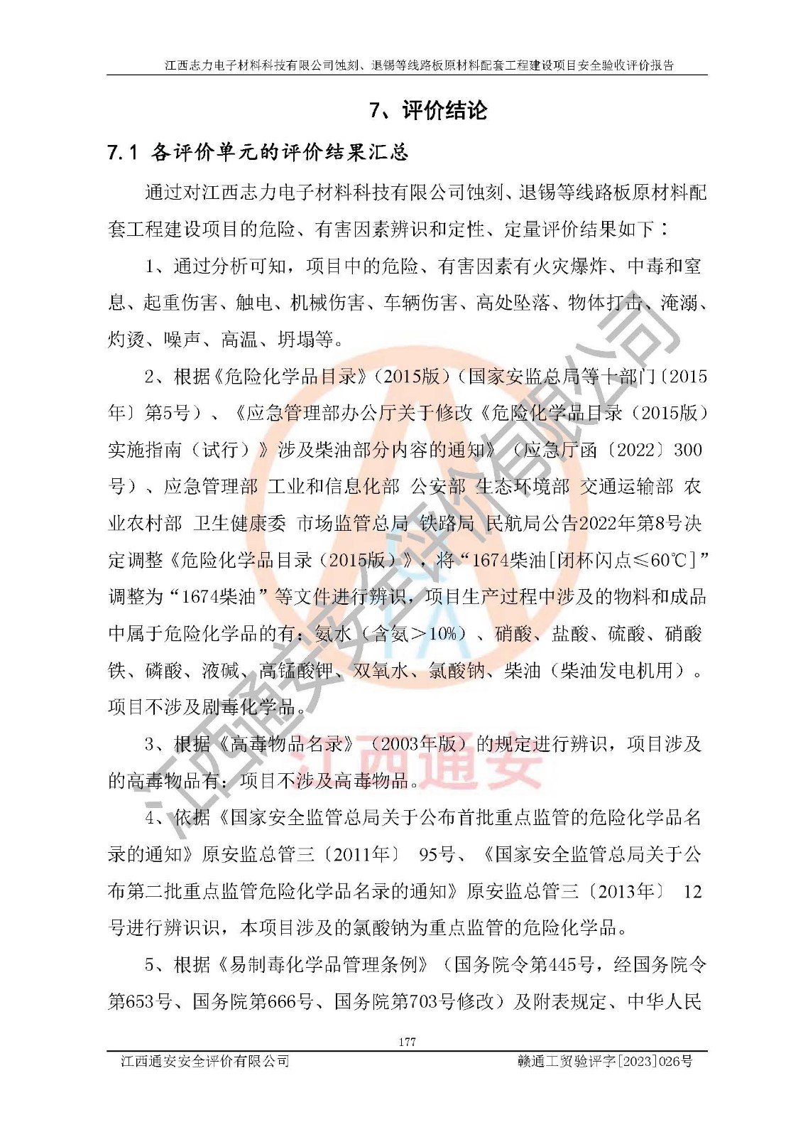 评价结论 | 江西志力电子材料科技有限公司蚀刻、退锡等线路板原材料配套工程建设项目试运行以来相关配套的设备和安全设施运行正常,企业安全管理机制运行正常,安全设施、措施达到设计要求和预期结果,可以满足本项目安全生产的要求,安全管理**,项目具备安全设施竣工验收条件。 | |||