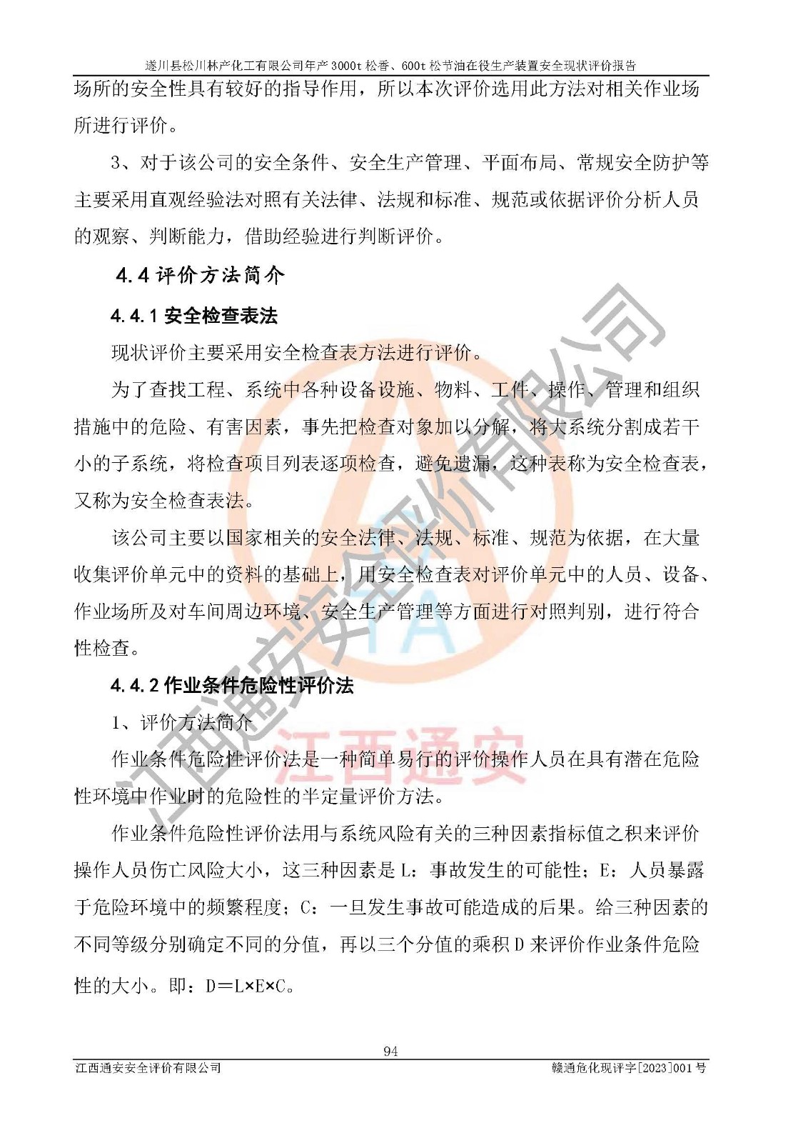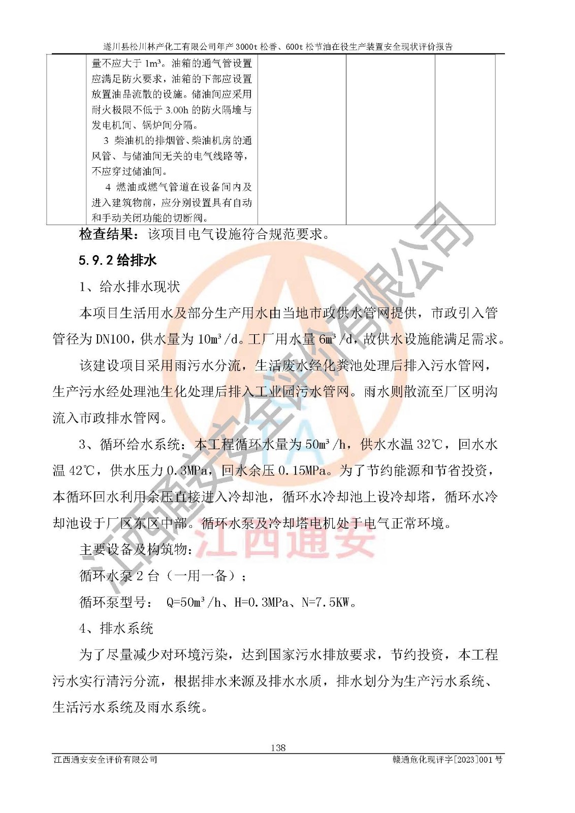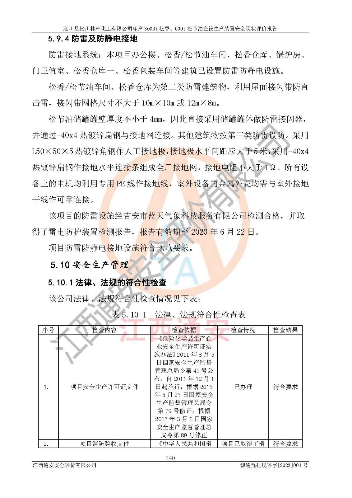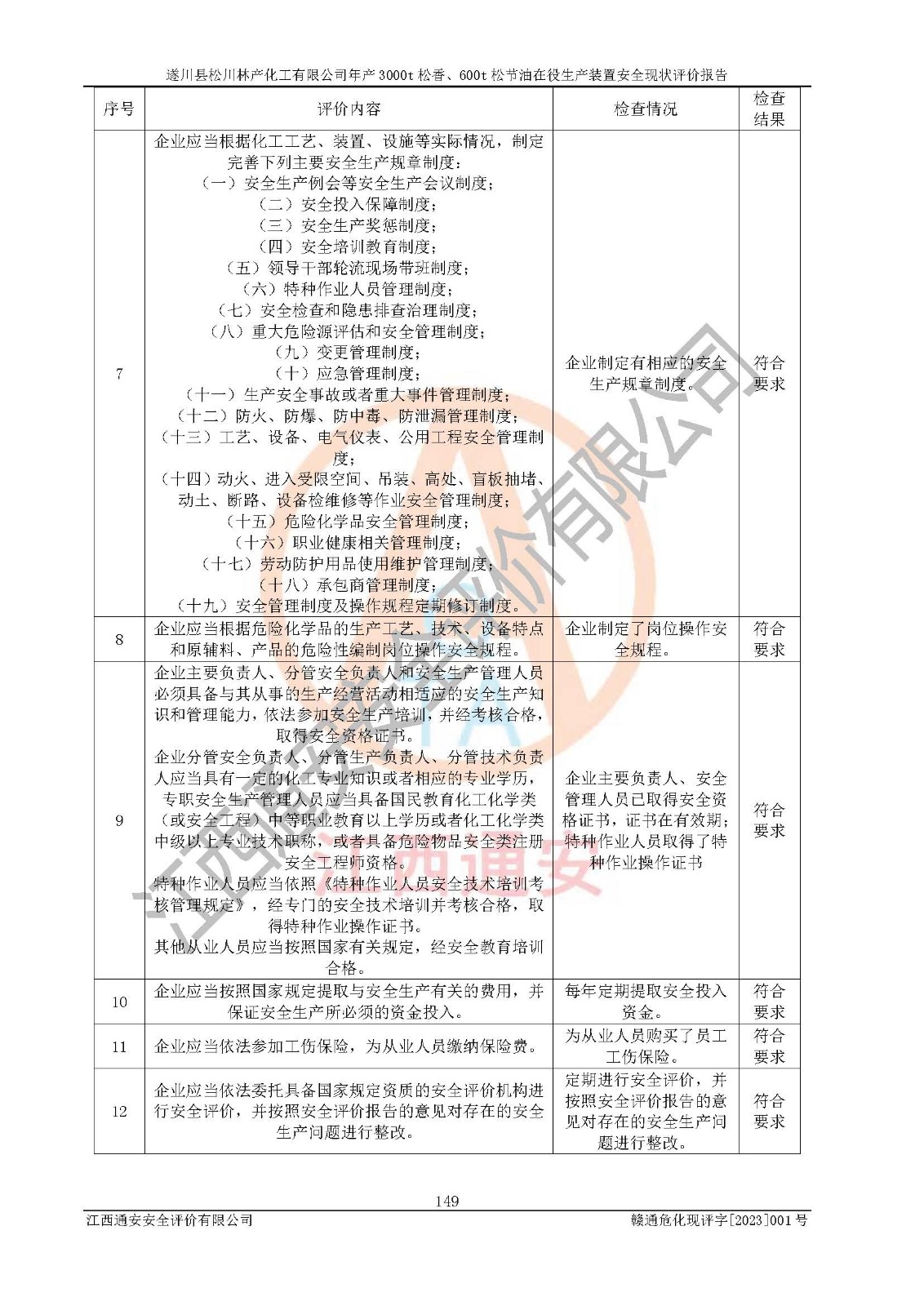评价结论 | 本报告认为,遂川县松川林产化工有限公司年产3000t松香、600t松节油在役生产装置现场情况与设计图纸一致,设置的控制措施和可燃气体检测报警装置设置与设计一致,并且运行良好。有关从业人员资格符合《江西省危险化学品安全专项整治三年行动实施方案》要求,安全设施及安全管理符合**及有关部门关于安全生产法律、法规、标准的要求,安全设施正常投用且运行**,安全风险是可以控制的,其风险程度是可以接受的,安全现状符合安全生产条件,能够满足安全生产的要求。。 | |||