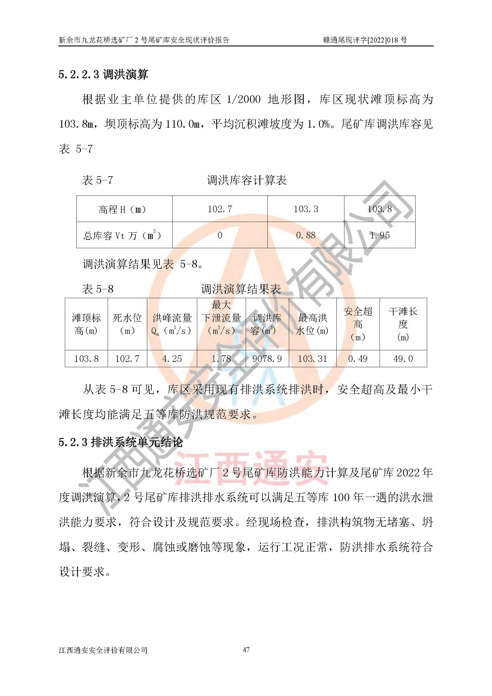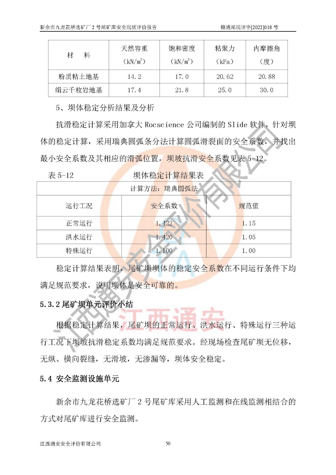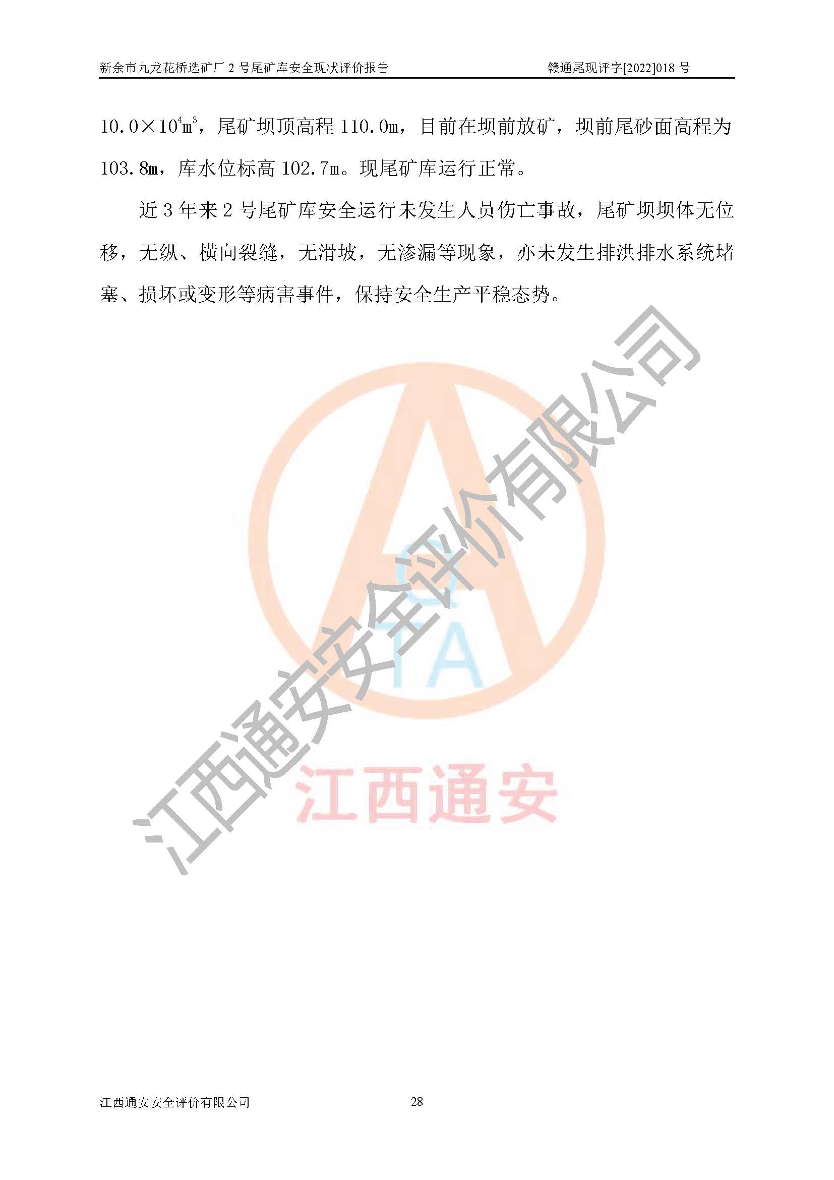 其它 | 按照评价单元划分原则和方法,考虑该尾矿库中危险、有害因素的危害程度以及筑坝工艺,将新余市九龙花桥选矿厂2号尾矿库划分如下评价单元:安全管理、防洪排水、尾矿坝体、安全监测系统、辅助设施及库区环境六个评价单元。 根据该尾矿库危险、有害因素的特征以及安全评价导则的要求,评价报告选用安全检查表分析法、稳定性计算分析法、洪水计算、防洪系统水力计算等评价方法。 评价结论:新余市九龙花桥选矿厂2号尾矿库安全生产条件较好,为正常库,具备继续生产运行的安全生产条件。 | ||||