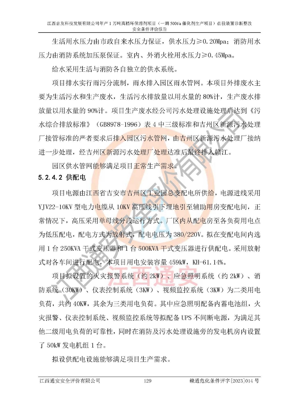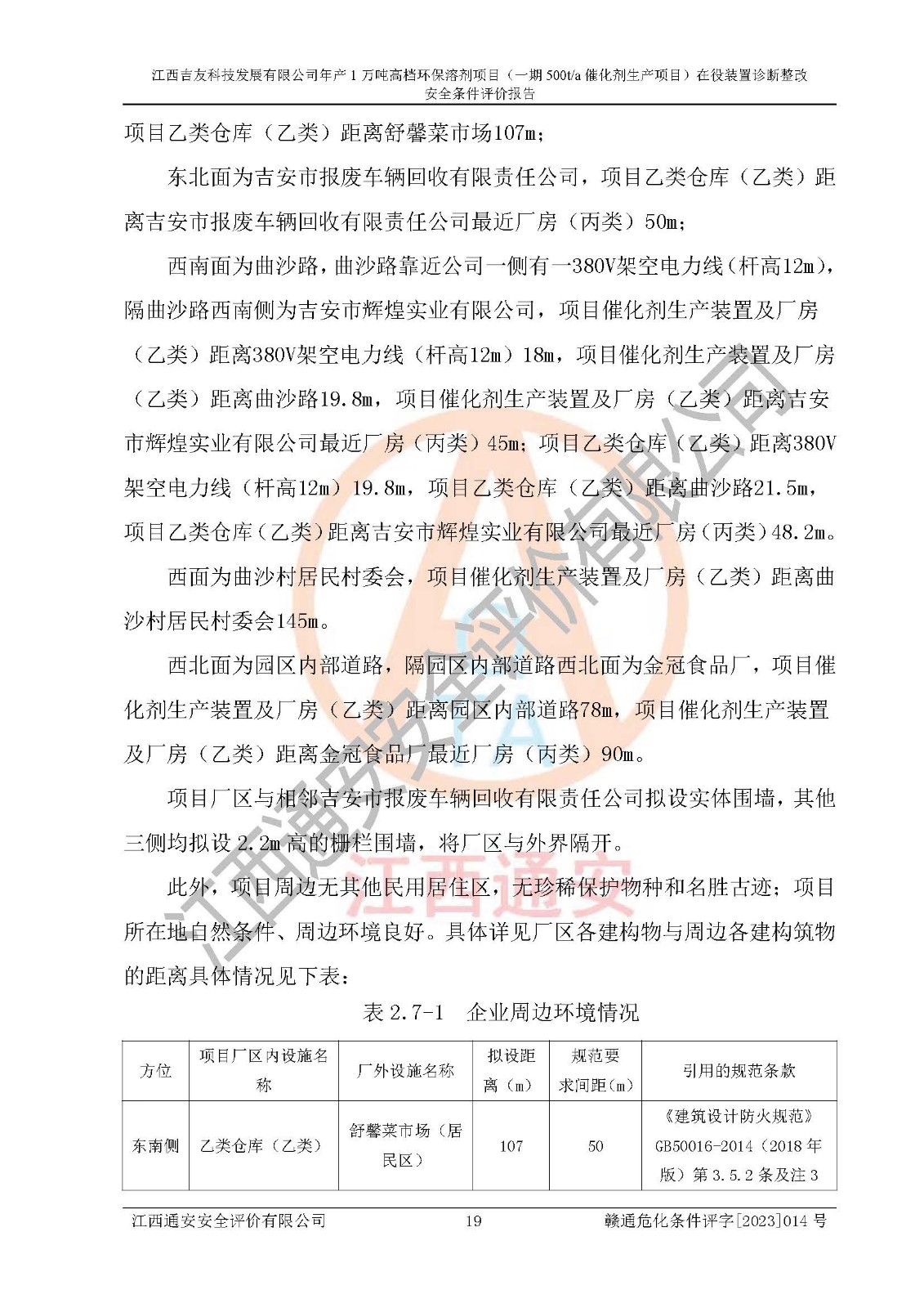 项目简介 | 江西吉友科技发展有限公司成立于2010年3月31日,并取得吉州区行政审批局核准颁发营业执照,营业执照统一社会信用代码:91360802550899823X。公司注册资本:壹仟万元整,公司类型属:有限责任公司(自然人投资或控股),法定**人:张秀敏。公司注册地址:江西省吉安市吉州区工业园。营业执照核准经营范围:化工产品(不含化学危险品及剧毒品)研发、生产、销售及技术咨询与**;自有房屋租赁。(以上项目未取得**许可证不得经营)。 2010年9月18日江西吉友科技发展有限公司取得吉安市吉州区工业园本期项目用地的建设用地规划许可证(证号:地字第2010-014号),拟在该地块投资6000万元建设年产1万吨高端**溶剂项目。 江西吉友科技发展有限公司于2010年4月16日取得吉安市吉州区发展和改革委员会《关于江西吉友科技发展有限公司年产1万吨高档**溶剂项目核准的批复》(吉区发改字〔2010〕33号)。 根据《国民经济行业分类》GB/T 4754-2017、《国民经济行业分类》**标准**号修改单GB/T 4754-2017/XG1-2019,项目属于化学试剂和助剂制造〔C2661〕。 《江西吉友科技发展有限公司1万吨/年高档**溶剂工厂设立安全评价报告》于2011年1月4日取得江西省安全生产监督管理局《危险化学品建设项目安全许可意见书》(赣安监危化项目审字〔2011〕515号)。 《江西吉友科技发展有限公司1万吨/年高档**溶剂工厂安全设施设计专篇》于2013年7月2日取得江西省安全生产监督管理局《危险化学品建设项目安全许可意见书》(赣安监危化项目审字〔2011〕760号)。 由于工业园整体规划调整和企业根据安全生产考虑,年产1万吨高档**溶剂项目取消了危险性大的溶剂生产部分,只保留500t/a催化剂生产项目。 江西吉友科技发展有限公司于2015年1月4日组织专家组对500t/a催化剂生产线建设项目一期工程进行了安全验收。 2022年12月北京慎恒工程设计有限公司出具的《江西吉友科技发展有限公司500t/a催化剂生产项目(一期)安全设计诊断》,诊断出企业存在部分设备及原辅料使用情况与原设计不相符,产品方案未*出原设计范围。吉州区应急管理局通过对企业现场核实,下发了《安全生产行政执法文书行政处罚决定书》((吉州)应急罚〔2023〕7号),并要求企业补充“三同时”手续。 依据《江西省安全生产条例》、《建设项目安全设施“三同时”监督管理办法》、北京慎恒工程设计有限公司2022年12月出具的《江西吉友科技发展有限公司500t/a催化剂生产项目(一期)安全设计诊断》、吉州区应急管理局出具的《安全生产行政执法文书行政处罚决定书》((吉州)应急罚〔2023〕7号)、吉安市吉州区发展和改革委员会2010年4月16日出具的《关于江西吉友科技发展有限公司年产1万吨高档**溶剂项目核准的批复》(吉区发改字〔2010〕33号)等文件,现对江西吉友科技发展有限公司年产1万吨高档**溶剂项目(一期500t/a催化剂生产项目)在役装置诊断整改进行安全条件评价,以便于工程项目的安全设施与主体工程同时设计、同时施工、同时投入生产和使用,有利于工程项目在安全生产方面符合**及地方、行业有关安全生产法律、法规和标准、规章规范的要求。 项目涉及到的危险化学品有:氯铂酸、硝酸铜、硝酸铝、硝酸镧、硝酸锰、硝酸铁、硝酸、硝酸镍、硝酸锌、盐酸、硫酸、磷酸、硫酸镍、硫酸钴、氯化铜、氯化铝、氯化镍、氯化锌、氯化铁、氯化钴、柴油、氢氧化钠、氢氧化钾、氢氧化锂、四乙基氢氧化铵、氮气(压缩的)等,产品催化剂均不属于危险化学品。其中硫酸、盐酸属于易制毒危险化学品;硝酸、硝酸镍、硝酸锌属于易制爆化学品。 项目不涉及重点监管的危险化工工艺。 项目各生产和储存单元均未构成危险化学品重大危险源。 | |||