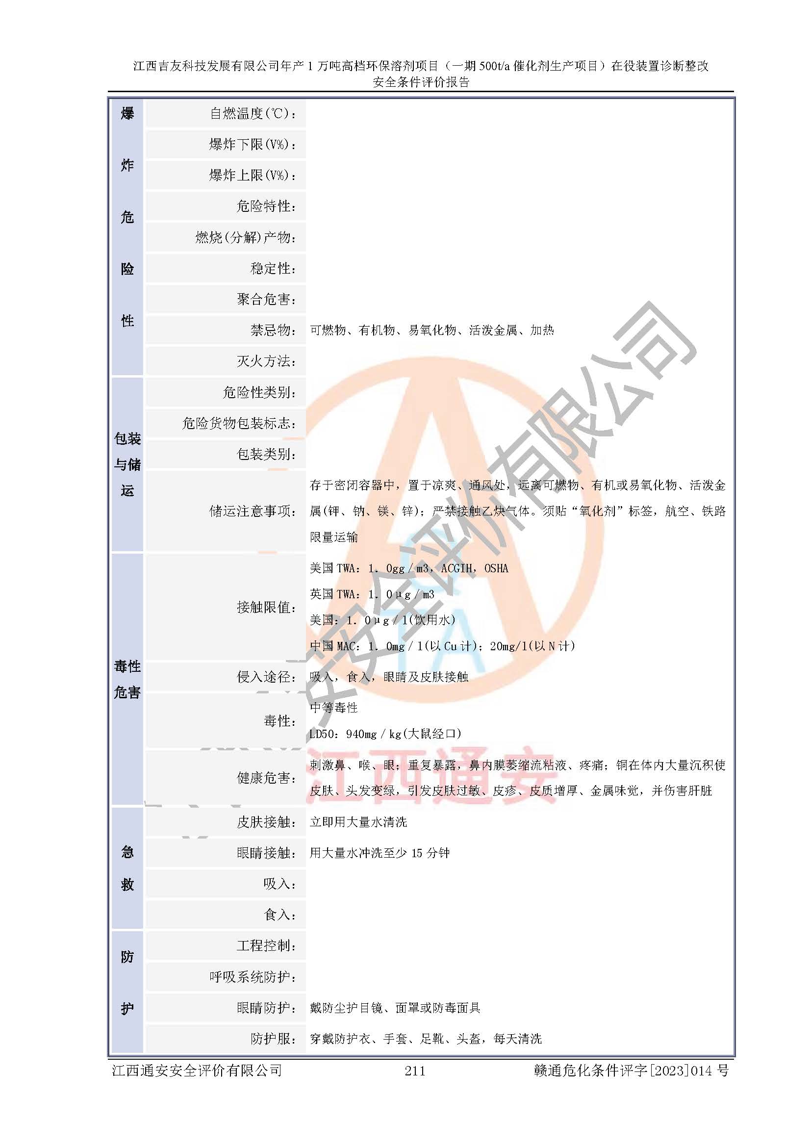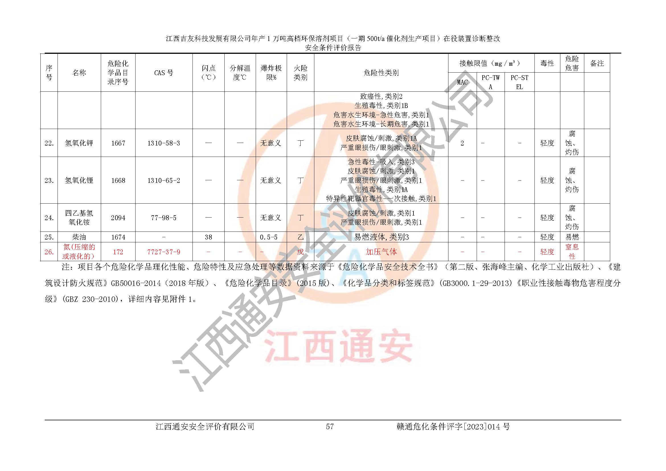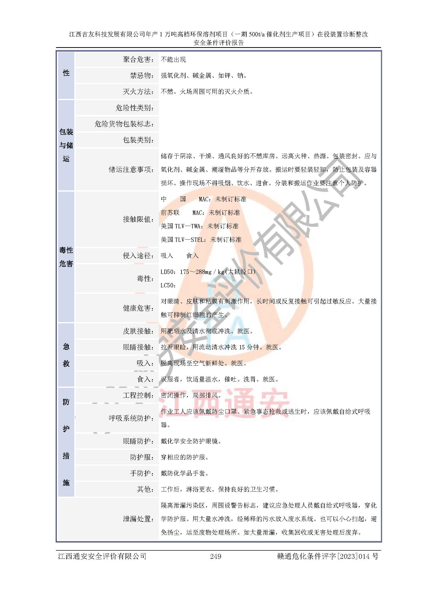 评价结论 | 江西吉友科技发展有限公司年产1万吨高档**溶剂项目(一期500t/a催化剂生产项目)在役装置诊断整改在以后的安全设施设计、施工图设计和建设施工、安装调试及生产运行中,如能严格执行**有关安全生产法律、法规和有关标准、规范,认真采纳本报告书中安全对策措施及建议,真正做到安全设施与主体工程同时设计、同时施工、同时投入生产和使用的“三同时”,工程的危险、有害因素可得到**控制,风险在可接受范围内,具有**的本质安全水平。该建设项目从安全方面分析可行。 | |||