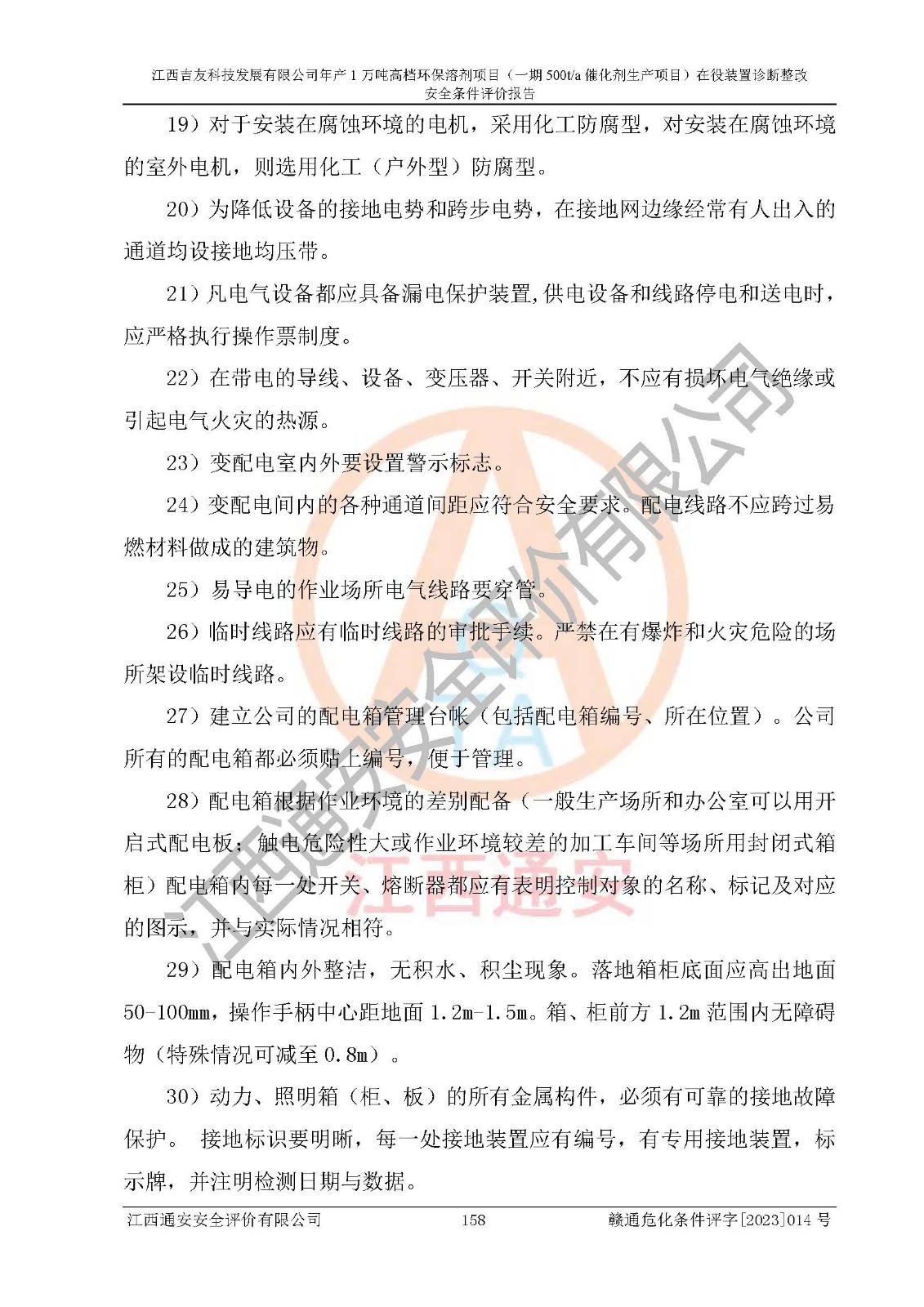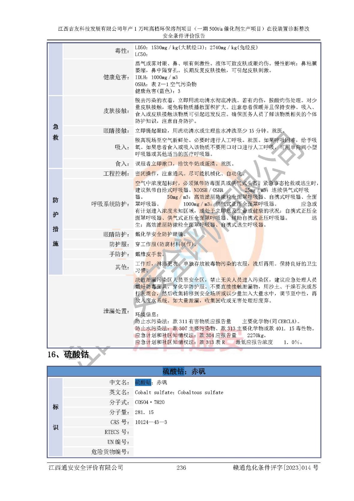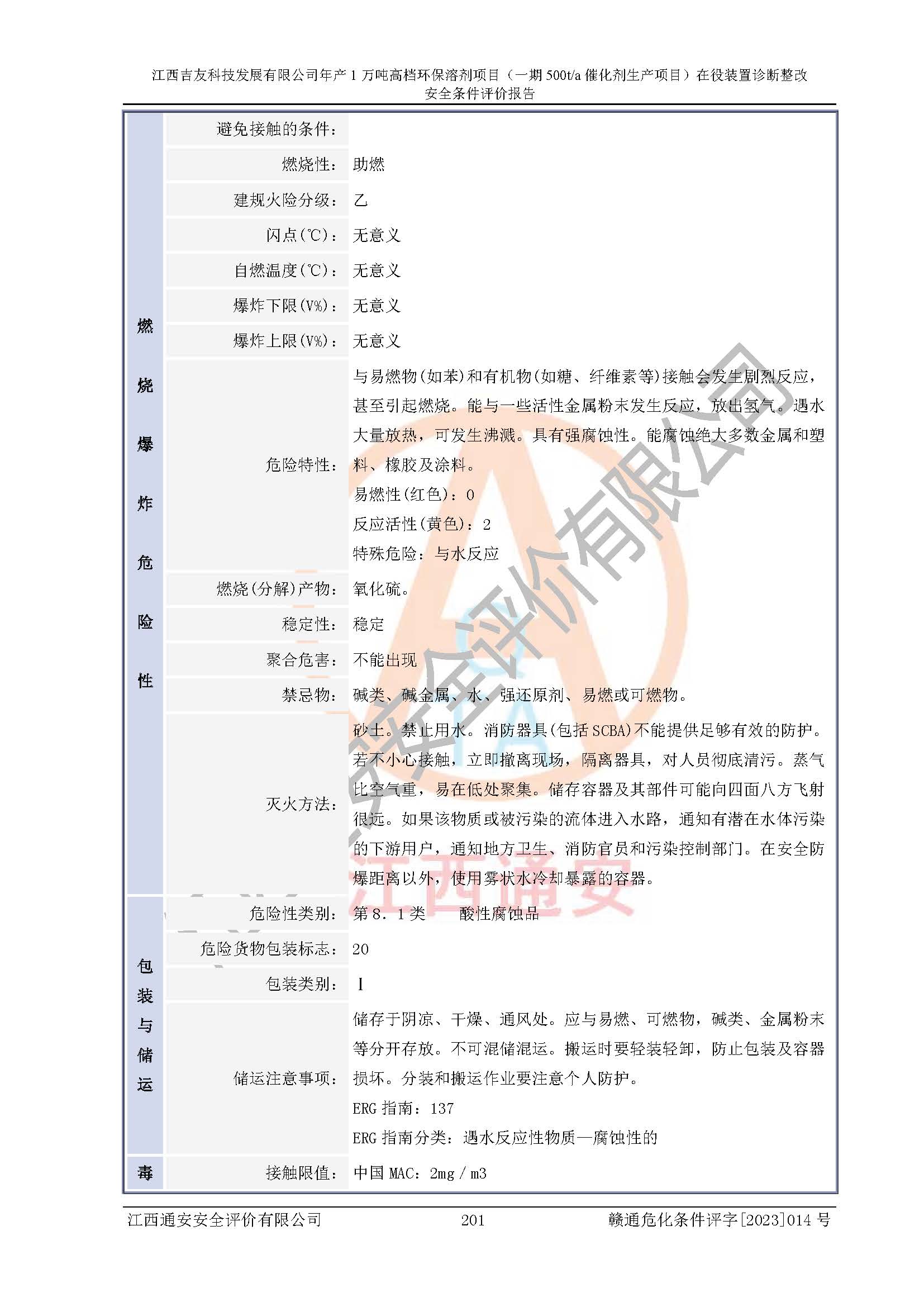 评价结论 | 江西吉友科技发展有限公司年产1万吨高档**溶剂项目(一期500t/a催化剂生产项目)在役装置诊断整改在以后的安全设施设计、施工图设计和建设施工、安装调试及生产运行中,如能严格执行**有关安全生产法律、法规和有关标准、规范,认真采纳本报告书中安全对策措施及建议,真正做到安全设施与主体工程同时设计、同时施工、同时投入生产和使用的“三同时”,工程的危险、有害因素可得到**控制,风险在可接受范围内,具有**的本质安全水平。该建设项目从安全方面分析可行。 | |||
