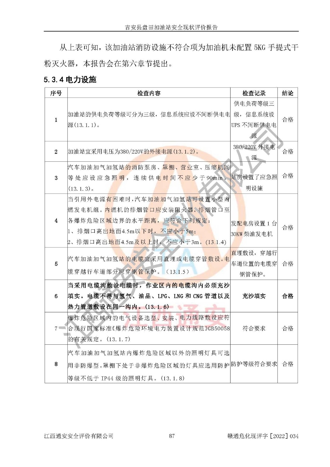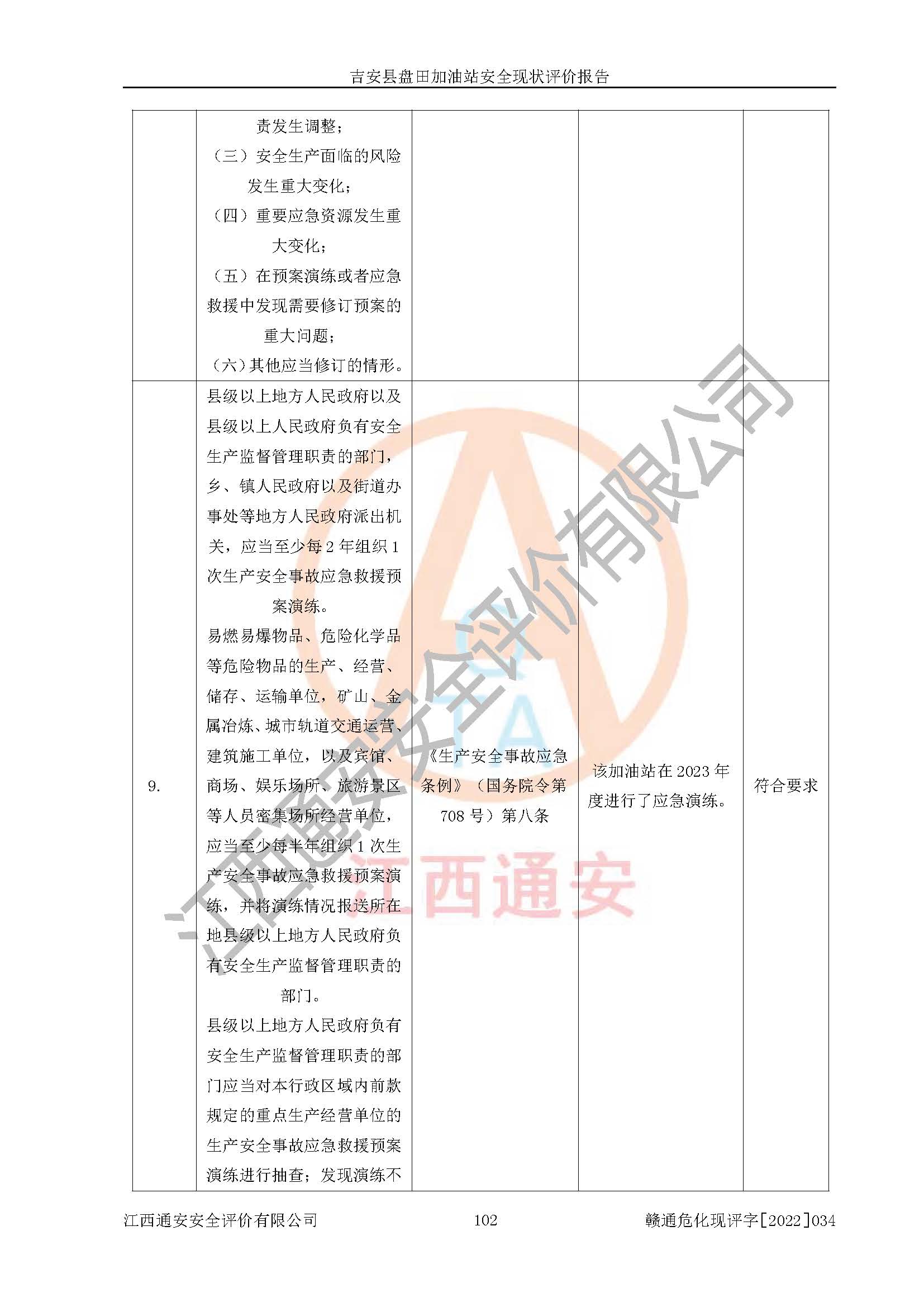 评价结论 | 吉安县盘田加油站站址合理,周边环境良好,与敏感防护目标间距符合规范要求,站区建构筑物之间的防火间距、耐火等级符合标准要求,与总平面布置图一致,加油卸油工艺及设备设施合理,工艺布置得当,防雷设施经检测合格,采取的工艺安全设施符合规范要求;该加油站制定了安全管理制度和操作规程,人员经培训合格后上岗,安全管理人员经考核合格并取得安全合格证,能按照法律法规要求开展安全生产管理工作。 综上:吉安县盘田加油站符合《汽车加油加气加氢站技术标准》GB50156-2021等标准规范的要求,安全风险可控,满足危险化学品经营的安全条件。 | |||