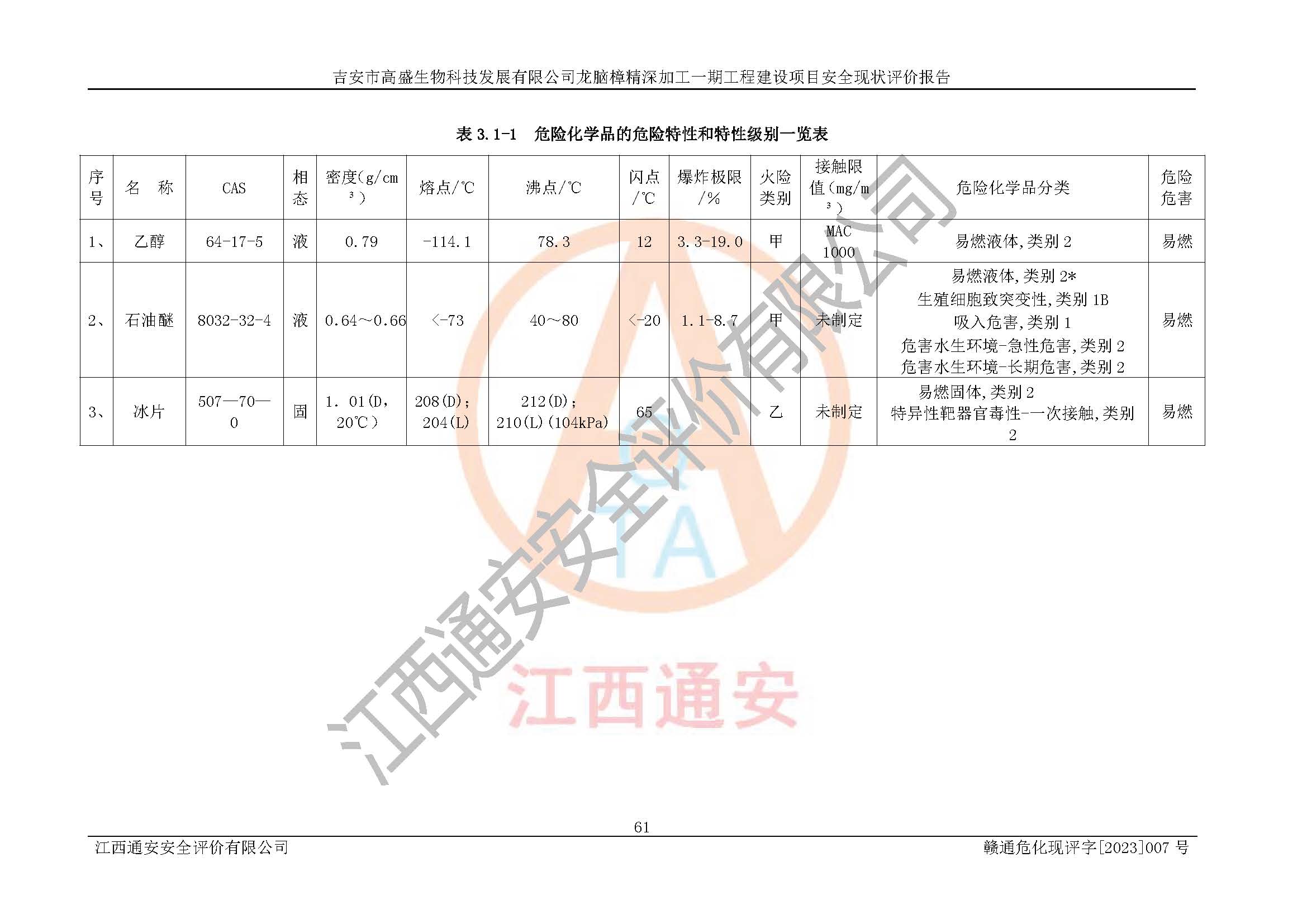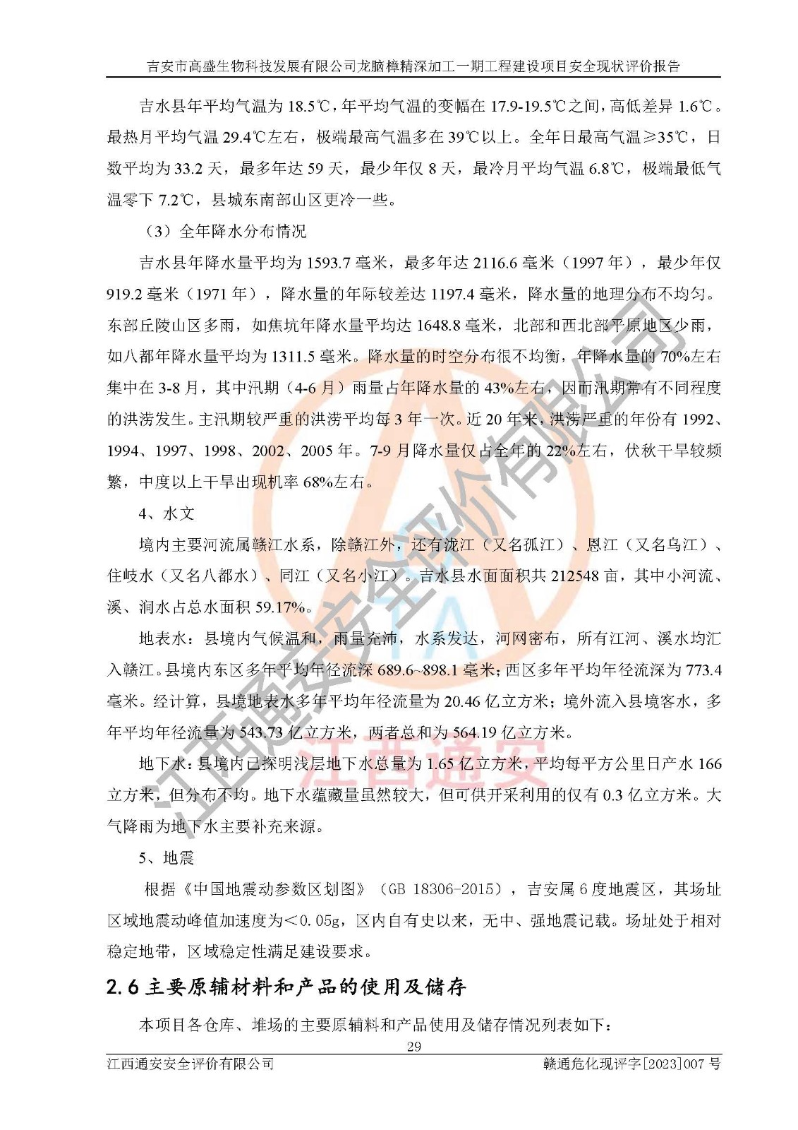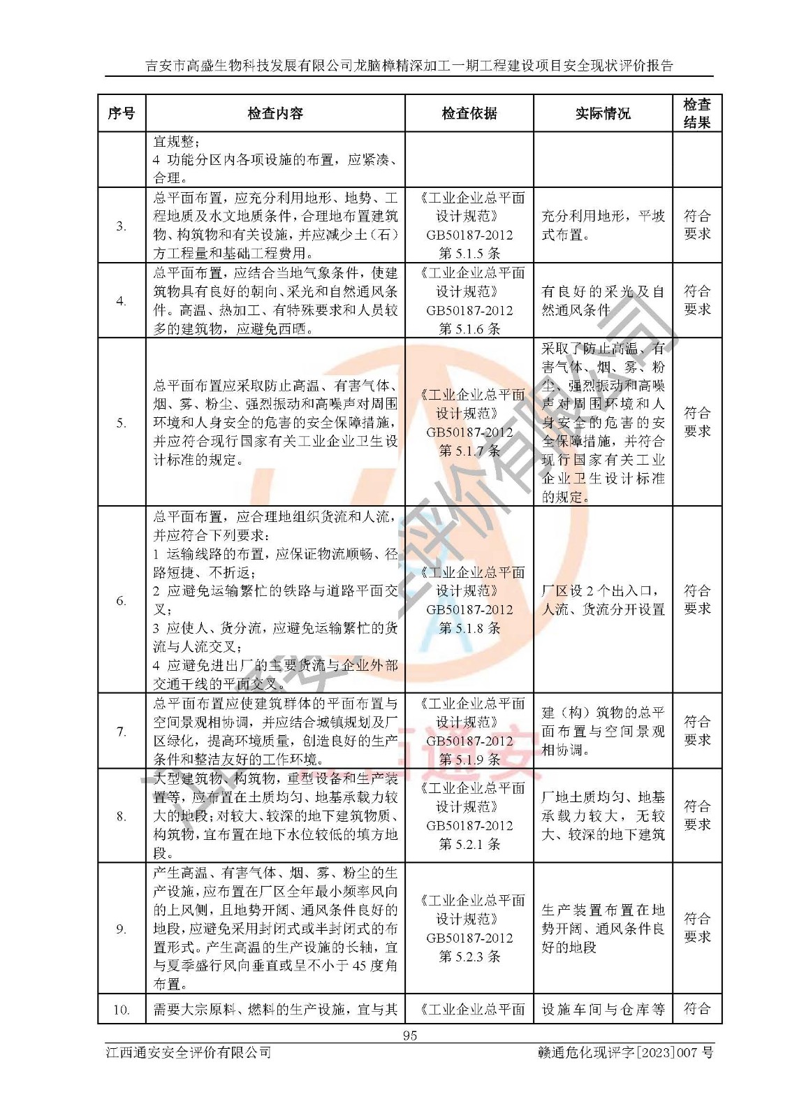 评价结论 | 本报告认为,本报告认为,吉安市高盛生物科技发展有限公司龙脑樟精深加工一期工程建设项目在役生产装置现场情况与设计图纸一致,有关从业人员资质符合《江西省危险化学品安全专项整治三年行动实施方案》要求,安全设施及安全管理符合**及有关部门关于安全生产法律、法规、标准的要求,安全风险是可以控制的,其风险程度是可以接受的,安全现状符合安全生产条件,能够满足安全生产的要求。 | ||||