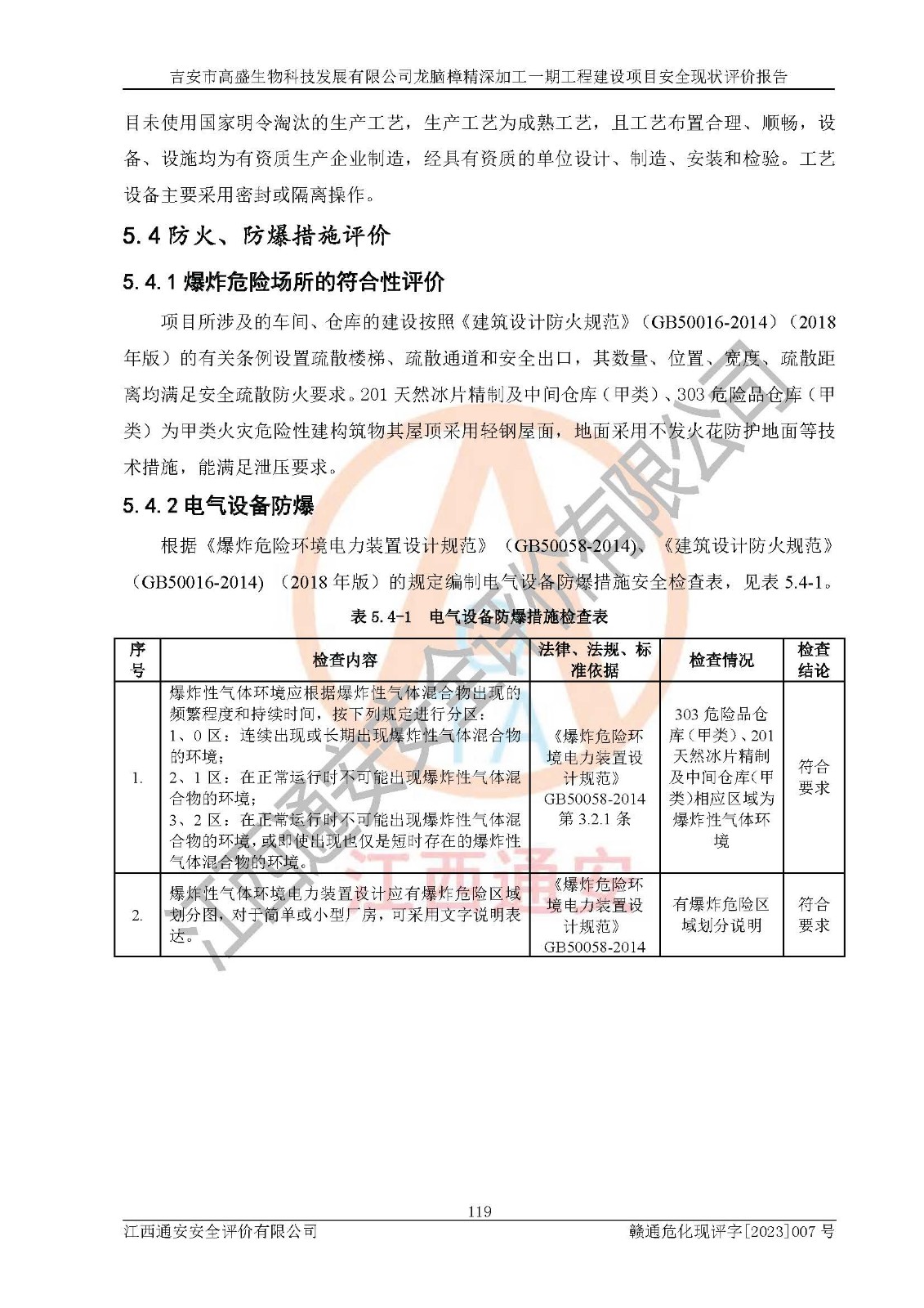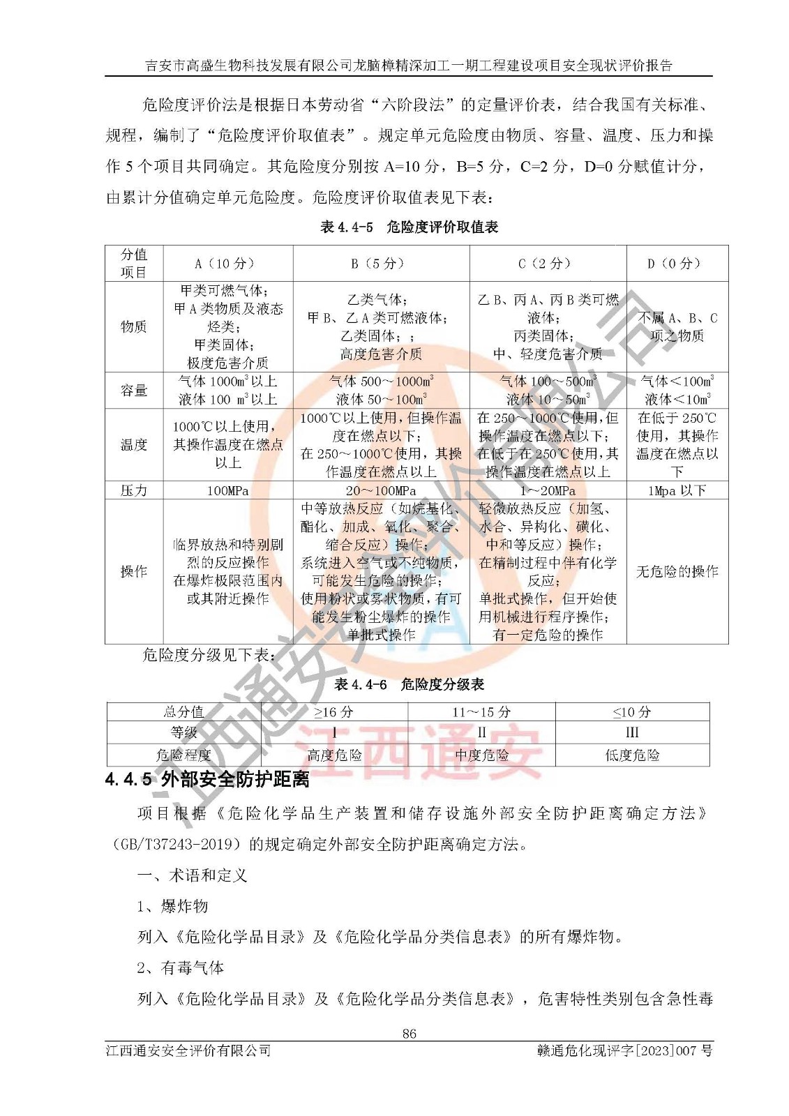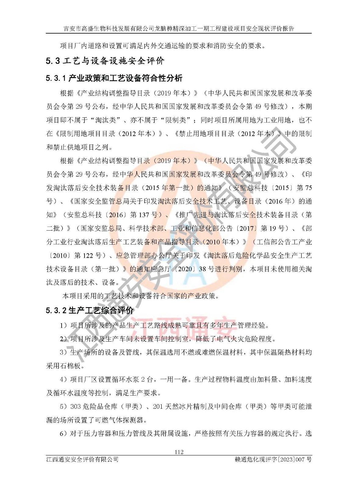 评价结论 | 本报告认为,本报告认为,吉安市高盛生物科技发展有限公司龙脑樟精深加工一期工程建设项目在役生产装置现场情况与设计图纸一致,有关从业人员资质符合《江西省危险化学品安全专项整治三年行动实施方案》要求,安全设施及安全管理符合**及有关部门关于安全生产法律、法规、标准的要求,安全风险是可以控制的,其风险程度是可以接受的,安全现状符合安全生产条件,能够满足安全生产的要求。 | ||||