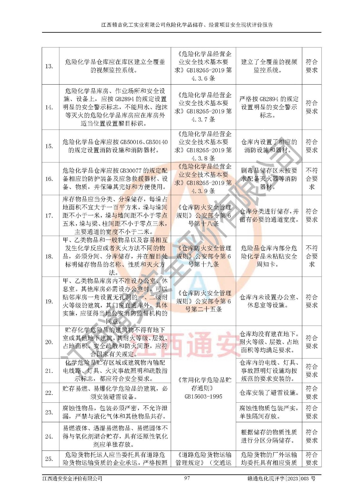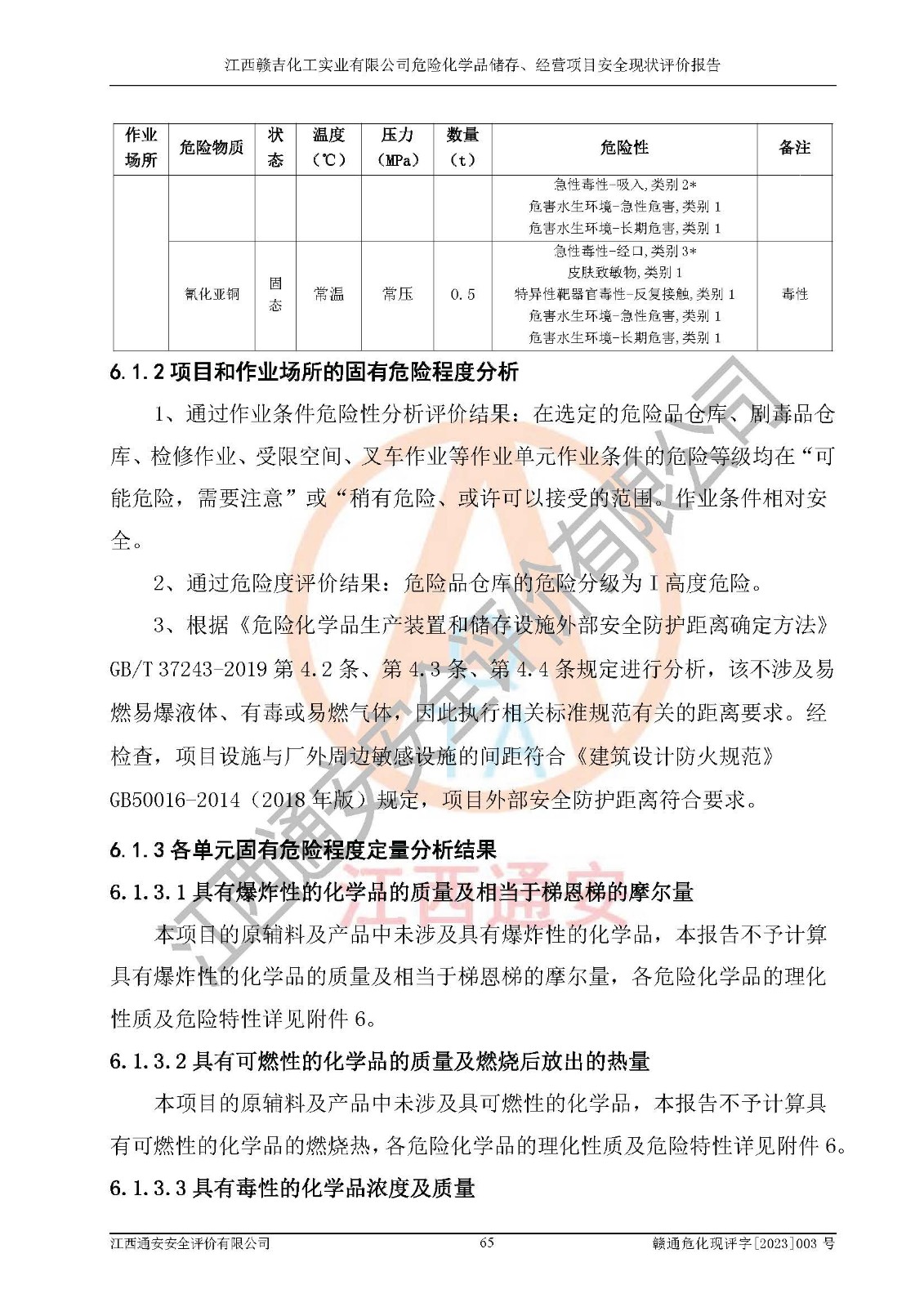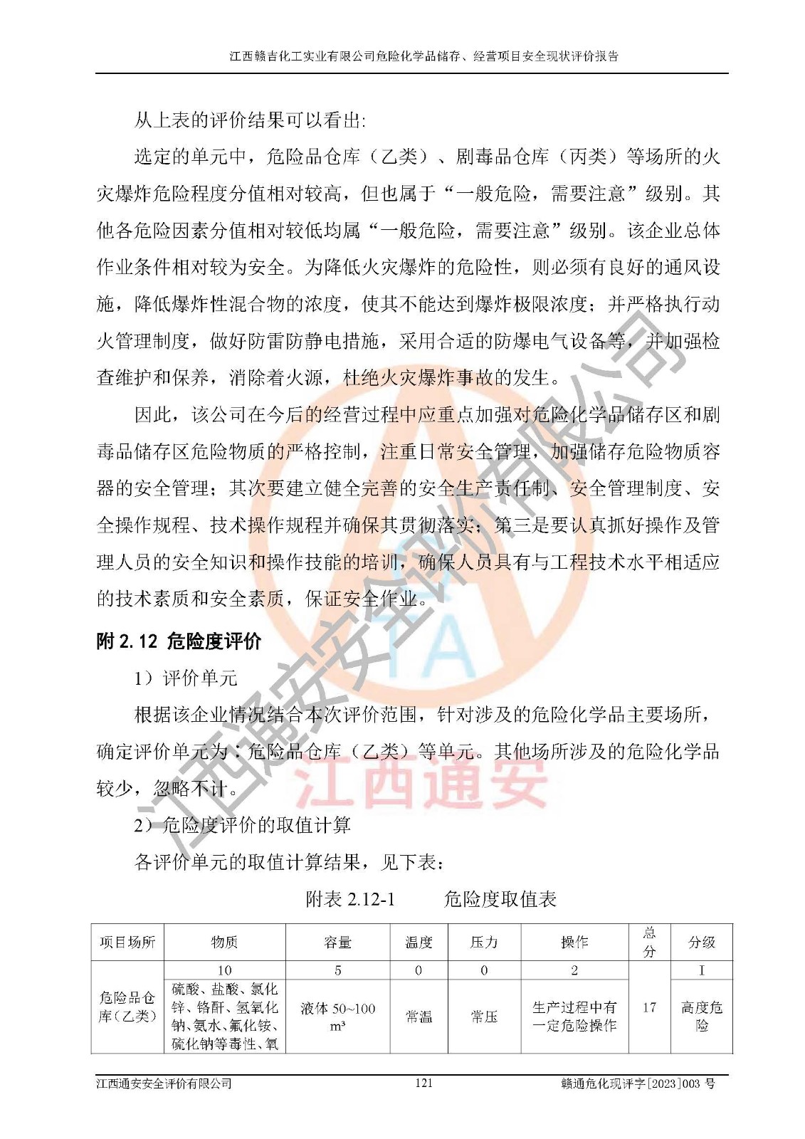 评价结论 | 江西赣吉化工实业有限公司危险化学品储存、经营项目的安全设施及安全管理符合**及有关部门关于安全生产法律、法规、标准的要求,安全风险是受控制的,其风险程度是可以接受的,符合安全生产条件,可以满足该企业危险化学品储存和经营的要求,该企业安全现状能够符合安全经营条件。 | |||