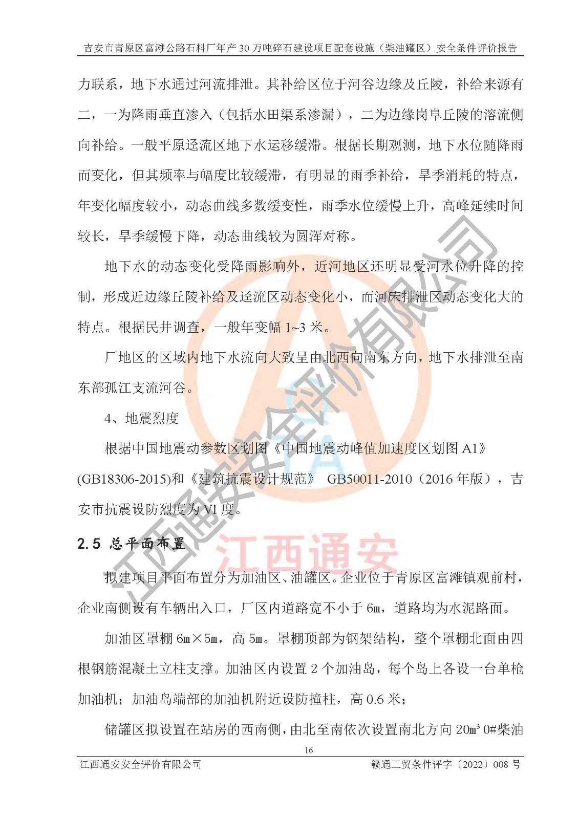 评价结论 | 1、吉安市青原区富滩公路石料厂已按照《中华人民共和国安全生产法(中华人民共和国主席令第七十号颁布〔2002〕;主席令第十八号修正〔2009〕; 主席令第十三号修正〔2014〕;主席令第八十八号修正〔2021〕》和《建设项目安全设施“三同时”监督管理办法》(原**安监总局令第36号,2015年77号令修改)的要求进行安全条件评价,符合**和省关于危险化学品建设项目安全生产的要求。 2、吉安市青原区富滩公路石料厂总平面布置符合《汽车加油加气加氢站技术标准》GB50156-2021等的要求。企业在项目建设和运行阶段,总平面布置设计、施工图设计和建设施工、安装调试及生产运行中,应严格执行**有关安全生产法律、法规和有关标准、规范,将本报告书中提出的安全对策措施落实到位,真正做到安全设施与主体工程同时设计、同时施工、同时投入生产和使用,项目建成后危险、有害因素可以得到**控制,安全风险在可接受范围,拟建的吉安市青原区富滩公路石料厂年产30万吨碎石建设项目配套设施(柴油罐区)符合法律法规、标准、规章和规范的要求。 | |||