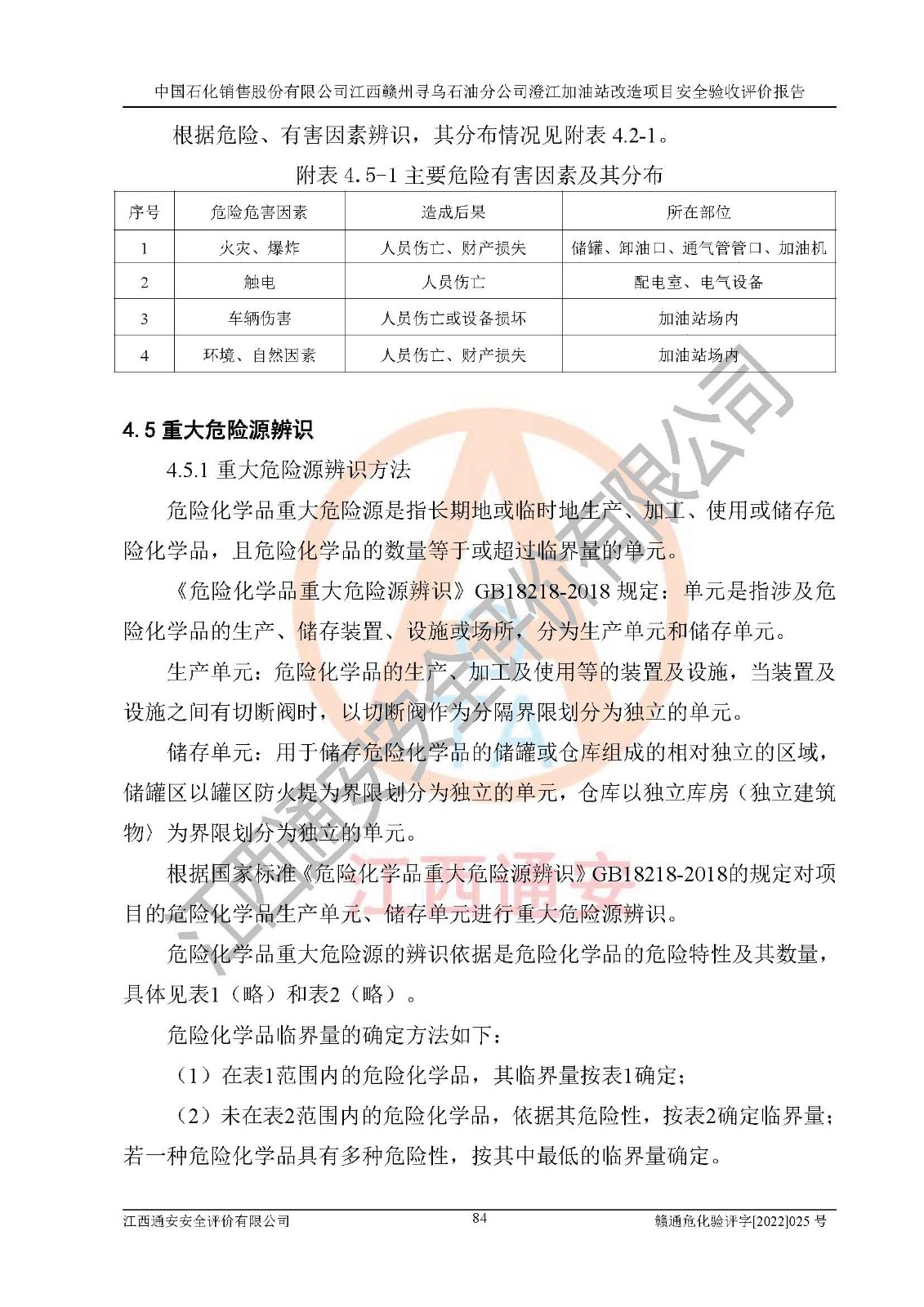 项目简介 | 本报告为中国石化销售股份有限公司江西赣州寻乌石油分公司澄江加油站改造项目(以下简称澄江加油站)的安全验收评价报告。澄江加油站位于寻乌县澄江镇澄江圩,是从事成品油储存经营的外商投资企业分公司。本站为加油站改造项目,已通过寻乌县行政审批局进行立项备案(项目统一代码为:2204-360734-07-02-580440)。澄江加油站于2019年7月4日取得危险化学品经营许可证,2019年12月31日取得成品油零售经营批准证书。 改造后罐区设置有四个30m³油罐,分别为两个92#汽油罐、一个95#汽油罐和一个30m³0#柴油罐,油罐容量为120m³,折合油罐总容积为105m³,属二级加油站。 汽油和柴油均是化学品液体。汽油、柴油均为危险化学品,其中汽油火险分级为甲B类,其蒸汽与空气形成爆炸性气体,遇明火、高热易燃烧爆炸;柴油火险分级为丙A类,遇明火、高热或与氧化剂接触,有引起燃烧爆炸的危险。 | ||||