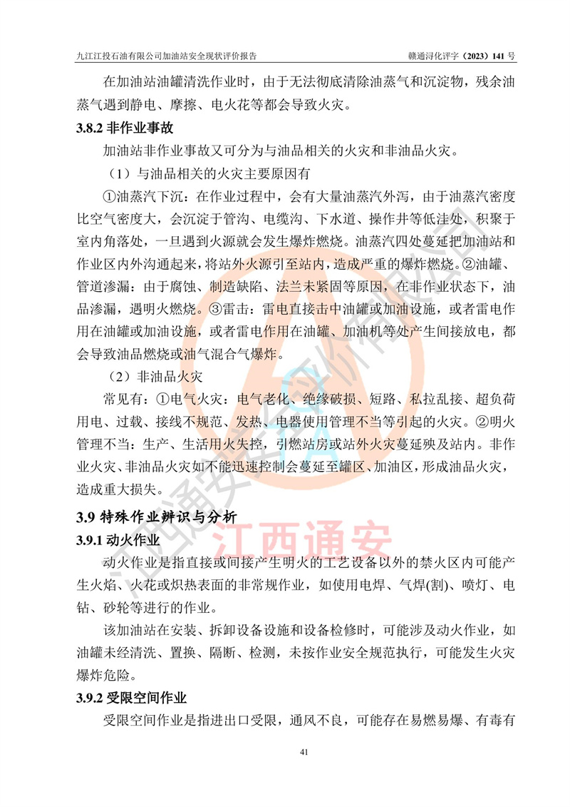 项目简介 | 九江江投石油有限公司加油站,经营场所位于江西省九江市浔阳区城东工业基地3号园B-5地块(浔阳区滨江东路186-26号)。现有从业人员13名,其中安全管理人员2人,加油站负责人汪翔。 该加油站占地面积2960.07m2,站区内设置有2台双枪税控燃油加油机、1台四枪加油机及配套的工艺管线,设有SF双层储罐4台,其中30m3的92#汽油储罐1台、30m3的95#汽油储罐1台、30m3的0#柴油储罐2台,油品储罐总容积为120m3(折算成汽油为90m3),按现行《汽车加油加气加氢站技术标准》对加油站的等级划分原则,属三级加油站。 该站在经营成品油过程中涉及的主要物料为汽油和柴油,按**十部、局联合公告[2022]第8号公告修改公布的《危险化学品目录》,汽油和柴油属于危险化学品。根据**安全监管总局安监总管三〔2011〕95号文件公布《首批重点监管的危险化学品名录》和应急管理部等4部公告第3号《特别管控危险化学品目录(**版)》,汽油属于**重点监管和特别管控的危险化学品。 该站由九江市行政审批局换发《危险化学品经营许可证》(证号:赣九危化经字[2021]000375号),**期限2021年01月19日至2024年01月18日。根据《危险化学品经营许可证管理办法》(**安监总局第55号令,第79号令修改)的要求,危险化学品经营许可证的**期为3年。**期满后,企业需要继续从事危险化学品经营活动的,应当在危险化学品经营许可证**期满3个月前,向发证机关提出危险化学品经营许可证的延期申请,申请证照延期的所有储存、经营危险化学品的单位,应当提供安全评价报告。九江江投石油有限公司加油站目前正在做危险化学品经营许可证延期换证的准备工作,故委托江西通安安全评价有限公司承担其加油站经营成品油安全条件现状评价工作。 江西通安安全评价有限公司接受委托后,组织了评价组对该加油站进行了现场踏勘,对加油站零售经营成品油的设施、设备、装置实际运行状况及管理状况进行了实地调查、分析,检查该站是否符合《危险化学品安全管理条例》、《危险化学品经营许可证管理办法》中规定的经营单位应具备的基本条件。从安全管理角度检查和评价该站对安全法规的执行情况,从安全技术角度检查项目中安全设施是否符合**有关安全生产的法律、法规和标准。评价组运用安全系统工程的方法,进行危险、有害因素的识别及其危险度的评价,查找该系统生产运行中存在的事故隐患并判定其危险程度,提出合理可行的安全对策措施及建议,在此基础上,根据加油站加油作业工艺程序、站区内功能区域特点,划分了评价单元;对划分的评价单元及单元内的危险、有害因素选择了相应的安全评价方法逐项进行分析、评价,提出相应的预防和控制对策措施;在此基础上完成了安全评价报告初稿,经评价公司内部五级审核程序,及加油站现场存在的安全隐患**落实整改后出具《九江江投石油有限公司加油站安全现状评价报告》,以作为该企业申请《危险化学品经营许可证》延期的安全技术依据。 本次安全评价范围,九江江投石油有限公司加油站的主体装置和辅助设施(含新增一台充电桩),包括经营过程中的危险有害因素控制措施和工艺、设备设施的安全可靠性和安全方面管理的组织、机构、人员、防护设施、作业环境及管理制度等安全经营条件的符合性评价。 评价报告中涉及环境保护、消防及职业卫生等方面的内容,应以其主管部门审核意见为准;自然灾害方面和成品油购进时的运输不包括在本评价范围内,本报告只对涉及部分做一般性评述。 | ||||||