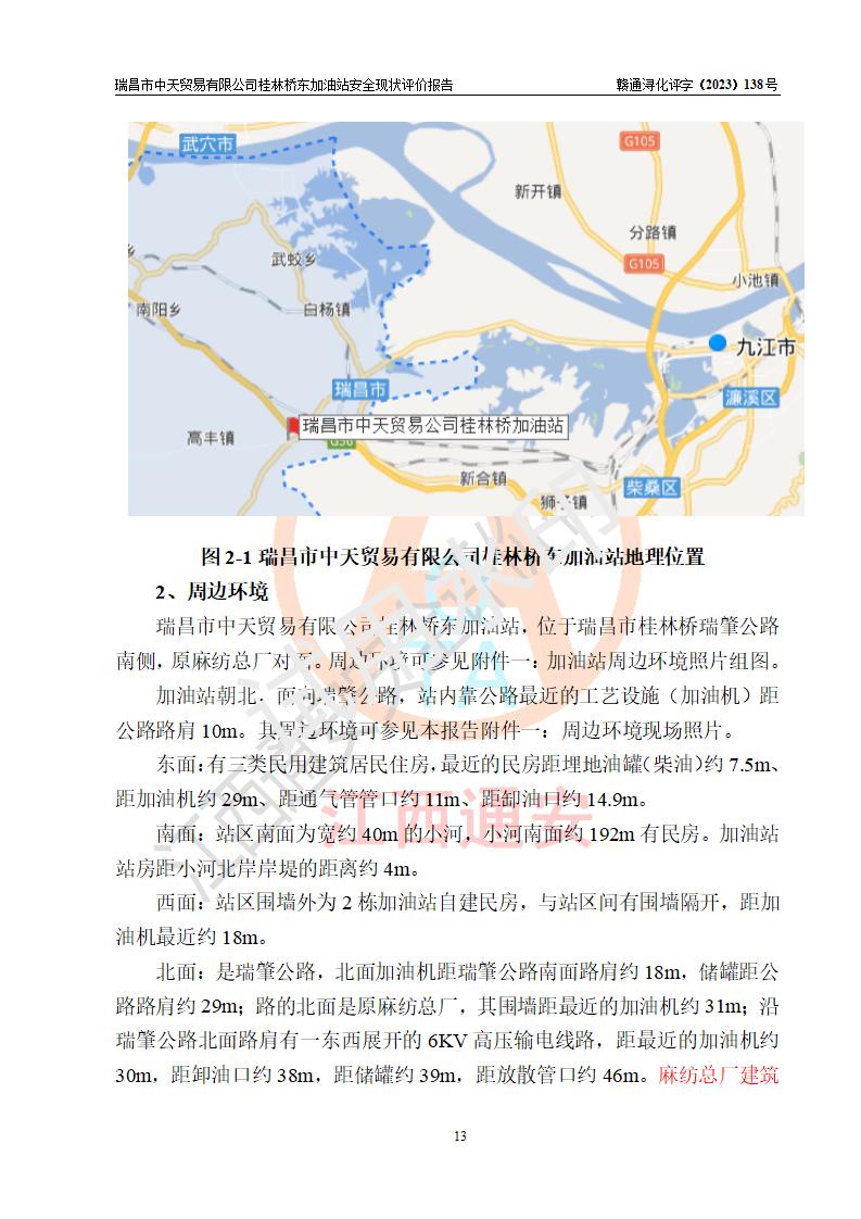 瑞昌市中天贸易有限公司桂林桥东加油站是一家专门从事成品油(汽油、柴油)、润滑油零售,预包装食品兼散装食品、卷烟(凭许可证)、日用品、液化气钢瓶、灶具及配件零售,汽车清洗服务的有限责任公司分公司,注册地址为江西省九江市瑞昌市瑞肇公路南侧。加油站现有从业人员6名,其中安全管理人员1人,加油站负责人刘凯(经营者),加油站危险化学品经营单位主要负责人丁洞仙(加油站站长)。 该加油站站区占地面积3330.8m2(约5亩)。站区内设置有1台双枪单油品潜油泵程控燃油加油机和3台双枪单油品自吸式程控燃油加油机及配套的工艺管线,25m3的95#汽油卧式双层储罐1台,25m3的92#汽油汽油卧式双层储罐2台,30m3的0#卧式柴油储罐1台,油品储罐总容积为105m3(折算为汽油为90m3),按现行《汽车加油加气加氢站技术标准》对加油站的等级划分原则,该站属三级加油站。 该站在经营成品油过程中涉及的主要物料为汽油和柴油,按**十部、局联合公告〔2022〕第8号公告修改公布的《危险化学品目录》,汽油和柴油属于危险化学品。根据**安全监管总局安监总管三〔2011〕95号文件公布《首批重点监管的危险化学品名录》和应急管理部等4部公告第3号《特别管控危险化学品目录(**版)》,汽油属于**重点监管和特别管控的危险化学品。 该站由九江市应急管理局换发了《危险化学品经营许可证》(证号:赣九危化经字〔2020〕000376号),**期限2021年01月23日至2024年01月22日。根据《危险化学品经营许可证管理办法》(**安监总局第55号令,第79号令修改)的要求,危险化学品经营许可证的**期为3年。**期满后,企业需要继续从事危险化学品经营活动的,应当在危险化学品经营许可证**期满3个月前,向发证机关提出危险化学品经营许可证的延期申请,申请证照延期的所有储存、经营危险化学品的单位,应当提供安全评价报告。瑞昌市中天贸易有限公司桂林桥东加油站目前正在做危险化学品经营许可证延期换证的准备工作,故委托江西通安安全评价有限公司承担其加油站经营成品油安全条件现状评价工作。 江西通安安全评价有限公司接受委托后,组织了评价组对该加油站进行了现场踏勘,对加油站零售经营成品油的设施、设备、装置实际运行状况及管理状况进行了实地调查、分析,检查该站是否符合《危险化学品安全管理条例》、《危险化学品经营许可证管理办法》中规定的经营单位应具备的基本条件。从安全管理角度检查和评价该站对安全法规的执行情况,从安全技术角度检查项目中安全设施是否符合**有关安全生产的法律、法规和标准。评价组运用安全系统工程的方法,进行危险、有害因素的识别及其危险度的评价,查找该系统生产运行中存在的事故隐患并判定其危险程度,提出合理可行的安全对策措施及建议,在此基础上,根据加油站加油作业工艺程序、站区内功能区域特点,划分了评价单元;对划分的评价单元及单元内的危险、有害因素选择了相应的安全评价方法逐项进行分析、评价,提出相应的预防和控制对策措施;在此基础上完成了安全评价报告初稿,经评价公司内部五级审核程序,及加油站现场存在的安全隐患**落实整改后出具《瑞昌市中天贸易有限公司桂林桥东加油站安全现状评价报告》,以作为该企业申请《危险化学品经营许可证》延期的安全技术依据。 |