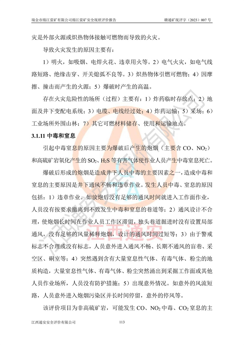 绵江萤矿矿区位于瑞金市南西210°方向,直线距离约26km,矿区地理坐标为东径115°50′54″~115°51′31″,北纬25°38′52″~25°39′34″,行政区划隶属于瑞金市谢坊镇深塘村管辖。 瑞金市绵江萤矿自1972年始有当地村民小规模陆续开采,1978年收归瑞金县谢坊乡管理,成立谢坊乡萤石矿,同年收归县管改名为瑞金县萤石矿,再经历多次采矿权人变更后,至2010年矿山由深圳市新星轻质合金材料有限公司收购瑞金市绵江萤石矿为其全资子公司,同时成立瑞金市绵江萤矿有限公司为现矿山采矿权人。2021年5月28日,深圳市新星轻质合金材料有限公司将其持有的绵江萤矿****股权及派生权益质押给瑞金市金鑫矿产品实业有限公司,采矿权人未变。 矿山于2014年1月20日取得原江西省国土资源厅颁发的采矿许可证,证号:C3607002009126120050709,采矿权人:瑞金市绵江萤矿有限公司,地址:江西省赣州市瑞金市,矿山名称:瑞金市绵江萤矿有限公司绵江萤矿,经济类型:私营有限责任公司,开采矿种:萤石(普通),开采方式:地下开采,生产规模:5.00万t/a,矿区面积;0.5053km2,**期限:壹拾贰年自2014年1月20日至2026年1月20日。开采深度由238m至-100m标高,共有8个拐点圈定。 2014年6月,企业委托江西省煤矿设计院编制了《瑞金市绵江萤矿有限公司绵江萤矿扩建工程初步设计说明书》和《瑞金市绵江萤矿有限公司绵江萤矿扩建工程初步设计说明书安全专篇》。并于2014年6月19日省安监局组织专家对《瑞金市绵江萤矿有限公司绵江萤矿扩建工程初步设计说明书安全专篇》进行了评审并原则通过,2014年7月18日由江西省安监局下达了《关于瑞金市绵江萤矿有限公司绵江萤矿扩建工程初步设计说明书安全专篇》的审查意见书(赣安监非煤项目设审[2014]46号)。矿山扩建工程设计采用竖井+盲竖井联合开拓,延深共布置-15m、-45m、-75m、-100m四个中段。采矿方法为浅孔留矿法,通风系统采用中央对角抽出式机械通风,主扇安装在4#回风斜井井口,矿山生产规模为5万t/a,服务年限为10年。 2016年7月,矿山委托江西通安安全评价有限公司编制了《瑞金市绵江萤矿有限公司绵江萤矿地下开采扩建工程安全设施验收评价报告》。2016年7月31日-8月2日,公司组织有关专家对江西通安安全评价有限公司编制的《瑞金市绵江萤矿有限公司绵江萤矿地下开采扩建工程安全设施验收评价报告》进行了评审,同时对瑞金市绵江萤矿有限公司绵江萤矿地下开采扩建工程建设项目安全设施进行了现场验收并原则通过。瑞金市安监局依法对验收过程及结果进行监督。 2020年10月12日,矿山取得江西省应急管理换发的安全生产许可证。编号:(赣)FM安许证字[2005]M0029号,单位名称:瑞金市绵江萤矿有限公司绵江萤矿地下开采,主要负责人:陈勇,单位地址:江西省瑞金市谢坊镇深塘村,经济类型:有限责任公司,许可范围:萤石矿5万t/a,竖井+盲竖井联合开拓,-75m、-100m中段地下开采,**期:2020年10月27日至2023年10月26日。 矿山取得安全生产许可证后,严格按照设计回采顺序(中段按从上到下的顺序开采,同时开采中段数为一个)要求进行开采,目前矿山-15m、-45m中段已结束回采。矿山现采用竖井+盲竖井联合开拓。东区2#竖井(SJ2)为主竖井,西区3#竖井(SJ3)为副竖井,XJ4斜井为回风井兼做安全出口。矿山共开拓了+170、+110m、+80m、+65m、+45m、+15m、-15m、-45m、-75m、-100m等十个中段,其中-45m以上中段已回采结束,目前-75m为主要生产中段,-45m为回风中段,-100m为生产开拓中段。-75m中段东、西两区运输巷道已贯通,并已掘三个通风天井连接至-45m中段,东区-100m中段已掘穿脉、沿脉巷道100m。东、西区的-45m以上中段均已贯通。东区+15m中段已开拓2#盲竖井至-100m中段,2#盲竖井连接-15m、-45m、-75m、-100m四个中段。西区+45m中段已开拓3#盲竖井至-75m中段,3#盲竖井连接+15m、-15m、-45m、-75m四个中段,并计划按设计延伸至-100m中段。 2019年3月-2020年6月矿山对提升运输系统设备设施进行了改造,各中段及竖井、盲竖井井口运输由原无轨胶轮车运输改为0.5m3U型矿车运输,各东、西区竖井及盲竖井均新安装了BF-0511防坠器,新更换了GLS1/6/1/1罐笼。随着矿山进行深部开拓,井下需风量及风阻随之变大,为了满足矿山通风系统要求,矿山将设计一期工程15kW型号KCZ40-№11主扇风机,更换为二期工程55kW型号KZC40-№13主扇,进一步提高了矿井通风效率。同时将东、西两区竖井及盲竖井原JTP-1.2×1.0P绞车更换为JTP-1.6×1.2P型绞车。 为了进一步优化矿山提升运输、排水、供电等系统,2022年10月,矿山委托江西省中赣投勘察设计有限公司(原江西省煤矿设计院)编制了《瑞金市绵江萤矿有限公司绵江萤矿地下开采提升运输、排水、供电优化方案设计》。至2023年8月,矿山按优化方案完成了改造,并委托江西华安检测技术服务有限公司对设备设施进行检测,检测结果合格。 根据《安全生产法》、《安全生产许可证条例》等有关法律、法规的规定以及《关于做好非煤矿矿山企业安全生产许可证延期换证工作的通知》的要求,2023年4月,瑞金市绵江萤矿有限公司委托我公司(江西通安安全评价有限公司)对绵江萤矿进行安全现状评价。 |