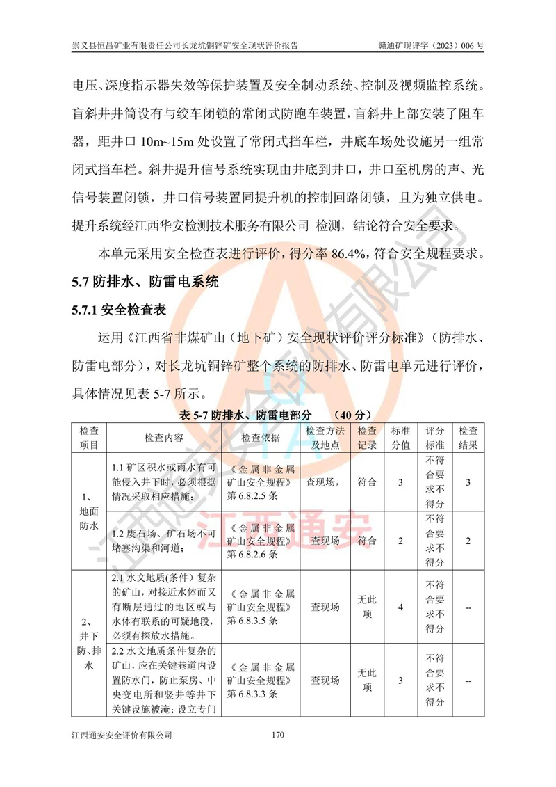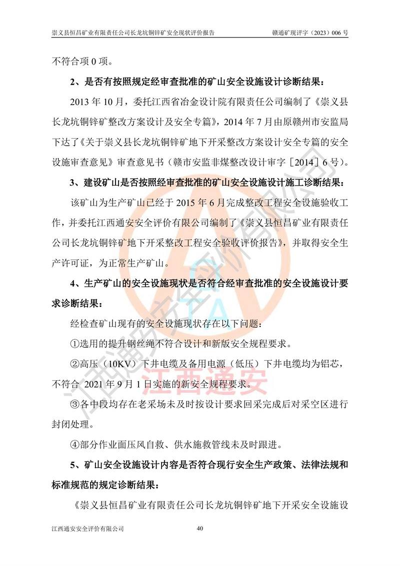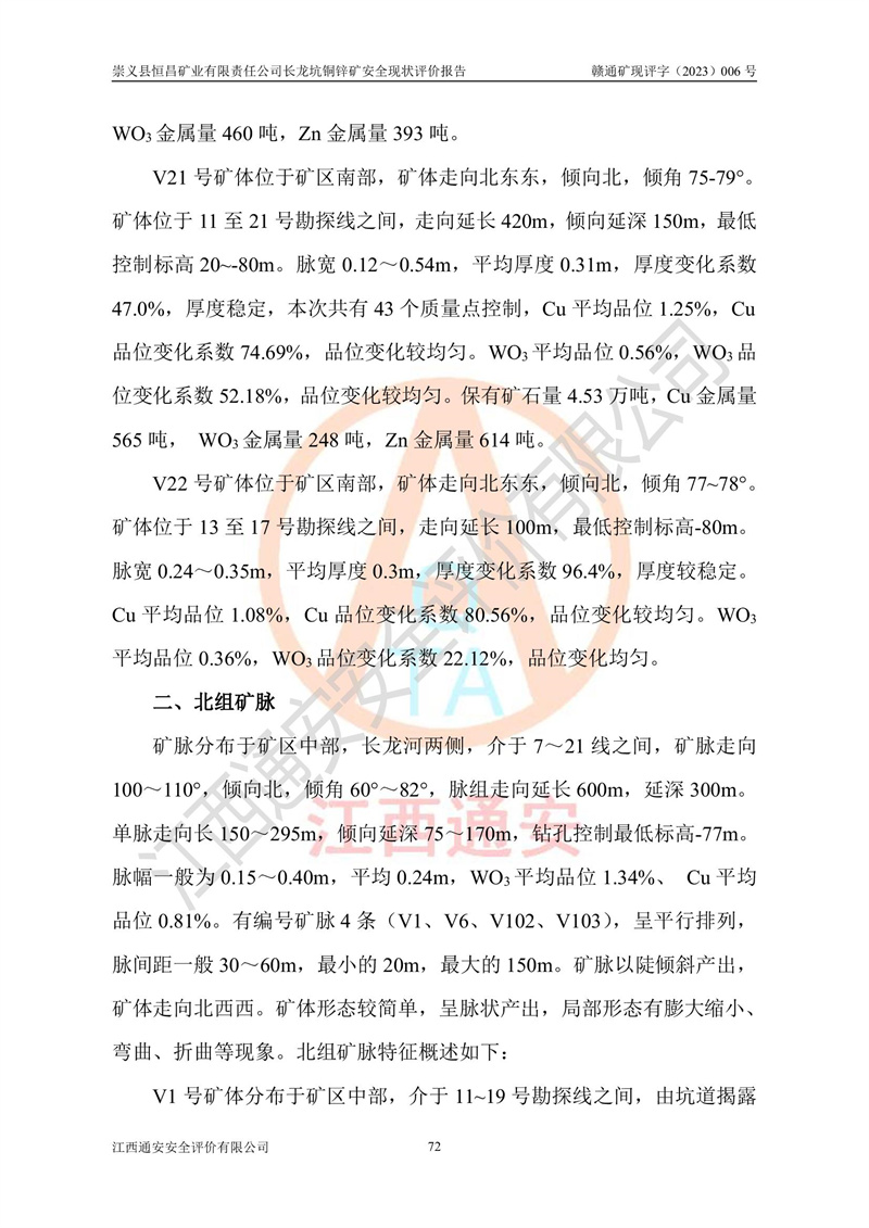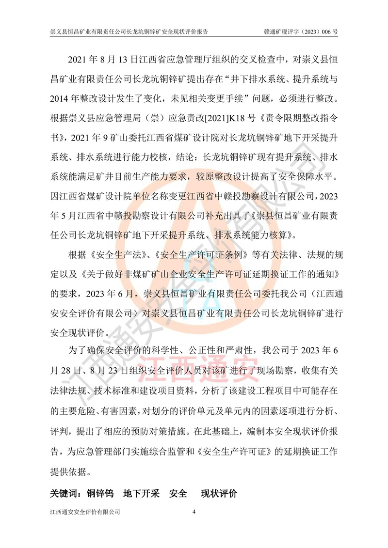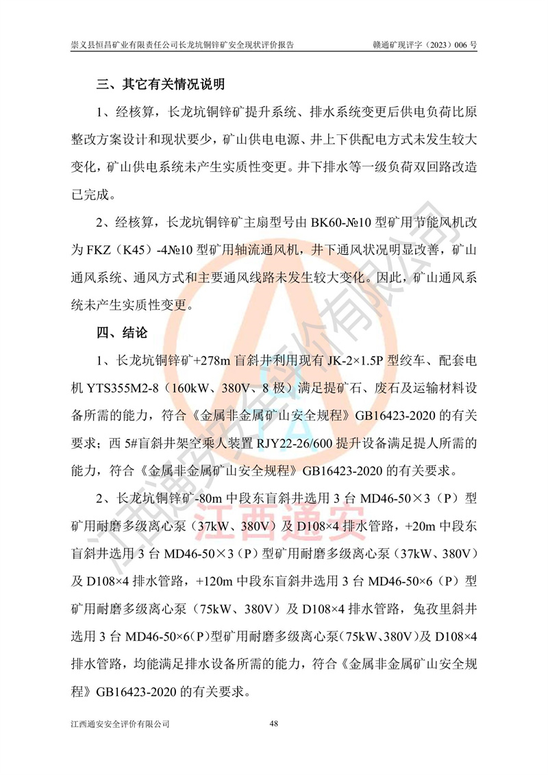 崇义县恒昌矿业有限责任公司长龙坑铜锌矿属江西耀升钨业股份有限公司全资子公司,矿区位于崇义县城112°方向,直距11km处,地理坐标:东经114°23′45″~114°24′42″,北纬25°38′47″~25°39′40″,行政区划隶属崇义县长龙镇长龙村管辖。 长龙坑铜锌矿始建于1996年,至2012年矿山由江西耀升钨业股份有限公司收购,2012年6月12日矿山《采矿许可证》变更为崇义县恒昌矿业有限责任公司长龙坑铜锌矿;2012年12月27日矿山《安全生产许可证》单位名称变更为崇义县恒昌矿业有限责任公司长龙坑铜锌矿。 2017年6月16日,企业取得崇义县市场和质量监督管理局换发的营业执照,统一社会信用代码:91360725056439506W,名称:崇义县恒昌矿业有限责任公司长龙坑铜锌矿,类型:有限责任公司分公司,住所:江西省赣州市崇义县长龙镇长龙村,负责人:郭家芬,成立日期:2012年10月23日,营业期限:2012年10月23日至长期,经营范围:铜、锌、钨矿产品开采(凭**许可证经营)、矿产资源勘查。 2022年10月31日,矿山取得江西省自然资源厅换发的采矿许可证,证号:C3600002011013220104184,采矿权人:崇义县恒昌矿业有限责任公司,地址:江西省赣州市崇义县,矿山名称:崇义县恒昌矿业有限责任公司长龙坑铜锌矿,经济类型:私营有限责任公司,开采矿种:铜矿、锌矿、钨矿,开采方式:地下开采,生产规模:3.00万t/a,矿区面积;2.3125km2,**期限:柒年零捌月年自2022年10月12日至2030年6月12日。开采深度由500m至-100m标高,共有4个拐点圈定。 根据《关于进一步加强我省非煤地下矿山安全生产许可工作的通知》(赣安监管一字〔2012〕253号)等文件的要求。2013年10月,矿山委托江西省冶金设计院有限责任公司编制了《崇义县长龙坑铜锌矿整改方案设计及安全专篇》,并于2014年1月19日由原赣州市安监局组织专家对《崇义县长龙坑铜锌矿整改方案设计及安全专篇》进行了评审并原则通过,2014年7月4日由原赣州市安监局下达了《关于崇义县长龙坑铜锌矿地下开采整改方案设计安全专篇的安全设施审查意见》审查意见书(赣市安监非煤整改设计审字[2014]6号)。矿山整改工程设计采用平硐+盲斜井联合开拓,共布置+20m、-30m、-80m三个中段。采矿方法为浅孔留矿法,通风系统采用中央抽出式机械通风,主扇安装在+302m回风平硐内,矿山生产规模为3万吨/年。 2015年5月,矿山委托江西通安安全评价有限公司编制了《崇义县恒昌矿业有限责任公司长龙坑铜锌矿地下开采整改工程安全验收评价报告》。2015年5月21日,原赣州市安监局组织有关专家对崇义县恒昌矿业有限责任公司长龙坑铜锌矿地下开采整改方案设计安全设施进行了现场竣工验收,验收范围+20m~-80m标高。专家组原则通过安全设施竣工验收。 2020年10月12日,矿山取得原江西省应急管理厅换发的安全生产许可证。编号:(赣)FM安许证字[2005]M0048,许可范围:铜、锌、钨矿3万t/a,平硐+盲斜井联合开拓,+20m、-30m、-80m中段地下开采,**期:2020年11月27日至2023年11月26日。 矿山取得安全生产许可证后,严格按照设计回采顺序要求进行开采。矿山现采用平硐+盲斜井联合开拓。已开拓了+302m回风平硐、+278m主平硐、+215m、+170m、+120m、+70m、+20m、-30m、-80m九个中段,其中+70m及以上中段已结束回采,保留了主要井巷工程仅为矿井通风、运输、行人之用,+20m、-30m、-80m三个中段为生产中段,生产规模为3万t/a。+278m主平硐为主要运输中段,+278m以下中段均通过盲斜井分段连接,1#盲斜井为+278m~+215m。+215m中段以下分东、西两条线盲斜井开拓,其中东线盲斜井为提升运输线已开拓至-80m中段,西线盲斜井为通风、行人井已开拓至-30m中段。东线盲斜井共布置有:东2#盲斜井(+215m~+170m),东3#盲斜井(+170m~+120m),东4#盲斜井(+120m~+70m),东5#盲斜井(+70m~+20m),东6#盲斜井(+20m~-30m~-80m)。西线盲斜井共布置有:西2#盲斜井(+215m~+170m),西3#盲斜井(+170m~+120m),西4#盲斜井(+120m~+70m),西5#盲斜井(+70m~+20m~-30m)。另外,矿山在北部兔孜里开拓了一明斜井(+270m~+120m)至+120m中段,并掘400m穿脉巷道与南部+120m中段贯穿,该斜井主要作为井下人员出入井的安全通道,斜井安装了便于人员上下的“煤矿固定抱索器架空乘人装置”。根据应急管理部开展金属非金属地下矿山四个专项执法要求,矿山对提升运输系统设备设施进行了优化改造;为了减少盲斜井提升运输环节,矿山在+278m主平硐东线开拓了+278m至+120m中段盲斜井,作为+120m以上中段接力主提升,并取消了1#盲斜井(+278m~+215m),东2#盲斜井(+215m~+170m),东3#盲斜井(+170m~+120m)提升运输功能。为了减轻井下作业人员出入井劳动强度,矿山将西5#盲斜井(+70m~+20m~-30m)改造安装了RJY22-26/600型架空乘人装置。为了优化矿井通风系统,矿山将原设计22kW型号BK60-NO10/22主扇风机,更换为30kW型号KZ(K45)-4№10主扇,进一步提高了矿井通风效率,并减少、更换了部分辅扇。 2021年8月13日江西省应急管理厅组织的交叉检查中,对崇义县恒昌矿业有限责任公司长龙坑铜锌矿提出存在“井下排水系统、提升系统与2014年整改设计发生了变化,未见相关变更手续”问题,**进行整改。根据崇义县应急管理局(崇)应急责改[2021]K18号《责令限期整改指令书》,2021年9矿山委托江西省煤矿设计院对长龙坑铜锌矿地下开采提升系统、排水系统进行能力校核,结论:长龙坑铜锌矿现有提升系统、排水系统能满足矿井目前生产能力要求,较原整改设计提高了安全保障水平。因江西省煤矿设计院单