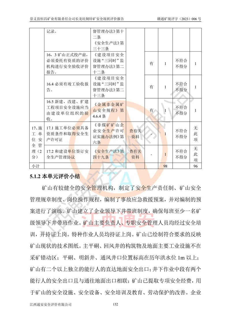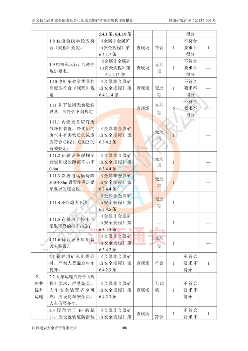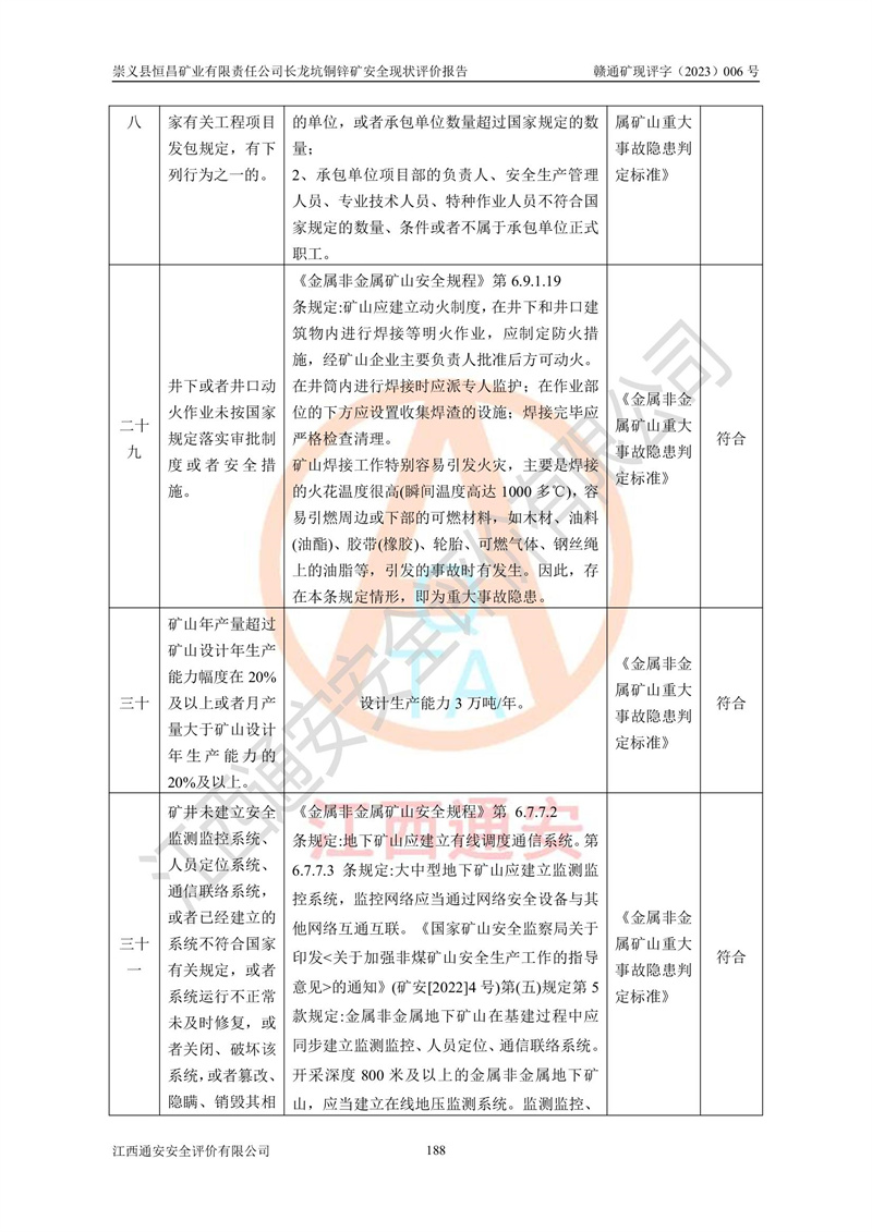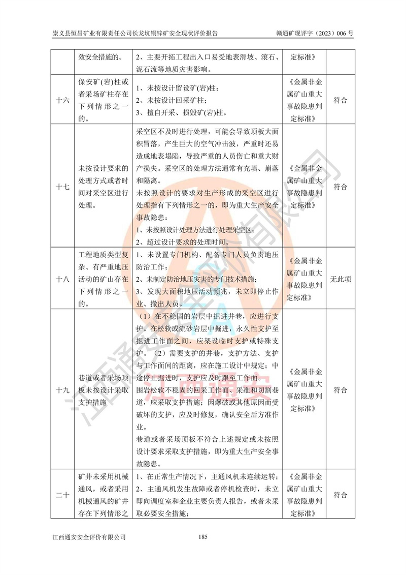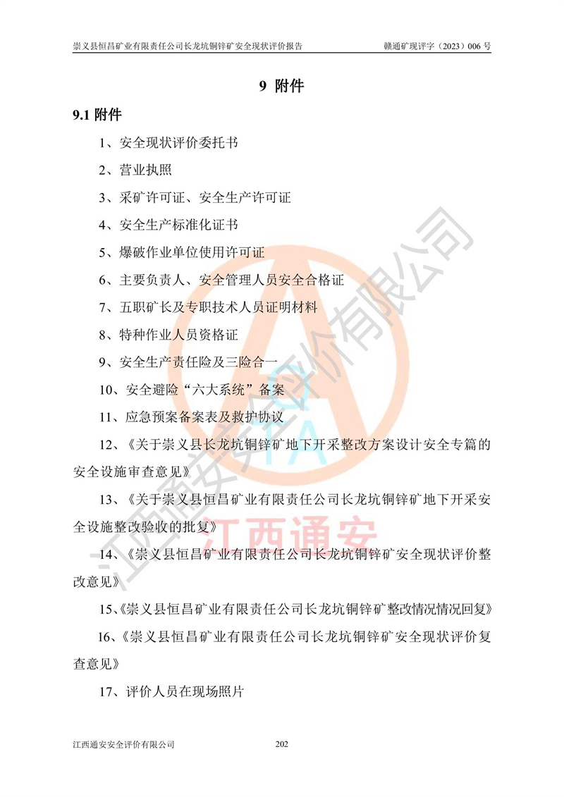 崇义县恒昌矿业有限责任公司长龙坑铜锌矿属江西耀升钨业股份有限公司全资子公司,矿区位于崇义县城112°方向,直距11km处,地理坐标:东经114°23′45″~114°24′42″,北纬25°38′47″~25°39′40″,行政区划隶属崇义县长龙镇长龙村管辖。 长龙坑铜锌矿始建于1996年,至2012年矿山由江西耀升钨业股份有限公司收购,2012年6月12日矿山《采矿许可证》变更为崇义县恒昌矿业有限责任公司长龙坑铜锌矿;2012年12月27日矿山《安全生产许可证》单位名称变更为崇义县恒昌矿业有限责任公司长龙坑铜锌矿。 2017年6月16日,企业取得崇义县市场和质量监督管理局换发的营业执照,统一社会信用代码:91360725056439506W,名称:崇义县恒昌矿业有限责任公司长龙坑铜锌矿,类型:有限责任公司分公司,住所:江西省赣州市崇义县长龙镇长龙村,负责人:郭家芬,成立日期:2012年10月23日,营业期限:2012年10月23日至长期,经营范围:铜、锌、钨矿产品开采(凭**许可证经营)、矿产资源勘查。 2022年10月31日,矿山取得江西省自然资源厅换发的采矿许可证,证号:C3600002011013220104184,采矿权人:崇义县恒昌矿业有限责任公司,地址:江西省赣州市崇义县,矿山名称:崇义县恒昌矿业有限责任公司长龙坑铜锌矿,经济类型:私营有限责任公司,开采矿种:铜矿、锌矿、钨矿,开采方式:地下开采,生产规模:3.00万t/a,矿区面积;2.3125km2,**期限:柒年零捌月年自2022年10月12日至2030年6月12日。开采深度由500m至-100m标高,共有4个拐点圈定。 根据《关于进一步加强我省非煤地下矿山安全生产许可工作的通知》(赣安监管一字〔2012〕253号)等文件的要求。2013年10月,矿山委托江西省冶金设计院有限责任公司编制了《崇义县长龙坑铜锌矿整改方案设计及安全专篇》,并于2014年1月19日由原赣州市安监局组织专家对《崇义县长龙坑铜锌矿整改方案设计及安全专篇》进行了评审并原则通过,2014年7月4日由原赣州市安监局下达了《关于崇义县长龙坑铜锌矿地下开采整改方案设计安全专篇的安全设施审查意见》审查意见书(赣市安监非煤整改设计审字[2014]6号)。矿山整改工程设计采用平硐+盲斜井联合开拓,共布置+20m、-30m、-80m三个中段。采矿方法为浅孔留矿法,通风系统采用中央抽出式机械通风,主扇安装在+302m回风平硐内,矿山生产规模为3万吨/年。 2015年5月,矿山委托江西通安安全评价有限公司编制了《崇义县恒昌矿业有限责任公司长龙坑铜锌矿地下开采整改工程安全验收评价报告》。2015年5月21日,原赣州市安监局组织有关专家对崇义县恒昌矿业有限责任公司长龙坑铜锌矿地下开采整改方案设计安全设施进行了现场竣工验收,验收范围+20m~-80m标高。专家组原则通过安全设施竣工验收。 2020年10月12日,矿山取得原江西省应急管理厅换发的安全生产许可证。编号:(赣)FM安许证字[2005]M0048,许可范围:铜、锌、钨矿3万t/a,平硐+盲斜井联合开拓,+20m、-30m、-80m中段地下开采,**期:2020年11月27日至2023年11月26日。 矿山取得安全生产许可证后,严格按照设计回采顺序要求进行开采。矿山现采用平硐+盲斜井联合开拓。已开拓了+302m回风平硐、+278m主平硐、+215m、+170m、+120m、+70m、+20m、-30m、-80m九个中段,其中+70m及以上中段已结束回采,保留了主要井巷工程仅为矿井通风、运输、行人之用,+20m、-30m、-80m三个中段为生产中段,生产规模为3万t/a。+278m主平硐为主要运输中段,+278m以下中段均通过盲斜井分段连接,1#盲斜井为+278m~+215m。+215m中段以下分东、西两条线盲斜井开拓,其中东线盲斜井为提升运输线已开拓至-80m中段,西线盲斜井为通风、行人井已开拓至-30m中段。东线盲斜井共布置有:东2#盲斜井(+215m~+170m),东3#盲斜井(+170m~+120m),东4#盲斜井(+120m~+70m),东5#盲斜井(+70m~+20m),东6#盲斜井(+20m~-30m~-80m)。西线盲斜井共布置有:西2#盲斜井(+215m~+170m),西3#盲斜井(+170m~+120m),西4#盲斜井(+120m~+70m),西5#盲斜井(+70m~+20m~-30m)。另外,矿山在北部兔孜里开拓了一明斜井(+270m~+120m)至+120m中段,并掘400m穿脉巷道与南部+120m中段贯穿,该斜井主要作为井下人员出入井的安全通道,斜井安装了便于人员上下的“煤矿固定抱索器架空乘人装置”。根据应急管理部开展金属非金属地下矿山四个专项执法要求,矿山对提升运输系统设备设施进行了优化改造;为了减少盲斜井提升运输环节,矿山在+278m主平硐东线开拓了+278m至+120m中段盲斜井,作为+120m以上中段接力主提升,并取消了1#盲斜井(+278m~+215m),东2#盲斜井(+215m~+170m),东3#盲斜井(+170m~+120m)提升运输功能。为了减轻井下作业人员出入井劳动强度,矿山将西5#盲斜井(+70m~+20m~-30m)改造安装了RJY22-26/600型架空乘人装置。为了优化矿井通风系统,矿山将原设计22kW型号BK60-NO10/22主扇风机,更换为30kW型号KZ(K45)-4№10主扇,进一步提高了矿井通风效率,并减少、更换了部分辅扇。 2021年8月13日江西省应急管理厅组织的交叉检查中,对崇义县恒昌矿业有限责任公司长龙坑铜锌矿提出存在“井下排水系统、提升系统与2014年整改设计发生了变化,未见相关变更手续”问题,**进行整改。根据崇义县应急管理局(崇)应急责改[2021]K18号《责令限期整改指令书》,2021年9矿山委托江西省煤矿设计院对长龙坑铜锌矿地下开采提升系统、排水系统进行能力校核,结论:长龙坑铜锌矿现有提升系统、排水系统能满足矿井目前生产能力要求,较原整改设计提高了安全保障水平。因江西省煤矿设计院单