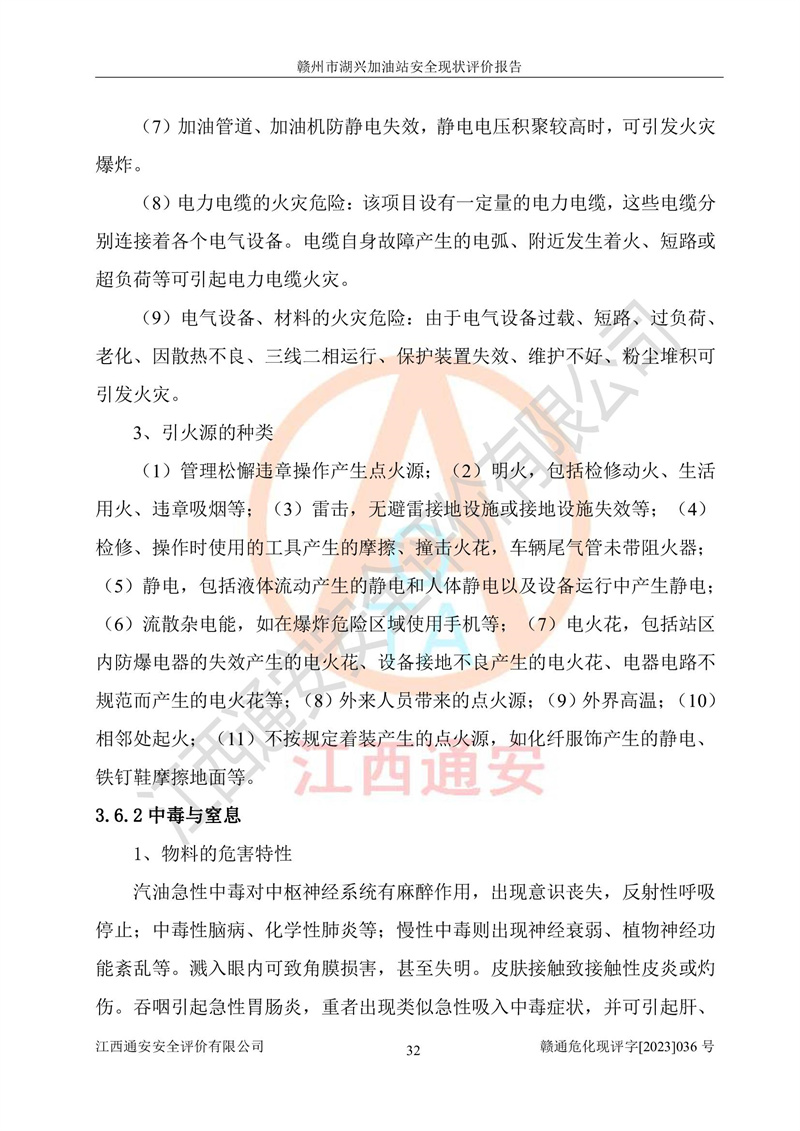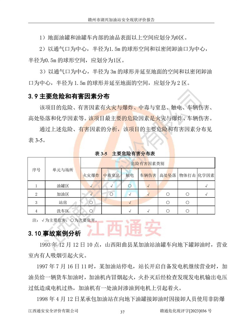 项目简介 | 赣州市湖兴加油站位于赣州市赣县区湖江镇新富村丰富组31号,经营单位负责人为郑晓东,现有员工5人,其中安全管理人员1人。该加油站2020年10月12日取得了危险化学品经营许可证,登记编号为赣县区安经(甲)字[2020]000130,经营方式为零售,许可范围为汽油、柴油,**期限为2020年10月11日至2023年10月10日。加油站设有3台埋地油罐,分别为1台30m30#柴油卧式储罐、1台30m392#汽油卧式油罐和1台20m395#汽油卧式油罐,总储存能力为65m³(柴油折半),为三级加油站。加油区设有2台双枪加油机。该加油站目前运行正常。 | |||