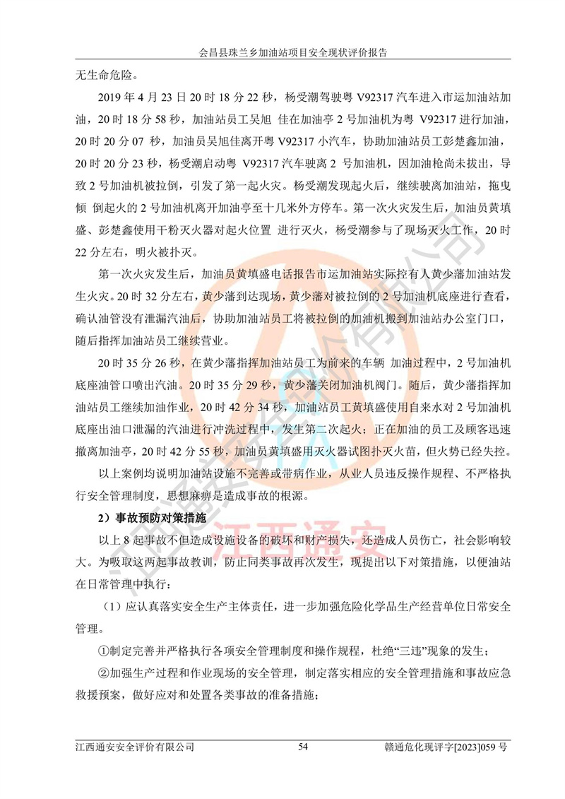 项目简介 | 本报告为会昌县珠兰乡加油站安全现状评价报告。会昌县珠兰乡加油站注册地址为会昌县珠兰乡怀仁村,法人**郑碧辉,成立于2018年01月02日,是一家从事成品油零售经营的单位。该加油站设4台双层油罐,包括92#汽油储罐1个,容积50m3;95#汽油储罐1个,容积50m3;0#柴油储罐2个,每个容积50m3,总储存能力为150m³(柴油折半计入),按**现行《汽车加油加气加氢站技术标准》GB50156-2021对加油站的等级划分计算,属二级加油站。加油区设了4台双枪加油机。 汽油和柴油均是化学品液体。汽油、柴油均为危险化学品,其中汽油火险分级为甲B类,其蒸汽与空气形成爆炸性气体,遇明火、高热易燃烧爆炸;柴油火险分级为丙A类,遇明火、高热或与氧化剂接触,有引起燃烧爆炸的危险。 | ||||