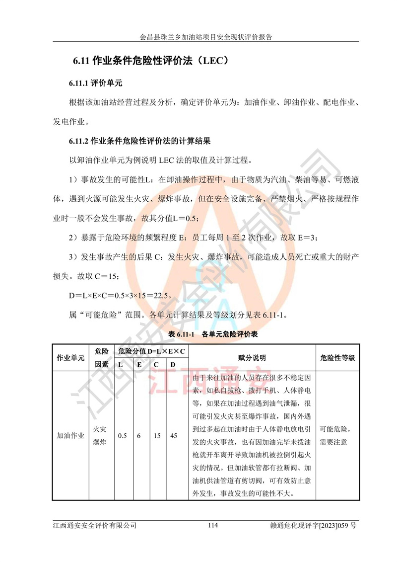 其它 | 在对该项目危险、有害因素辨识分析的基础上,运用安全检查表、预作业条件危险性分析法、危险度评价、重大事故后果分析结果等评价方法对该项目进行了分析评价,评价结果如下: 1、会昌县珠兰乡加油站为成品油零售企业,属于二级加油站,油罐区为主要危险目标。该加油站未构成危险化学品重大危险源。 2、会昌县珠兰乡加油站经营的汽油属于重点监管危险化学品,应加强管理,防止事故发生。 3、通过本报告分析,该项目经营过程中主要的危险有害因素为火灾与爆炸、中毒、触电、**伤害等。而项目*主要的危险、有害因素是火灾与爆炸,加油站全体员工**保持**的安全防护意识,严禁火源。 4、项目公用工程能够满足安全经营的需要。 5、该加油站周边环境和总平面布置符合**和行业相关标准、规范的要求。该加油站建筑结构、安全设施等布置明确、合理,符合规范的要求。 6、加油站配备的消防、安全设施满足法律法规、标准规范的要求。 7、作业条件危险性评价结果:在选定的4个单元的危险程度为“可能危险,需要注意”“稍有危险,可以接受”,他作业单元的风险等级为“可能危险,需要注意”或“稍有危险,可以接受”,因此,企业须加强对生产过程中的安全管理,遵守安全操作规程,分主次认真做好作业场所管理、设备安全检修及人员的安全教育培训工作,并做好事故应急预案的演练,提高从业人员应急处置能力。 8、危险度评价结果:油罐区得分为13分,为Ⅱ级,属于中度危险。油罐区油罐设置了液位监测系统,具有液位远传、报警功能,卸油过程中设有静电报警仪,配有消防器材、消防沙等应急器材,采取上述安全措施降低火灾爆炸危险,满足安全条件要求。 9、加油站建立了安全责任制,制定相应的安全管理制度、操作规程,编制了生产安全事故应急预案,但还需健全和完善。 评价结论: 会昌县珠兰乡加油站安全现状符合危险化学品经营安全条件。 | ||||