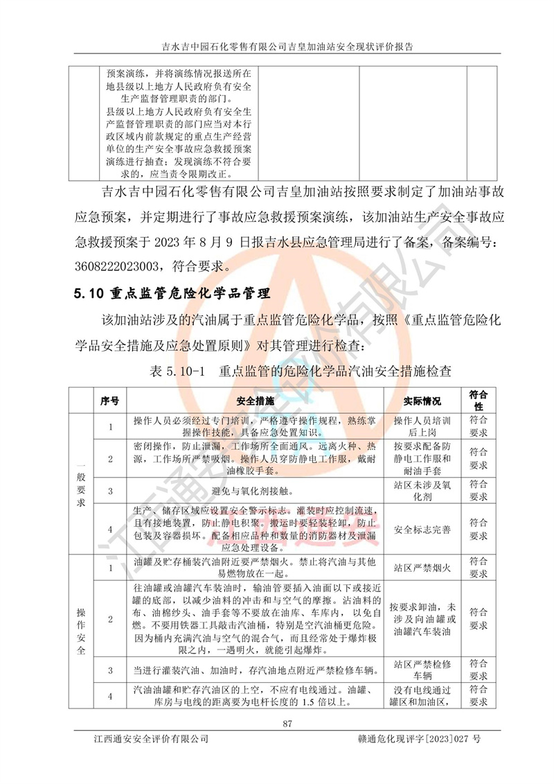 综上:吉水吉中园石化零售有限公司吉皇加油站符合《汽车加油加气加氢站技术标准》GB50156-2021等标准规范的要求,安全风险可控,满足危险化学品经营的安全条件。