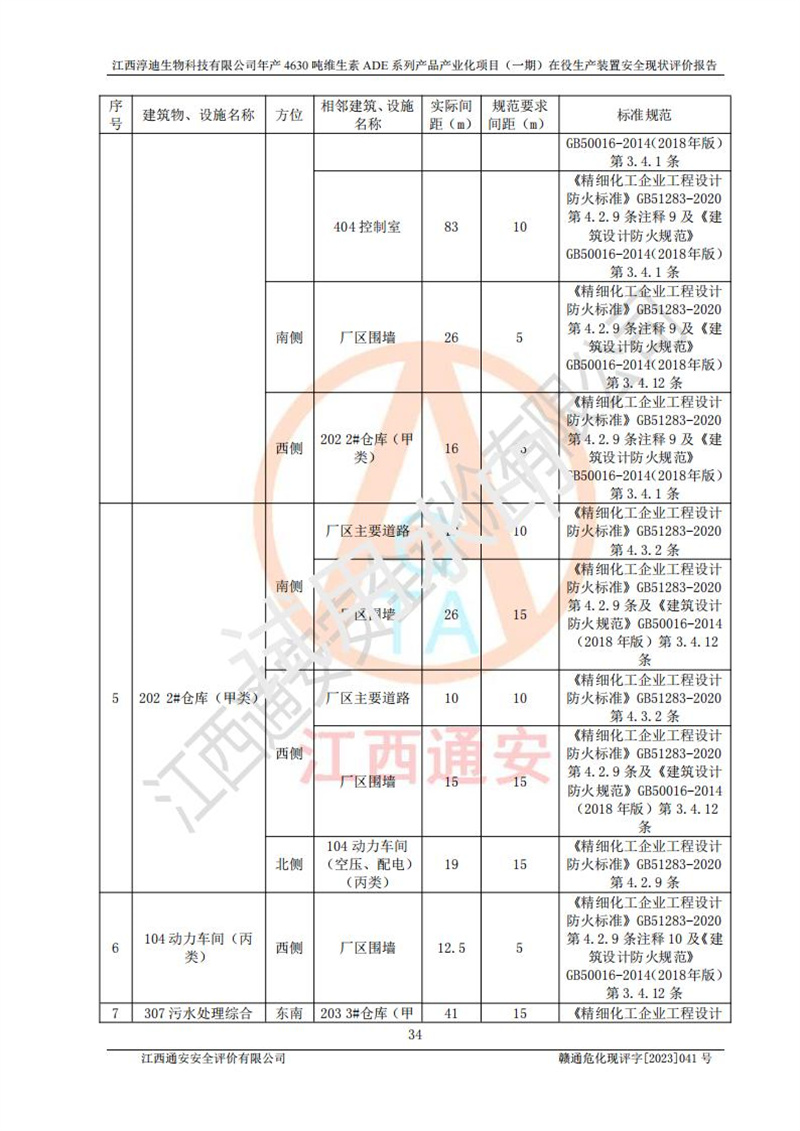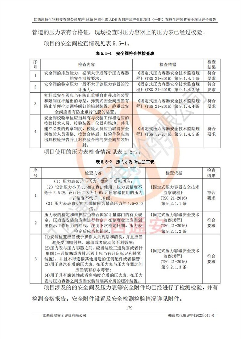 评价结论 | 江西淳迪生物科技有限公司年产4630吨维生素ADE系列产品产业化项目(一期)符合井开区园区规划;总平面布置符合《建筑设计防火规范》GB50016-2014(2018年版)等标准、规范的要求;项目采用成熟的生产工艺和设备,本质安全程度较高;同时对生产过程中存在事故危险的设施和场所采取了一系列的合理可行的防护措施和科学的管理,近期通过对存在的安全问题进行了整改,使生产过程中的危险有害因素能得到**控制。建设项目安全设施符合**现行有关法律、法规、标准的要求。 评价结论:本报告认为,江西淳迪生物科技有限公司年产4630吨维生素ADE系列产品产业化项目在役生产装置(一期)现场情况与企业提供的现状图纸一致,自动化控制系统运行正常,有关从业人员资质符合《危险化学品生产企业安全生产许可证实施办法》要求,安全设施及安全管理符合**及有关部门关于安全生产法律、法规、标准的要求,安全风险是可以控制的,其风险程度是可以接受的,安全现状符合安全生产条件,能够满足安全生产的要求。 | |||