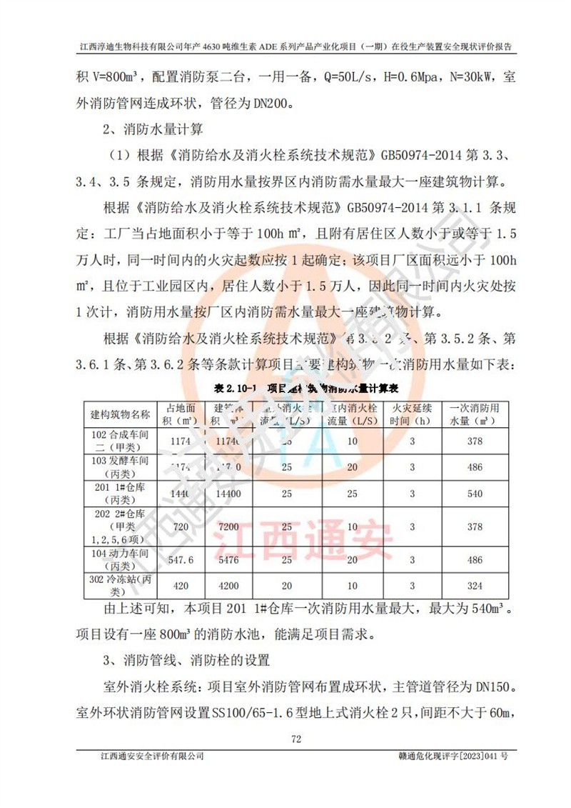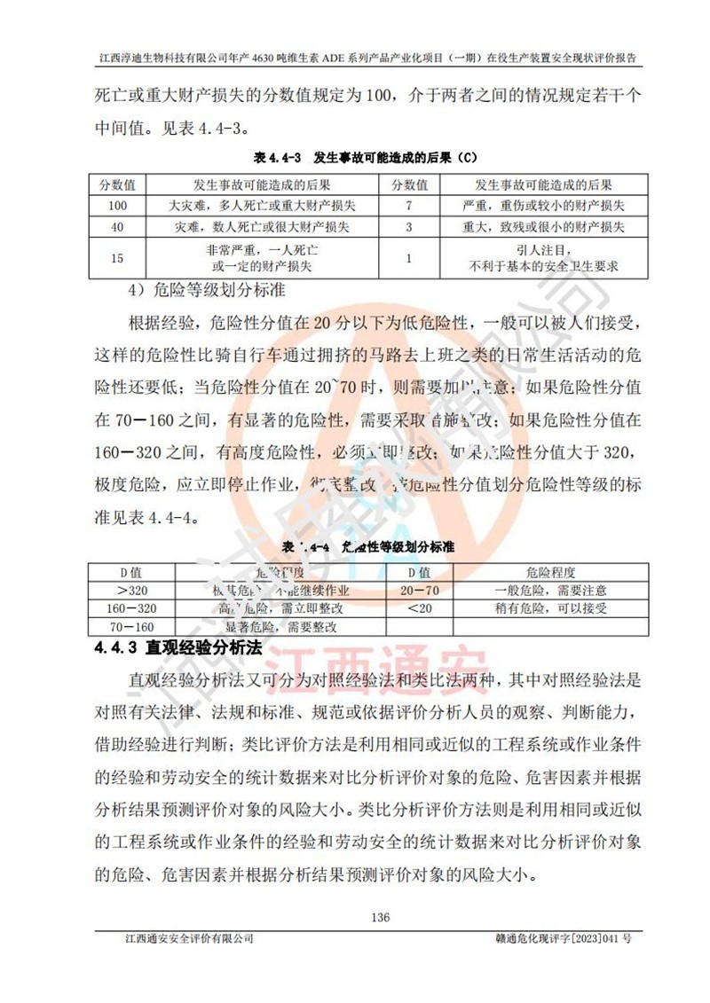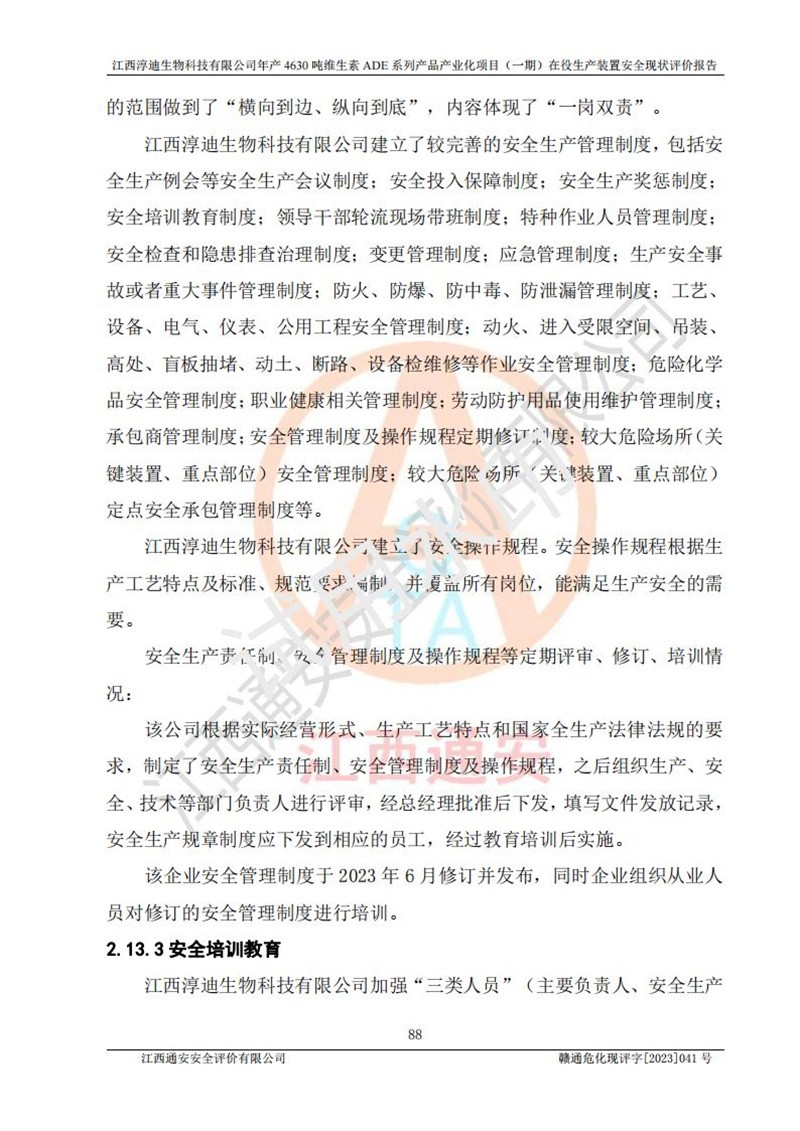 项目简介 | 江西淳迪生物科技有限公司成立于2007年,原名江西爱贞纳制药有限公司,2018年5月11日,为了适应市场需求和企业发展,该公司更名为江西神田生物科技有限公司。2021年4月14日,该公司再次更名为江西淳迪生物科技有限公司。 2021年12月6日江西淳迪生物科技有限公司法定**人由朱飞轮变更为王英增,并将投资人由海南盛健投资有限公司、江西宇能制药有限公司共同持股变更为海南盛健投资有限公司单独持股。2022年3月30日江西淳迪生物科技有限公司将经营范围变更为:药品生产饲料生产,饲料添加剂生产,食品添加剂生产,兽药生产(依法须经批准的项目,经相关部门批准后方可开展经营活动)一般项目:进出口代理,技术进出口货物进出口,**化学产品制造(不含危险化学品)(除许可业务外,可自主依法经营法律法规非禁止或限制的项);投资人由海南盛健投资有限公司变更为湖南科瑞生物制药股份有限公司,海南盛健医药科技有限公司共同投资;企业类型由有限责任公司(非自然人投资或控股的法人独资)变更为其他有限责任公司。 江西淳迪生物科技有限公司位于江西省**井冈山经济技术开发区,成立于2007年4月24日,并取得吉安市市场监督管理局井冈山经济技术开发区分局颁发的营业执照,注册资本叁仟万元整,法定**人王英增,公司类型为其他有限责任公司,统一社会信用代码:913608057994888273,经营范围:许可项目:药品生产,饲料生产,饲料添加剂生产,食品添加剂生产,兽药生产(依法须经批准的项目,经相关部门批准准后方可开展经营活动)一般项目:进出口代理,技术进出口,货物进出口,**化学产品制造(不含危险化学品),生物饲料研发,生物化工产品技术研发,畜牧渔业饲料销售,饲料添加剂销售,食品添加剂销售,饲料原料销售(除许可业务外,可自主依法经营法律法规非禁止或限制的项目)。 江西淳迪生物科技有限公司(2021年4月14日变更前名称:江西神田生物科技有限公司)于2019年6月19日取得江西省企业投资项目备案通知书,备案项目名称:年产4630吨维生素ADE系列产品产业化项目,项目统一代码:2019-360861-27-03-011469。 江西淳迪生物科技有限公司(2021年4月14日变更前名称:江西神田生物科技有限公司)2019年11月委托江西赣华安全科技有限公司编制了《江西神田生物科技有限公司年产4630吨维生素ADE系列产品产业化项目安全条件评价报告》。该项目于2019年11月21日取得了危险化学品建设项目安全条件审查意见书(吉市危化项目安条审字﹝2019﹞14号)。 江西淳迪生物科技有限公司2020年5月委托江西省化学工业设计院编制了《江西神田生物科技有限公司年产4630吨维生素ADE系列产品产业化项目安全设施设计》,并于2020年5月13日取得了危险化学品建设项目安全设施设计审查意见书(吉市危化项目安设审字〈2020〉39号)。 江西淳迪生物科技有限公司2020年该公司编制了试生产方案,并于2020年6月5日聘请专家对公司试生产方案进行了评审。2020年9月委托江西通安安全评价有限公司编制了《江西神田生物科技有限公司年产4630吨维生素ADE系列产品产业化项目(一期)安全验收评价报告》。 本项目生产过程中属于危险化学品的有:甲醇、乙酸乙酯、氢氧化钠、正己烷、氮气,其中甲醇、乙酸乙酯属于重点监管的危险化学品。 本项目不涉及重点监管的危险化工工艺。 本项目生产单元和储存设施单元不构成危险化学品重大危险源。 | |||