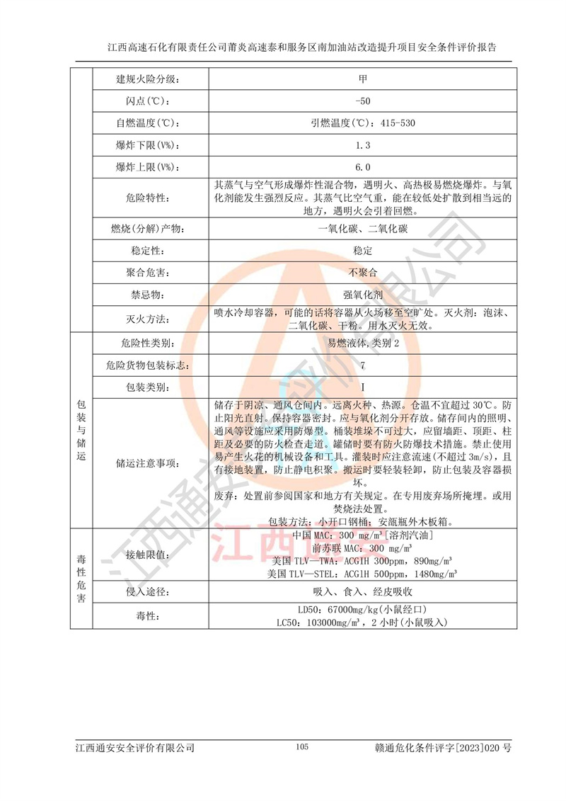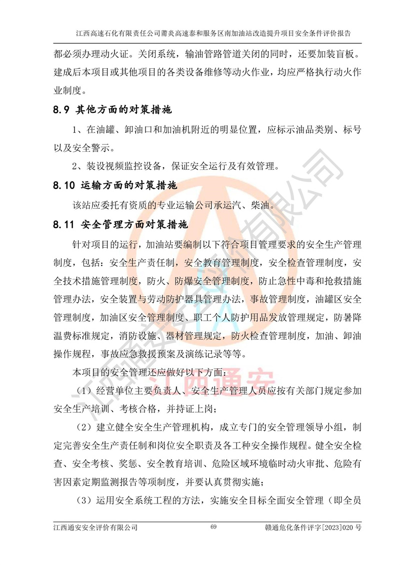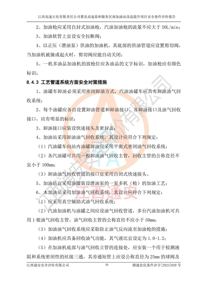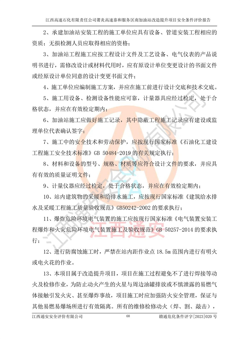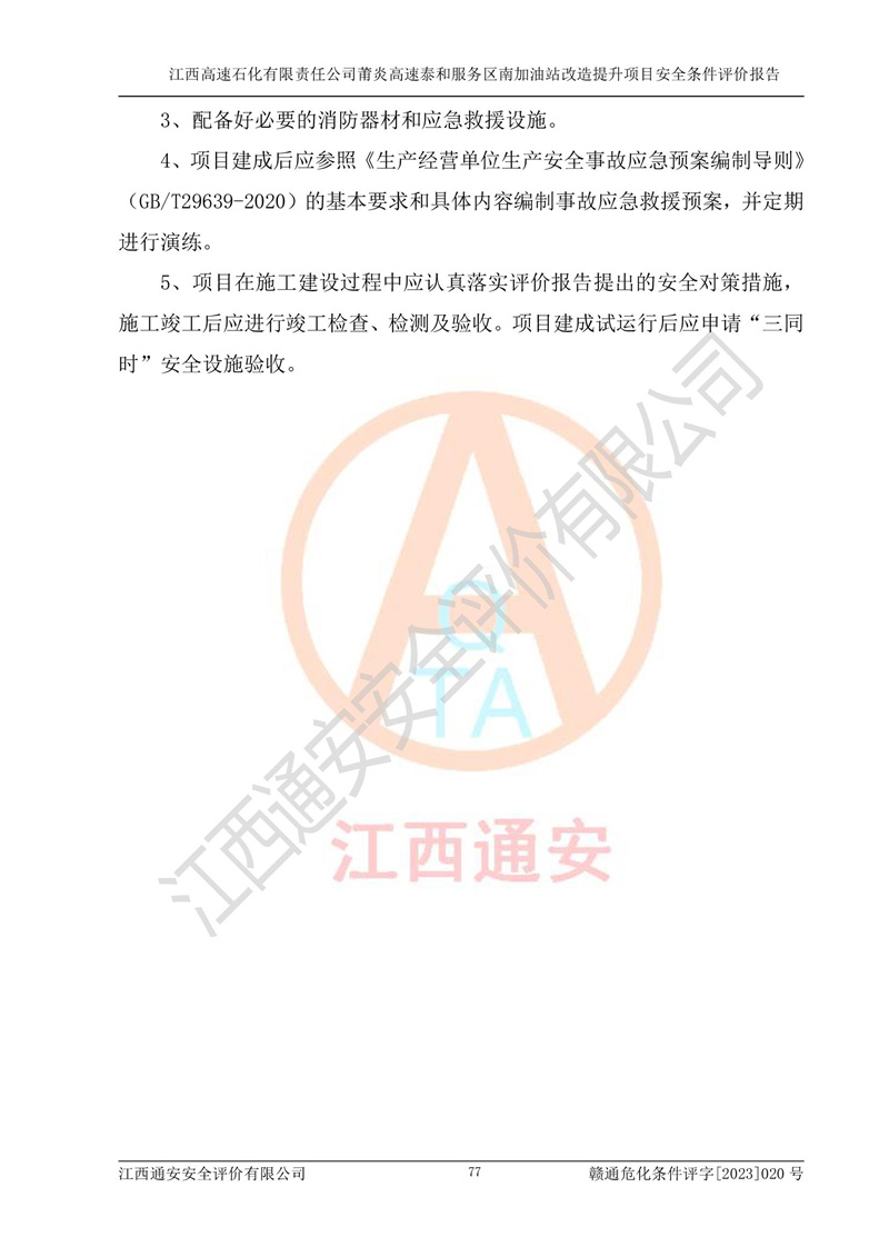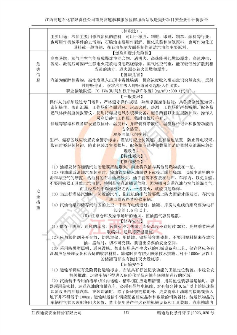 评价结论 | 1、江西高速石化有限责任公司莆炎高速泰和服务区南加油站已按照《中华人民共和国安全生产法(中华人民共和国主席令[2021]88号)》和《危险化学品建设项目安全监督管理办法》(**安监总局[2012]第45号令,2015年79号令修改)的要求进行安全条件评价,符合**和省关于危险化学品建设项目经营许可程序的要求。 2、江西高速石化有限责任公司莆炎高速泰和服务区南加油站总平面布置符合《汽车加油加气加氢站技术标准》GB50156-2021的要求。江西高速石化有限责任公司莆炎高速泰和服务区南加油站在项目建设和运行阶段,总平面布置设计、施工图设计和建设施工、安装调试及生产运行中,应严格执行**有关安全生产法律、法规和有关标准、规范,将本报告书中提出的安全对策措施落实到位,真正做到安全设施与主体工程同时设计、同时施工、同时投入生产和使用,项目建成后危险、有害因素可以得到**控制,安全风险在可接受范围,拟建的江西高速石化有限责任公司莆炎高速泰和服务区南加油站改造提升项目符合法律法规、标准、规章和规范的要求。 | |||