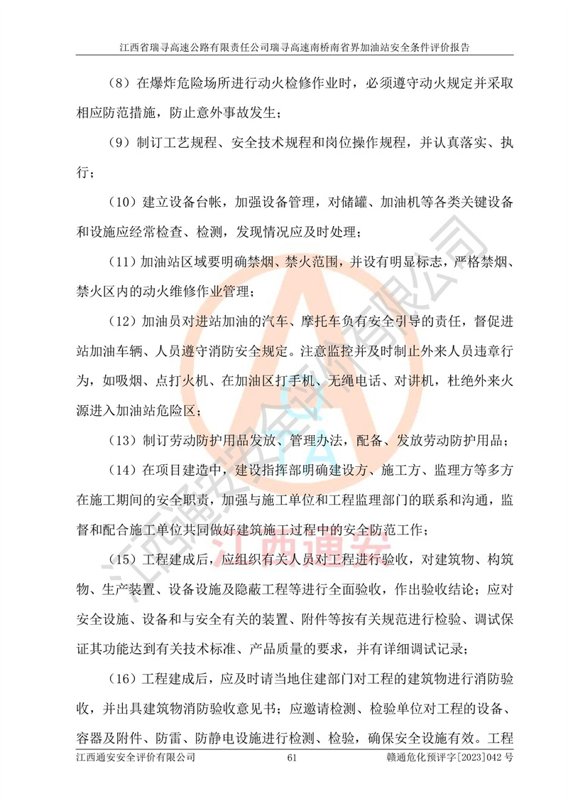评价结论 | 江西省瑞寻高速公路有限责任公司瑞寻高速南桥南省界加油站总平面布置符合《汽车加油加气加氢站技术标准》GB50156-2021的要求。江西省瑞寻高速公路有限责任公司在项目建设和运行阶段,总平面布置设计、施工图设计和建设施工、安装调试及生产运行中,应严格执行**有关安全生产法律、法规和有关标准、规范,将本报告书中提出的安全对策措施落实到位,真正做到安全设施与主体工程同时设计、同时施工、同时投入生产和使用,项目建成后危险、有害因素可以得到**控制,安全风险在可接受范围,瑞寻高速南桥南省界加油站项目符合法律法规、标准、规章和规范的要求。 | |||