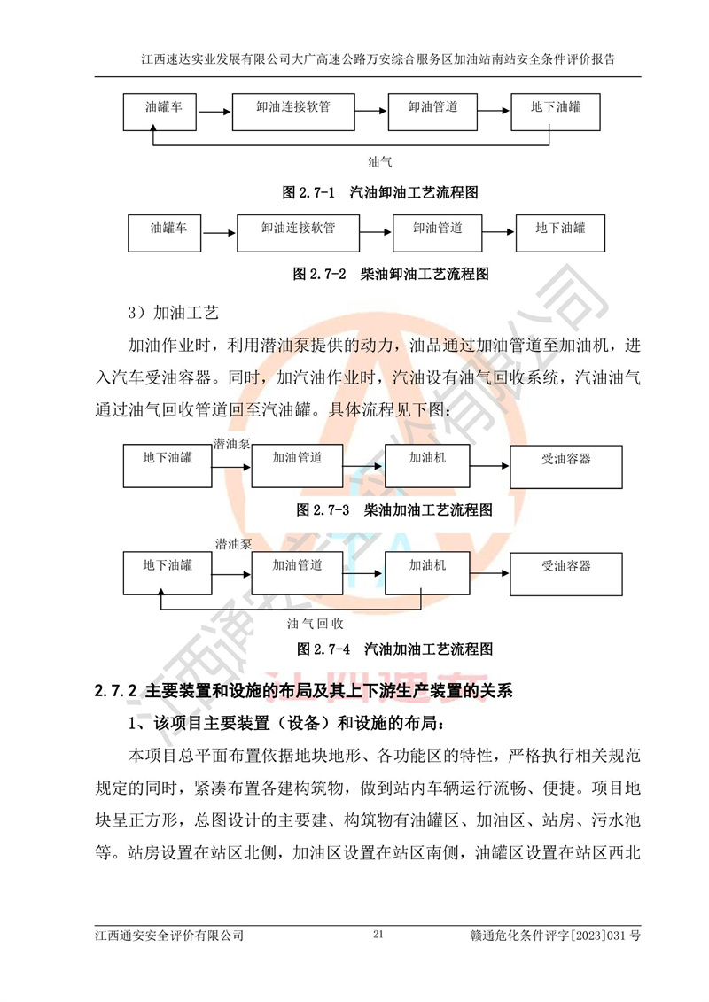 项目简介 | 江西速达实业发展有限公司成立于2002年6月27日,企业类型:其他有限责任公司,法定**人刘新妹。经营范围为:综合技术服务:信息咨询服务:房屋租赁:公路工程:畜禽养殖及农作物种植,酒店管理,建筑材料、机械、电子设备、金属材料、五金交电化工、百货、针纺织品、电子计算机及配件、农副产品、汽车《小轿车除外)及部的批发、零售设备租赁:汽车租赁《客车除外):公路护坡及绿化工程。《依法须经批准的项目,经相关部门批准后方可开展经营活。该公司在大广高速公路万安综合服务区新建加油站,该站位于江西省吉安市万安县大广高速K2935东侧万安服务区,加油站为企业自有(建站土地为企业购买所得)。 该站主要经营0#柴油、92#汽油、95#汽油,站内拟设6台油罐,分别为容积50m³的0#柴油埋地卧式双层贮罐2台、容积30m³的92#汽油埋地卧式双层油罐1台、容积50m³的92#汽油埋地卧式双层油罐1台、容积30m³的95#汽油埋地卧式油罐1台,容积50m³的95#汽油埋地卧式油罐1台。*大存储量为260³,实际油品折算总容量为210m³(柴油折半),属于一级加油站。 江西速达实业发展有限公司万安县综合服务区加油站南站于2023年5月26号取得由万安县发展和改革委员会出具的《江西省企业投资项目备案通知书》,项目统一代码为:2305-360828-04-01-779141。 | |||