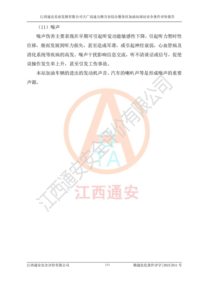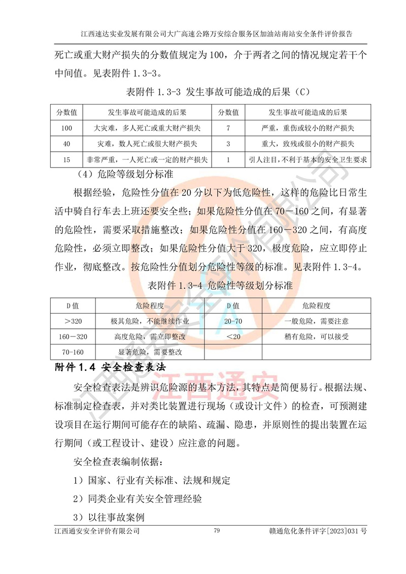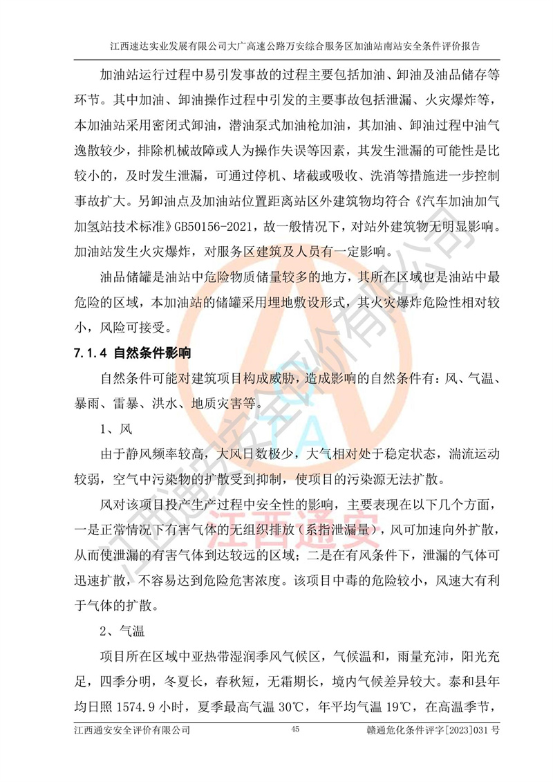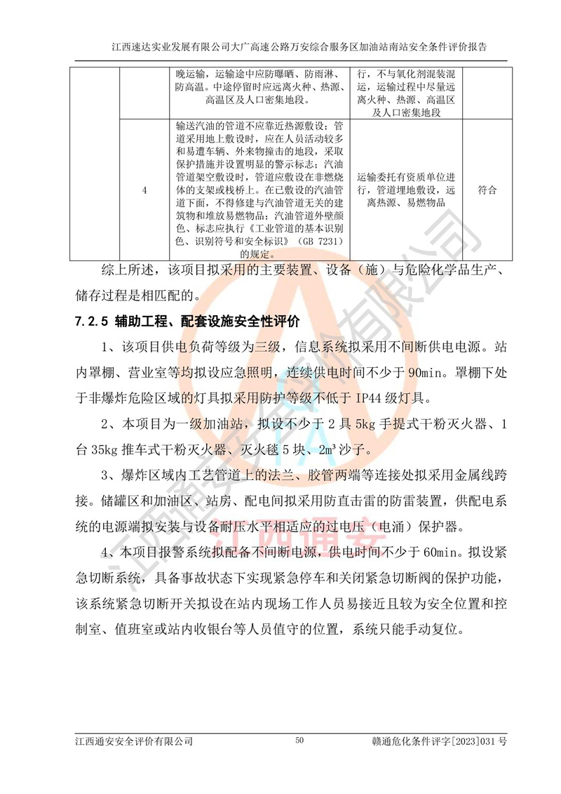 评价结论 | 1、江西速达实业发展有限公司大广高速公路万安综合服务区加油站南站已按照《中华人民共和国安全生产法(中华人民共和国主席令[2021]88号)》和《危险化学品建设项目安全监督管理办法》(**安监总局[2012]第45号令,2015年79号令修改)的要求进行安全条件评价,符合**和省关于危险化学品建设项目经营许可程序的要求。 2、江西速达实业发展有限公司大广高速公路万安综合服务区加油站南站总平面布置符合《汽车加油加气加氢站技术标准》GB50156-2021的要求。江西速达实业发展有限公司大广高速公路万安综合服务区加油站南站在项目建设和运行阶段,总平面布置设计、施工图设计和建设施工、安装调试及生产运行中,应严格执行**有关安全生产法律、法规和有关标准、规范,将本报告书中提出的安全对策措施落实到位,真正做到安全设施与主体工程同时设计、同时施工、同时投入生产和使用,项目建成后危险、有害因素可以得到**控制,安全风险在可接受范围,拟建的江西速达实业发展有限公司大广高速公路万安综合服务区加油站南站项目符合法律法规、标准、规章和规范的要求。 | |||