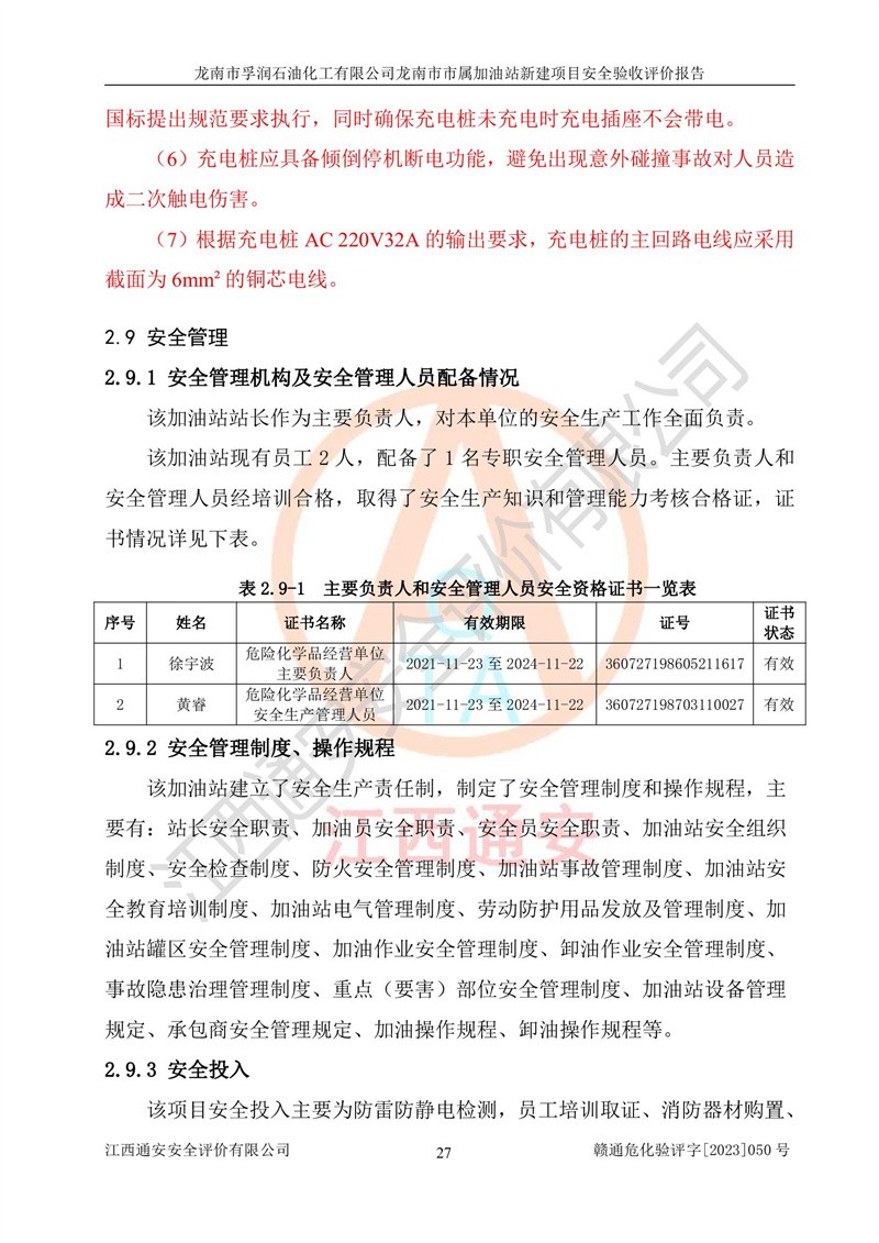 1、龙南市市属加油站新建项目为成品油零售企业,属于二级加油站,油罐区为主要危险源。该加油站不构成危险化学品重大危险源。 2、龙南市市属加油站新建项目所经营的汽油属于重点监管危险化学品,应加强安全管理,根据“汽油安全措施和应急处理原则”要求的措施进行检查,加油站设置了视频监控系统、具有液位报警功能的液位监测系统、渗漏检测,并制定各种管理制度和操作规程,已落实到位。 3、通过本报告分析,该项目投入经营后仍将面对多种危险因素,如火灾,爆炸、中毒、电气伤害、**伤害、噪声等危险有害因素。而项目*主要的危险、有害因素是火灾、爆炸,对此,加油站全体员工**保持**的安全防护意识。 4、项目公用工程能够满足安全经营的基本需要。 5、该加油站内部平面布置符合**和行业相关标准、规范的要求。建筑结构、消防、安全设施等布置明确、合理,符合各相关规范的要求。 6、加油站取得了雷电防护装置检测报告。 7、项目油罐、通气管口和加油机与外部环境的防火距离、平面布置、消防安全设施和措施满足法律法规、标准规范的要求。电气防爆保护、机械设备的安全保护等方面的安全设施建立**。 8、作业条件危险性评价结果:在选定的3个单元的危险程度为“一般危险、需要注意”或“稍有危险,可以接受”,且一般危险或稍有危险作业环境的出现均由物料的危险程度所决定,作业条件相对安全。 9、危险度评价结果:油罐区得分为17分,为Ⅰ级,属于**危险。加油站油罐安装高液位报警功能的液位监测系统,当油料达到油罐容量90%时,触动高液位报警装置,油料达到油罐容量95%时,自动停止油料继续进罐。同时,也采取了防止油品渗漏的保护措施,降低火灾爆炸危险,满足安全经营条件要求。 10、加油站建立了安全责任制,制定了安全管理制度、操作规程,编制了事故应急预案,配备了应急救援器材,按要求定期进行相关培训及演练。 11、该项目不涉及重大生产安全事故隐患,安全经营条件符合《危险化学品经营许可证管理办法》的要求。 龙南市孚润石油化工有限公司龙南市市属加油站新建项目具备**有关安全生产法律、法规、部门规章及标准规范要求的安全条件,符合经营和储存危险化学品(汽油、柴油)的安全条件要求,具备安全验收的条件。 |