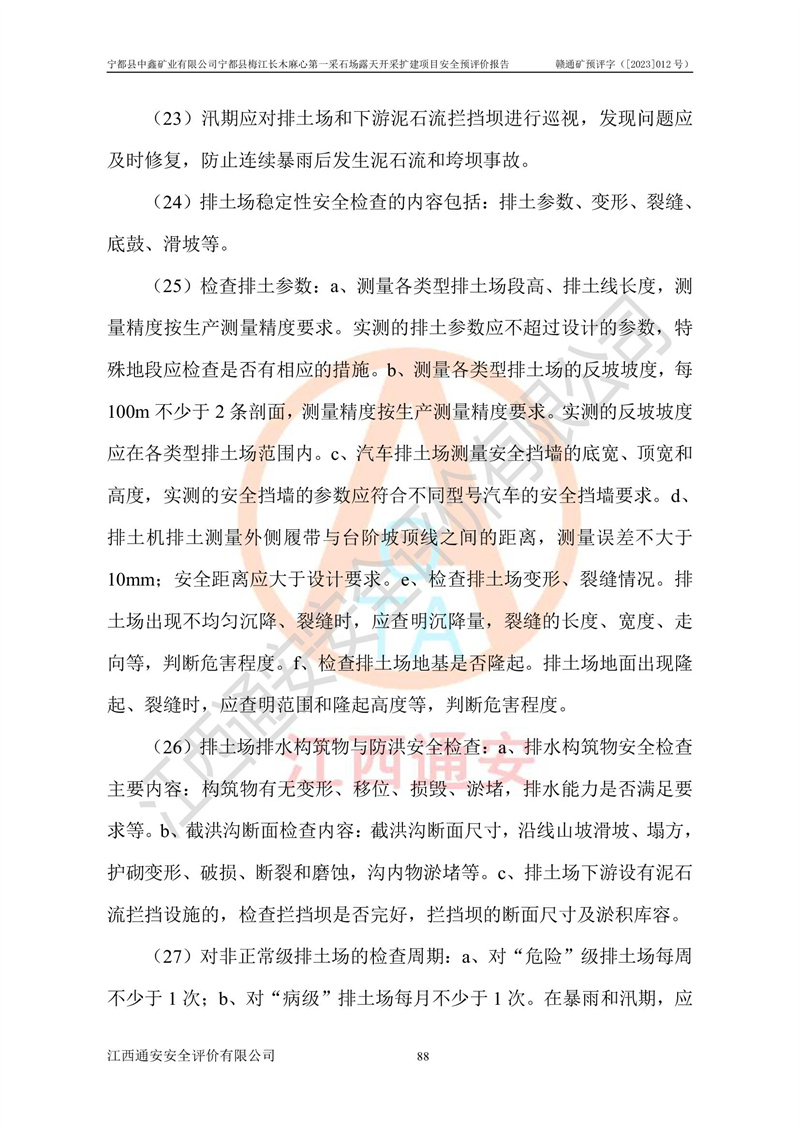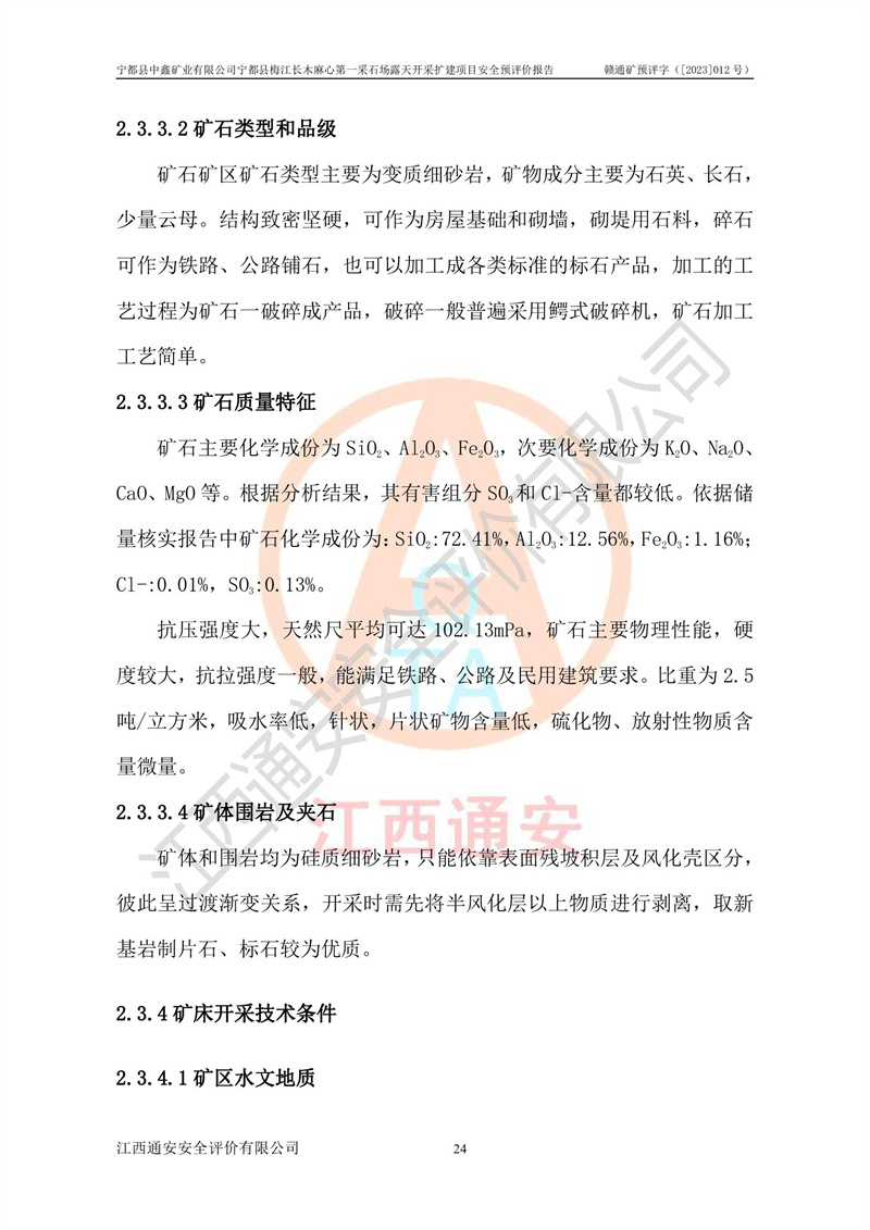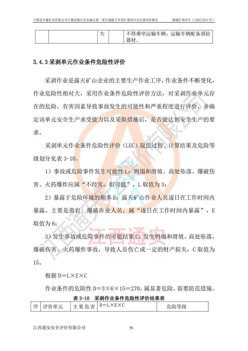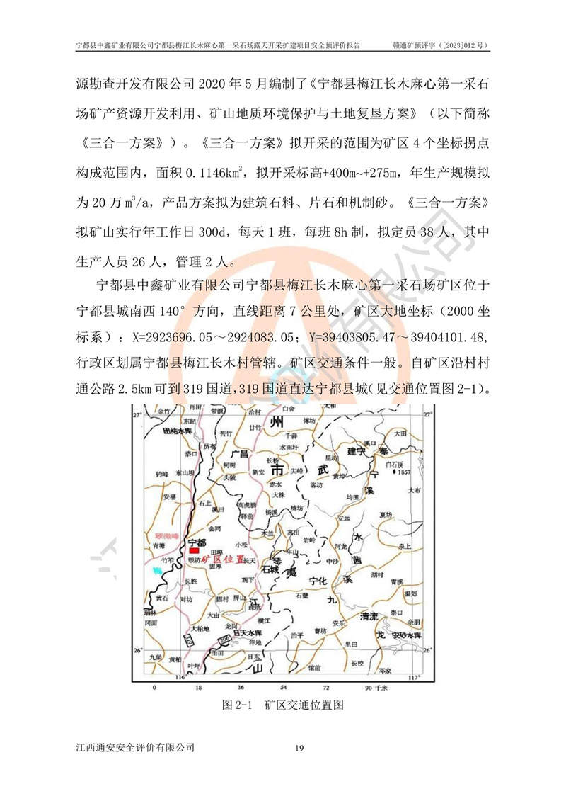 宁都县中鑫矿业有限公司宁都县梅江长木麻心**采石场矿区位于宁都县城南西140°方向,直线距离7**处,矿区大地坐标(2000坐标系):X=2923696.05~2924083.05;Y=39403805.47~39404101.48,行政区划属宁都县梅江长木村管辖。矿区交通条件一般。自矿区沿村村通公路2.5km可到319国道,319国道直达宁都县城。 宁都县中鑫矿业有限公司宁都县梅江长木麻心**采石场此次扩建,原矿区范围由4个拐点圈定,矿区面积0.1146km2,开采面积不变;原设计开采深度+400m~+340m标高,扩深至开采深度+400m~+275m,原开采规模4.9万m3/a(12.25万t/a),扩大至20万m3/a(50万t/a)。 现宁都县梅江长木麻心**采石场采矿权人为宁都县中鑫矿业有限公司,采矿许可证证号C3607302010067120067834,**期2022年12月23日至2023年12月23日。矿区范围由4个拐点圈定,矿区面积0.1146km2,开采深度+400m~+275m标高,开采矿种为建筑用花岗岩,露天开采方式,生产规模20万m3/a。矿山现在属于正常生产矿山,安全生产许可证编号:(赣)FM安许证字[2020]B0126,**期2020年10月26日至2023年10月25日,单位名称:宁都县梅江长木麻心**采石场,主要负责人:李学辉,单位地址赣州市宁都县梅江镇长木村麻心小组,经济类型:私营企业,允许开采深度:+400m~+340m,开采矿种:建筑用花岗岩,开采方式:露天开采,生产规模:4.9万m3/a,设计开采台阶:+390m、+375m、+360m、+350m、+340m等5个台阶,台阶**15m/10m,工作台阶坡面角70°,*终境界边坡角58°。 本项目已经符合编制安全预评价的前置条件。根据《中华人民共和国安全生产法》和《扩建项目安全设施“三同时”监督管理办法》的规定,宁都县中鑫矿业有限公司宁都县梅江长木麻心**采石场于2023年8月委托本公司对宁都县中鑫矿业有限公司宁都县梅江长木麻心**采石场扩建项目进行安全预评价。我公司接受委托后组建了评价项目组,2023年8月31日组织项目评价组人员到项目现场进行勘查,收集矿山安全管理和安全预评价所需的有关资料。 宁都县中鑫矿业有限公司宁都县梅江长木麻心**采石场扩建项目中存在的主要危险因素:滑坡和坍塌、爆破伤害、**伤害、高处坠落、物体打击、触电、机械伤害、 起重伤害、火灾、水灾、容器爆炸、中毒和窒息。本评价项目应重点防范的危险因素:滑坡和坍塌、爆破伤害、**伤害、高处坠落、机械伤害。宁都县中鑫矿业有限公司宁都县梅江长木麻心**采石场扩建项目从安全生产角度符合**有关安全生产法律、法规、规章、标准和规范的要求,风险可以接受。 |