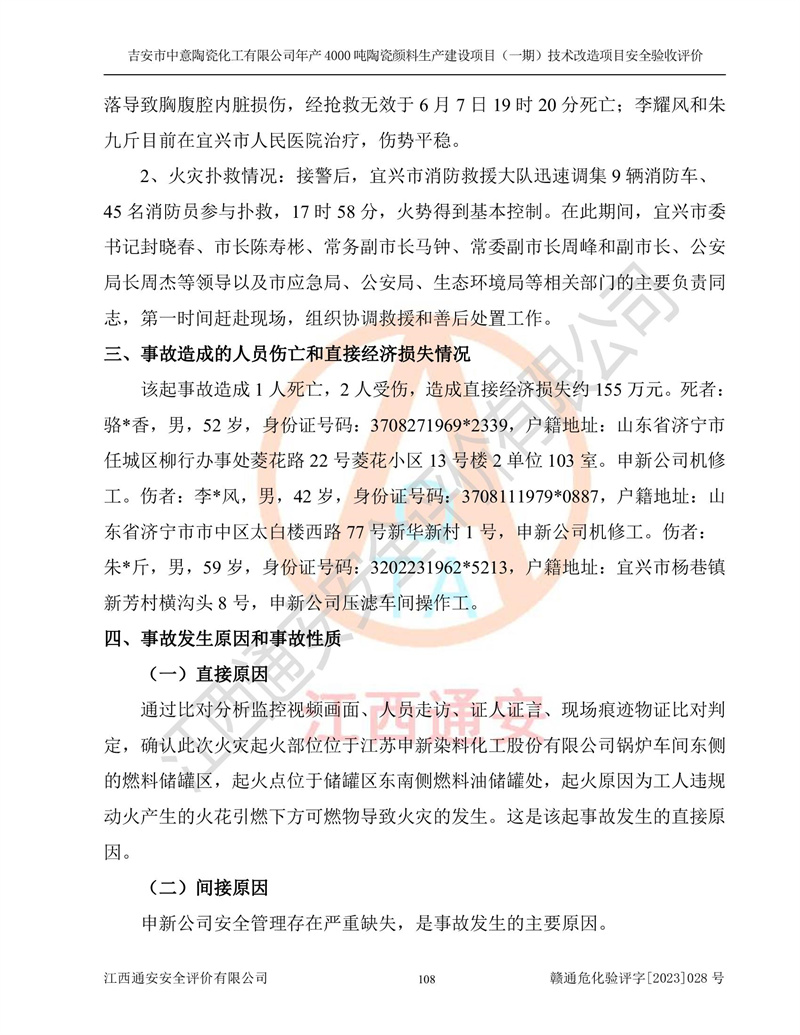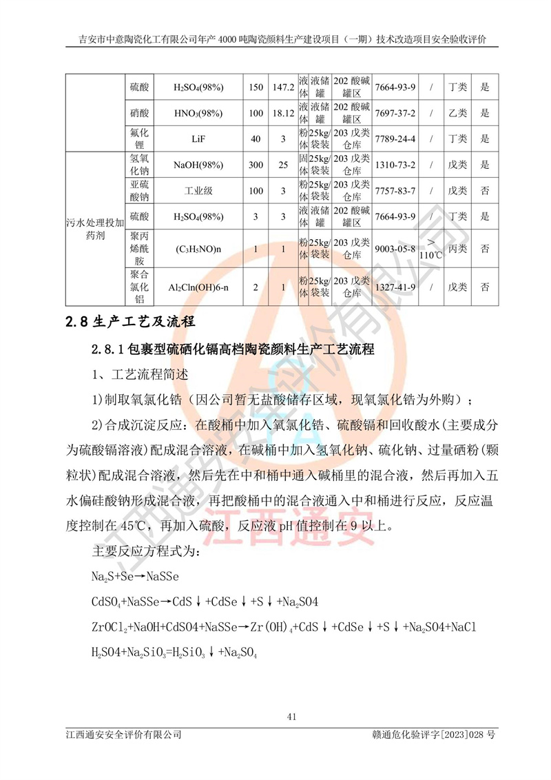 项目简介 | 吉安市中意陶瓷化工有限公司(以下简称“公司”)位于江西省吉安市新干县盐化工业城,于2011年08月15日注册成立,注册资金2666万元,统一社会信用代码:91360800578791603W,法人**李爱飞,属有限责任公司(自然人投资或控股),经营范围:陶瓷化工产品生产销售。(涉及许可的凭许可证生产经营;**法律、法规另有规定的除外;涉及《外商投资产业指导目录》限制类、禁止类项目除外)。 公司于2022年03月17日取得新干县工业和信息化局印发的《江西省工业企业技术改造项目备案通知书》(统一项目代码:2203-360824-07-02-853961),项目名称:吉安市中意陶瓷化工有限公司年产4000吨陶瓷颜料生产建设项目(一期)技术改造项目。 公司于2022年3月编制了《吉安市中意陶瓷化工有限公司年产4000吨陶瓷颜料生产建设项目(一期)技术改造项目安全生产条件和设施综合分析报告》。 公司于2022年6月委托黑龙江龙维化学工程设计有限公司编制《吉安市中意陶瓷化工有限公司年产4000吨陶瓷颜料生产建设项目(一期)技术改造项目安全设施设计》并于2022年6月22日通过了安全设施设计专家评审; | |||