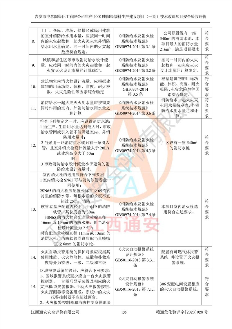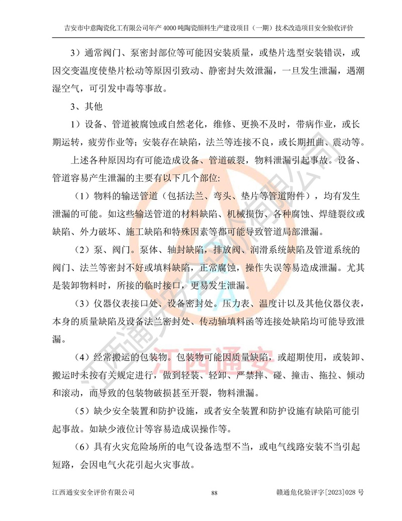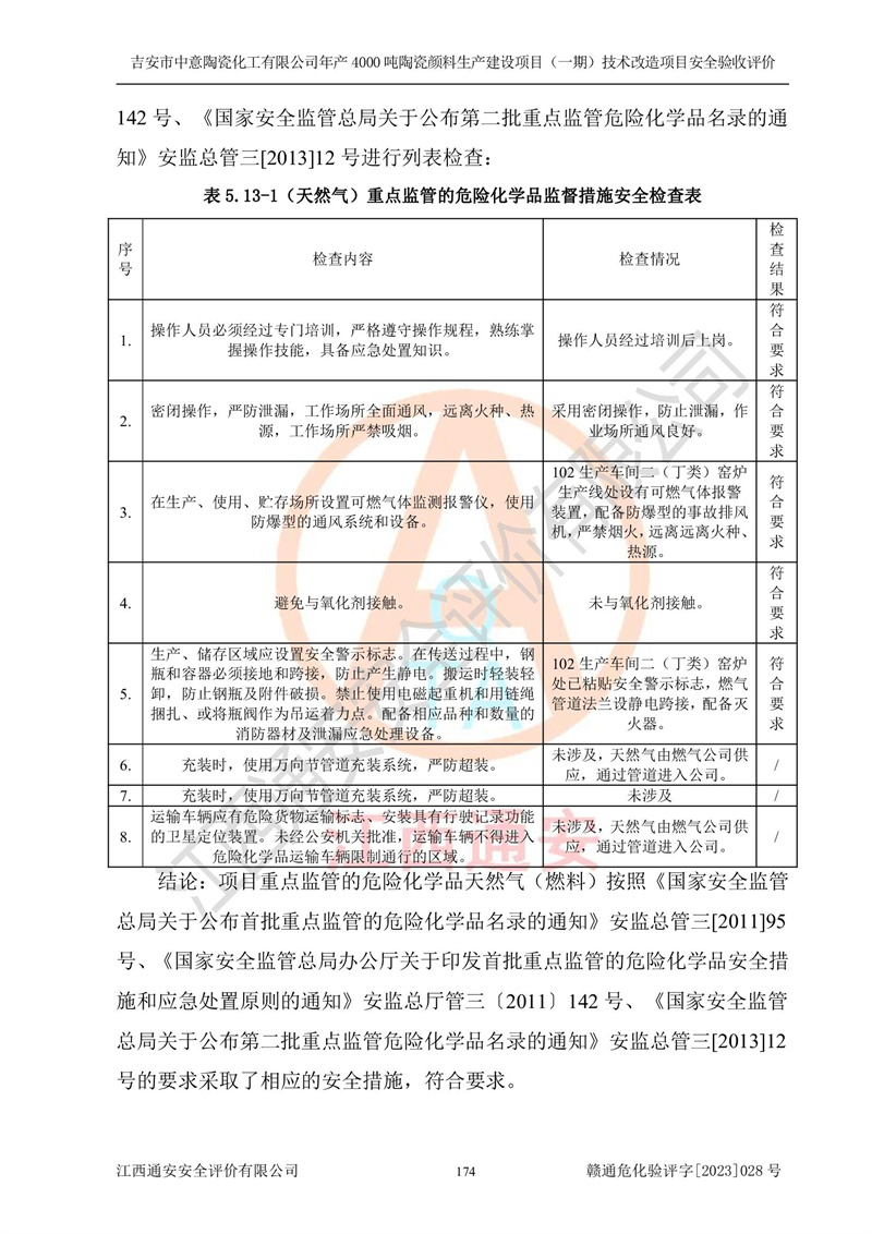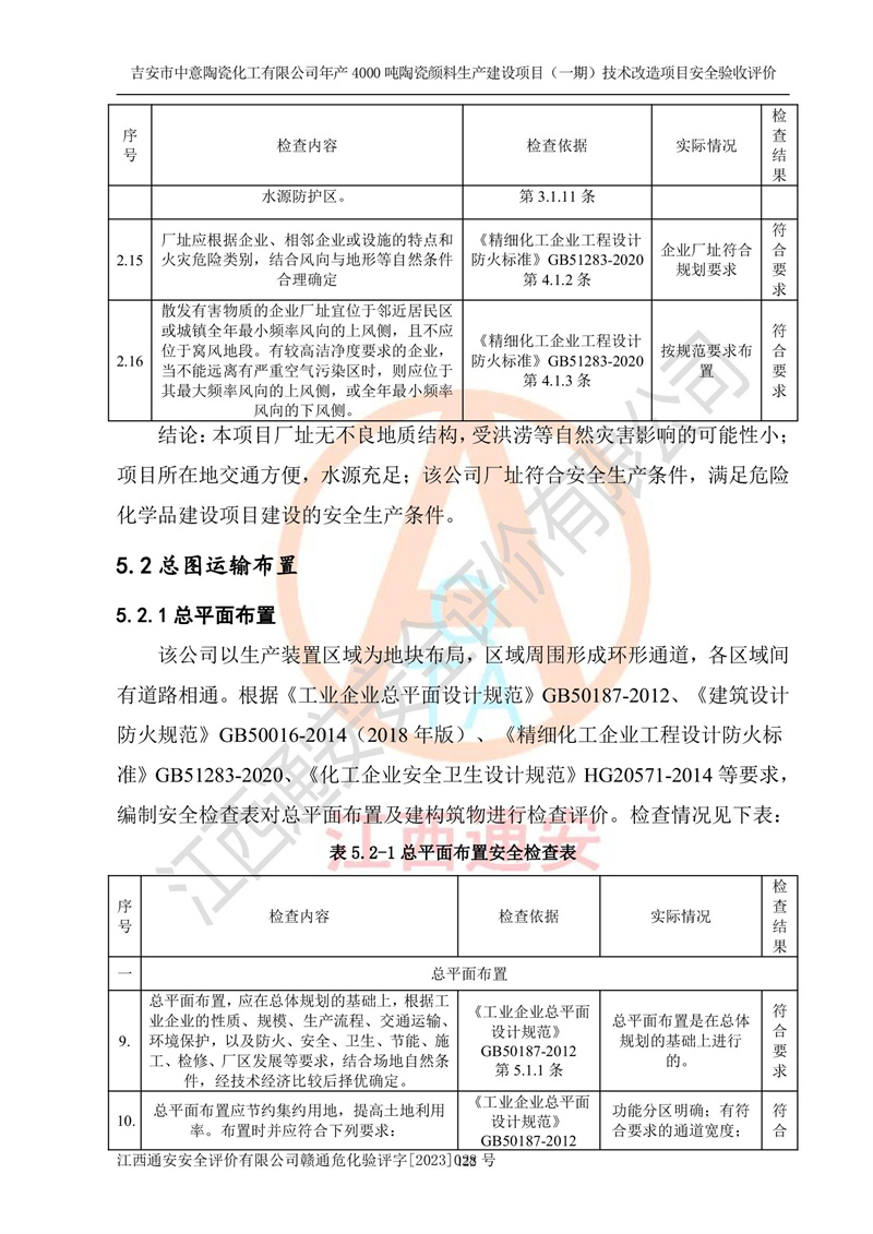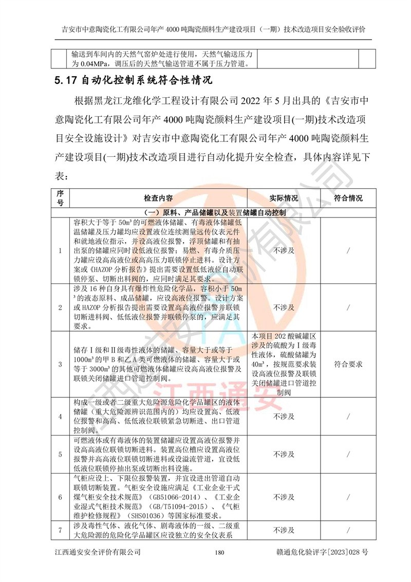 评价结论 | 吉安市中意陶瓷化工有限公司年产4000吨陶瓷颜料生产建设项目(一期)技术改造项目符合新干县盐化工业城发展规划的布局;总平面布置符合《建筑设计防火规范》GB50016-2014(2018年版)等标准、规范的要求;该公司采用成熟的生产工艺和设备,本质安全程度较高;该公司对生产过程中存在事故危险的设施和场所采取了一系列的合理可行的防护措施和科学的管理,近期通过对存在的安全问题进行了整改,主要安全缺陷基本消除,使生产过程中的危险有害因素能得到**控制。建设项目安全设施符合**现行有关法律、法规、标准的要求。 评价结论:本报告认为,吉安市中意陶瓷化工有限公司年产4000吨陶瓷颜料生产建设项目(一期)技术改造项目生产装置现场情况与设计图纸一致,安全设施正常投用并运行正常,自动控制设置满足《江西省应急管理厅关于印发《江西省化工企业自动化提升实施方案》(试行)的通知》赣应急字[2021]190号的要求,安全设施及安全管理符合**及有关部门关于安全生产法律、法规、标准的要求,安全风险程度是可以接受的,安全风险可控,符合安全生产条件,能够满足安全生产的要求,具备安全设施“三同时”验收条件。 | |||
