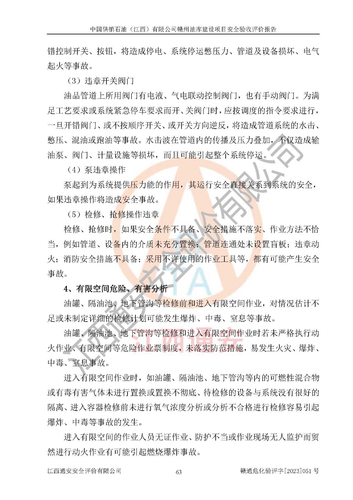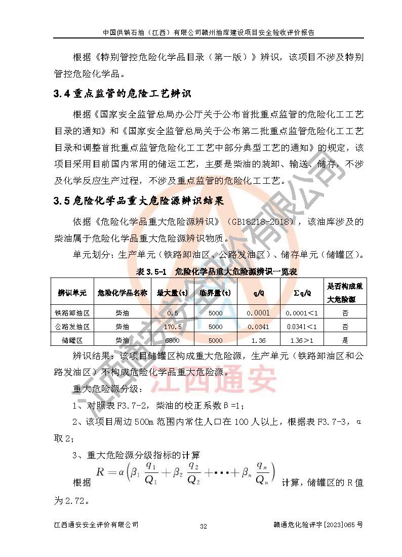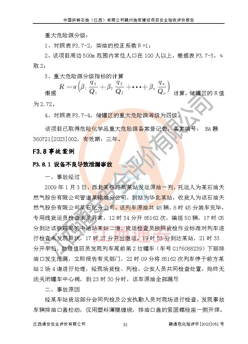 项目简介 | 中国供销石油(江西)有限公司赣州油库成立于2023年5月24日,位于江西省赣州市赣县区梅林镇,主要从事成品油批发。本项目油库由中国供销石油(江西)有限公司赣州油库承租,并负责油库后期运营及管理。 根据2023年5月30日赣州市自然资源局出具的《关于南昌铁路局赣县运用车间铁路油库用地现状的回复》,经核实,该项目用地类型均为铁路用地。经查询不动产登记中心直属三所,该项目用地红线范围内权属为中国铁路南昌局集团有限公司。江西京九物流有限公司(专门负责南昌局集团公司资产租赁业务的全资子公司)与中国供销石油(江西)有限公司签定了《铁路油库场地及配套设施租赁协议》并进行了说明,说明中明确:中国供销石油(江西)有限公司具备赣州铁路油库场地使用权。 本项目油库为早期建设项目,现由中国供销石油(江西)有限公司赣州油库租赁并运营。根据《危险化学品目录》(2022调整版),本项目经营储存的主要物料柴油属于危险化学品,需要申请办理危险化学品经营许可证。因经营主体发生变化,根据有关规定,新的经营者需要重新对本项目以新项目进行立项并进行安全三同时。中国供销石油江西有限公司赣州油库建设项目2023年5月31日取得了项目备案通知书,委托江西赣安安全生产科学技术咨询服务中心编制了项目安全条件评价报告,并取得了安全条件审查的批复,委托海湾工程有限公司编制了项目安全设施设计,并取得了安全设施设计审查的批复。 本项目位于江西省赣州市赣县梅林镇双龙村赣州东机务折返段内。该油库占地面积约20000m2,油库储运油品为柴油,卸油方式为铁路进油,内设2000m2地上立式固定顶油罐4座,总容量8000m3,出油通过管道供给公路发油区装卸设施。该油库西北面设有卸油**线(设两条卸车线),1处卸油栈桥,栈桥上设有卸油鹤管6个。根据《石油库设计规范》(GB 50074-2014)第3.0.1条,柴油为丙A类液体,容量乘以系数0.5计入储罐计算总容量;该油库储罐计算总容量TV为4000m3,为四级石油库,库内设有公路发油区。 该项目经营过程中涉及的物料为柴油属于危险化学品。经辨识,该项目不涉及监控化学品、易制毒化学品、易制爆危险化学品、剧毒化学品、高毒物品、重点监管的危险化学品和特别管控危险化学品,不涉及重点监管的危险化工工艺,储罐区构成四级危险化学品重大危险源。根据生产工艺特点及物料的理化特性可知,该项目生产过程中存在火灾、爆炸、中毒与窒息、触电、机械伤害等危险因素。 | ||||||