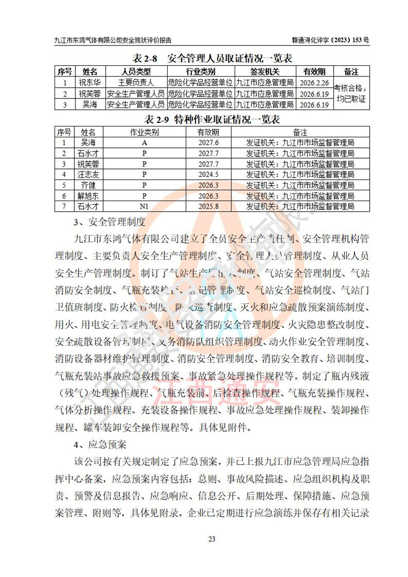 评价报告名称 | 九江市东鸿气体有限公司安全现状评价报告 | ||||||