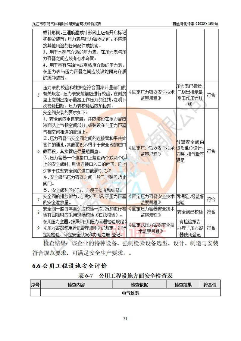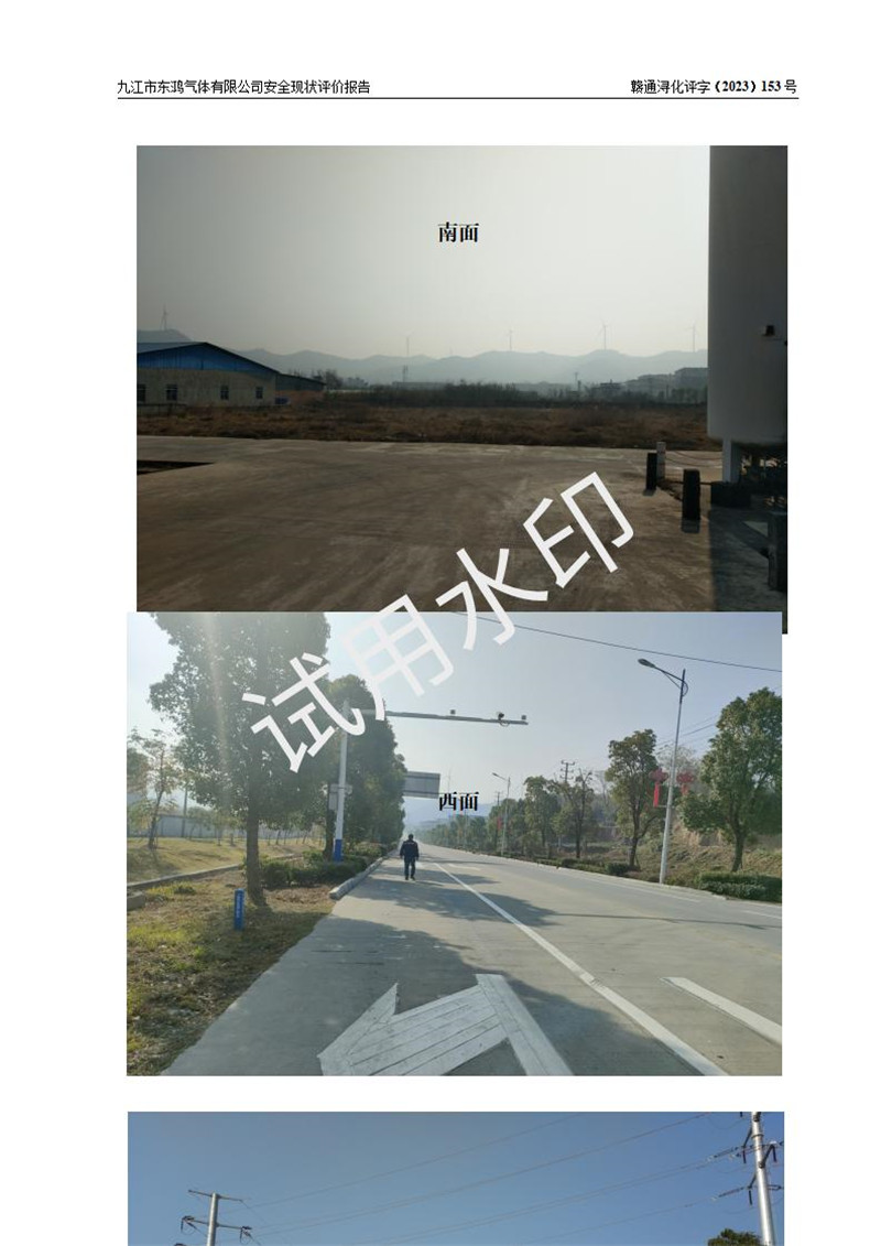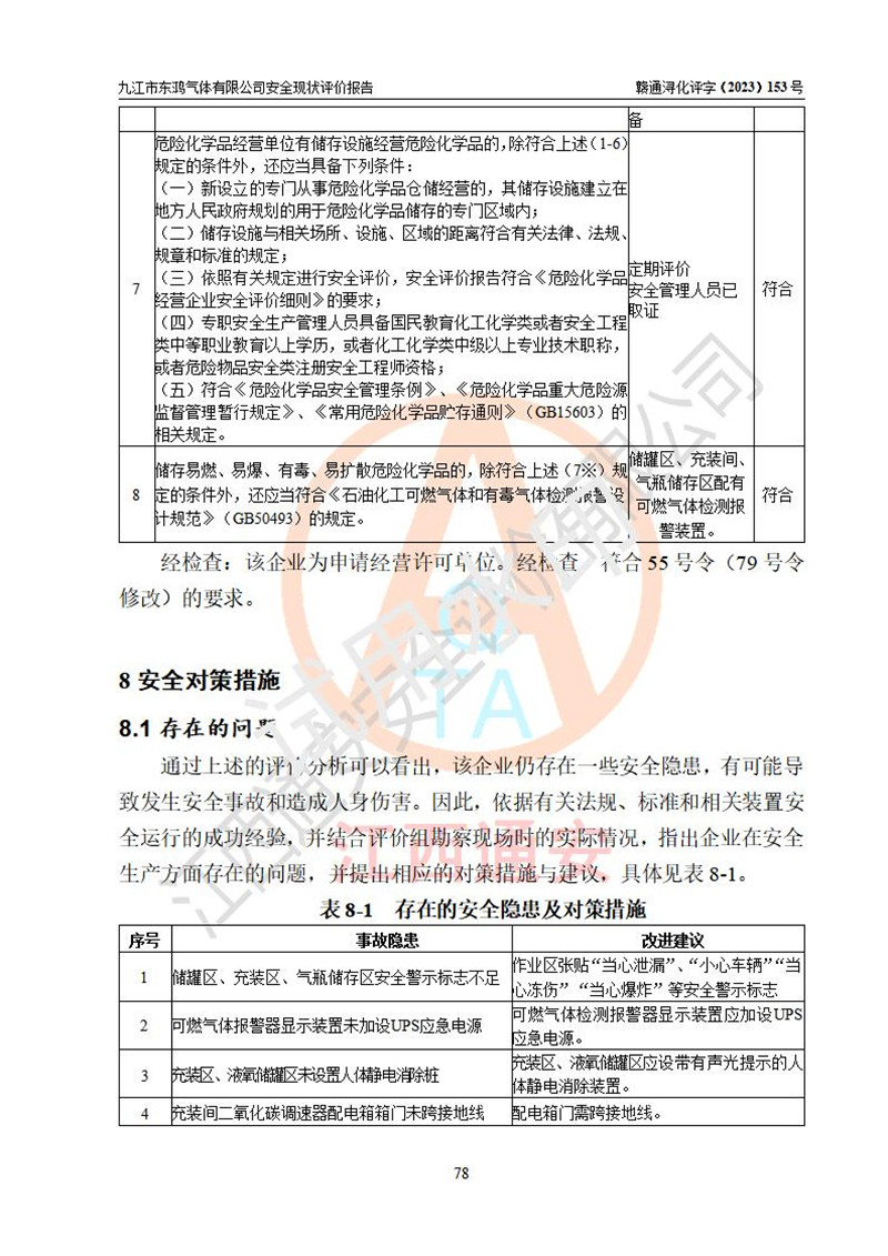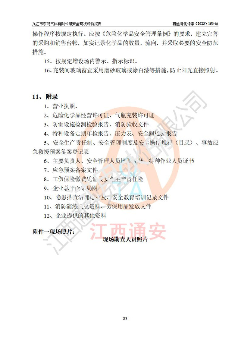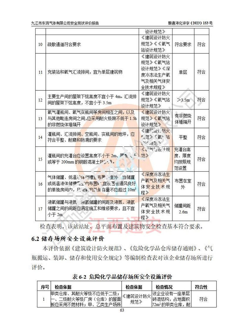 评价结论 | 综上所述:九江市东鸿气体有限公司外部防护距离和总平面布局符合《建筑设计防火规范2018年版》(GB50016-2014 )、《氧气站设计规范》(GB50030-2013)等标准规范要求,其他方面按相关法规、规范要求采取了相应的技术设施和安全管理措施,其风险可控,能达到可以接受的程度,可满足安全生产条件。 | ||||||