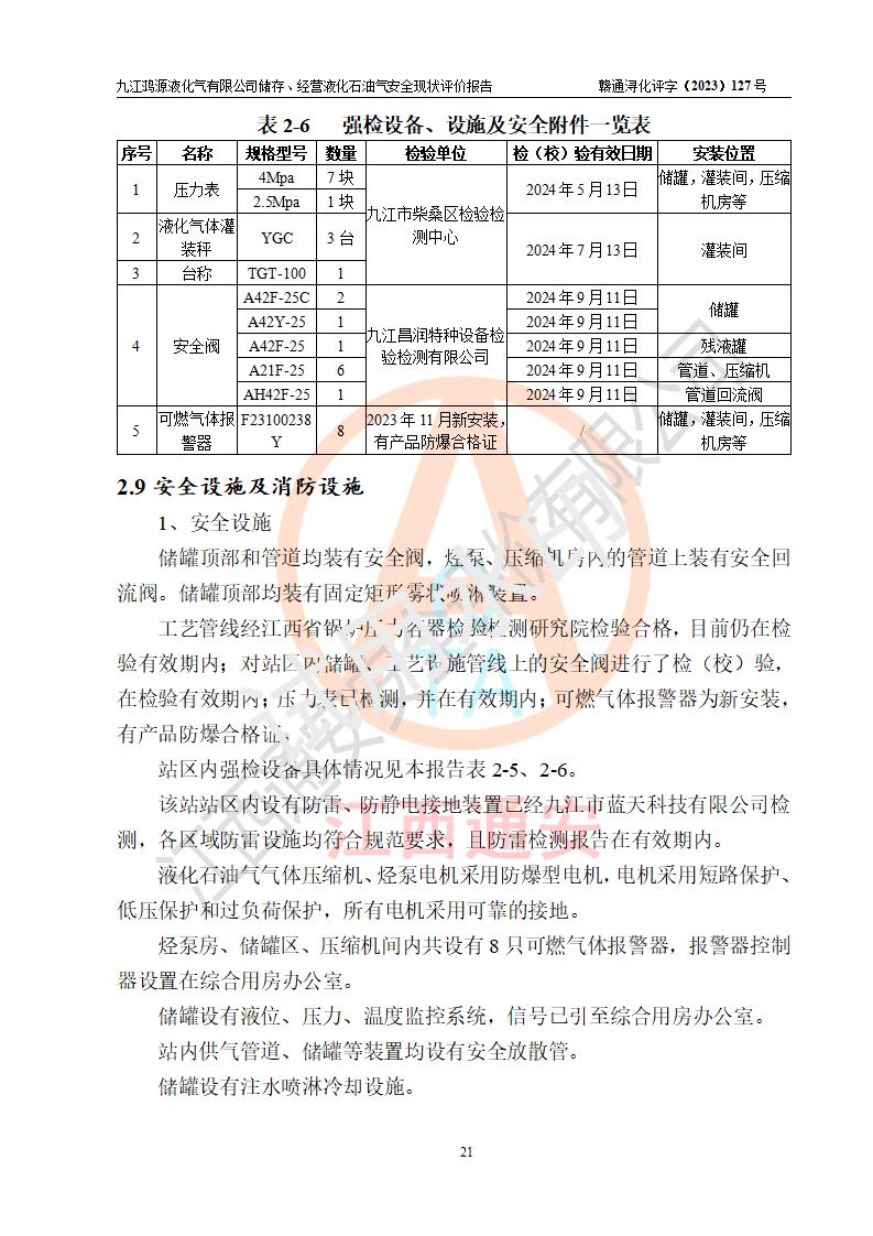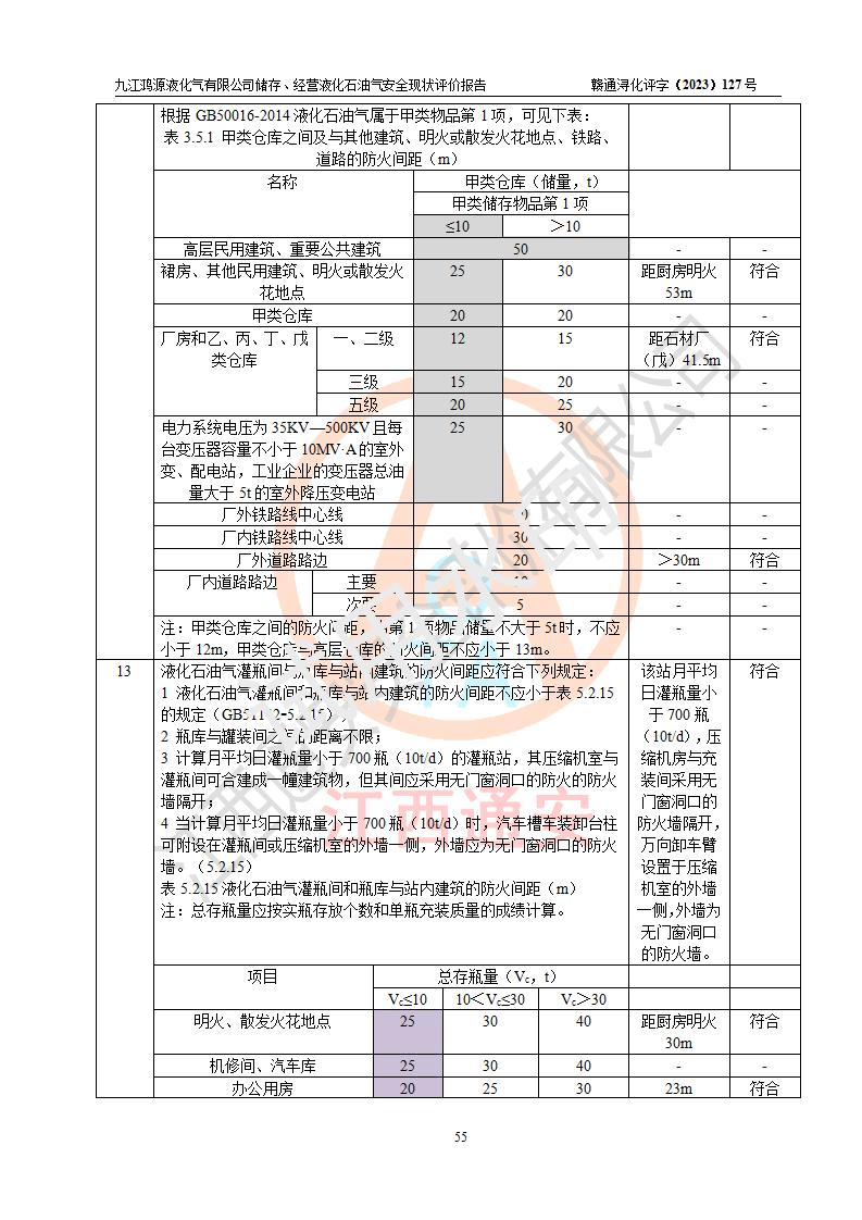 评价结论 | 综上所述:九江鸿源液化气有限公司储存、经营液化石油气站涉及的安全条件、安全生产条件、安全生产管理、应急管理符合**相关法律、法规、标准的要求,采取了相应的技术设施和安全管理措施,其风险可控,能达到可以接受的程度,可以满足液化石油气经营安全条件。 | ||||||
