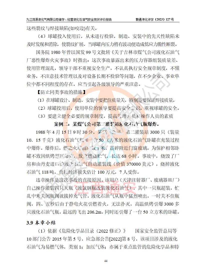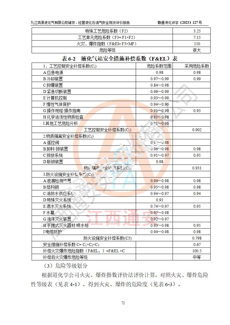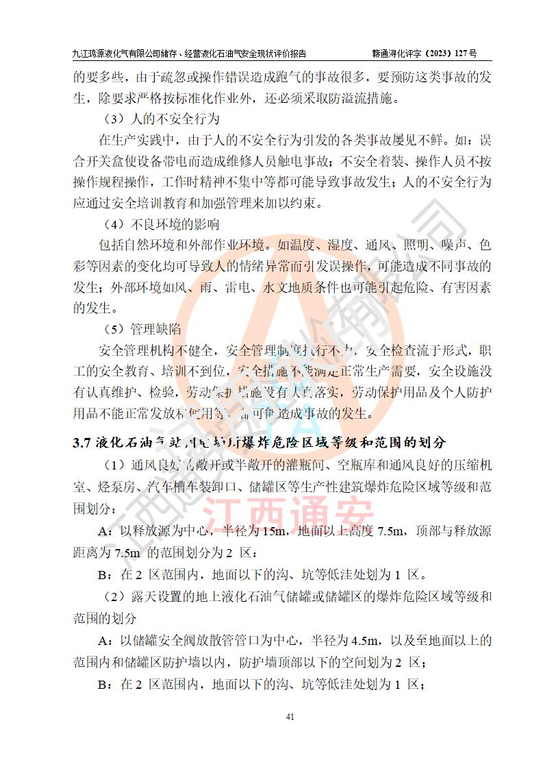 项目简介 | 九江鸿源液化气有限公司成立于2005年12月23日,原注册名称为九江县长岭液化气有限公司,原注册住所(经营场所)为江西省九江市九江县涌泉乡锣鼓村,于2018年06月07日在九江市柴桑区市场和质量监督管理局办理变更登记,现改名为九江鸿源液化气有限公司,住所(经营场所)为江西省九江市柴桑区涌泉乡锣鼓村。该公司是一家储存、经营石油液化气的有限责任公司,法定**人:雷素新,经营范围:燃气经营(依法须经批准的项目,经相关部门批准后方可开展经营活动,具体经营项目以相关部门批准文件或许可证件为准)一般项目:特种设备销售(除许可业务外,可自主依法经营法律法规非禁止或限制的项目),注册及经营地址位于江西省九江市柴桑区涌泉乡锣鼓村,占地面积约3292.8m2。现有员工15人,其中安全管理人数1人,主要负责人桂训红。站区内现有50m3卧式储罐1台、24m3卧式储罐2台,5.0m3的残液罐1台及相关的配套设备设施,站区内储罐总容积(含5m3残液罐)为103m3,按现行《液化石油气供应工程设计规范》GB51142-2015对液化石油气站的等级划分,该站属六级液化石油气站。 该站在经营过程中涉及的液化石油气为危险化学品,属首批重点监管的危险化学品、特别管控的危险化学品。根据《燃气系统运行安全评价标准》GB/T50811-2012、《城镇燃气管理条例》(***令第583号公布、第666号修改)等规定,燃气经营企业在生产经营活动期间,应定期开展安全评价工作,建立健全燃气安全评估和风险管理体系,发现燃气安全事故隐患的,应当及时采取措施消除隐患。为此,九江鸿源液化气有限公司委托江西通安安全评价有限公司对该站的现状进行安全评价。 江西通安安全评价有限公司接受委托后,组成了评价组,于2023年10月进行了现场勘察,对委托方储存、经营燃气设施的安全条件及安全管理进行了充分的了解,查找了其存在的危险、有害因素种类和危害程度,对存在的问题,评价组成员和委托方的陪同人员进行了及时的沟通,并提出了整改措施;按照《安全评价通则》(AQ8001-2007)、《城镇燃气管理条例》及《燃气系统运行安全评价标准》等标准的要求,依据**有关法律法规、标准规范,采用合适的安全评价方法,经过定性分析与定量计算,编制完成了本安全评价报告,作为企业安全生产技术与安全生产管理决策提供安全技术依据。 本次安全评价范围,九江鸿源液化气有限公司储存、经营液化石油气站区范围内燃气设施及安全管理方面的安全现状。即液化石油气的储存及装、卸车和灌装小钢瓶作业所涉及的危险品安全经营作业条件以及工艺、设备设施的安全可靠性及符合性的评价。包括安全管理的组织、机构、人员、防护设施、作业环境及安全管理等。 液化石油气站外运输及其站内运输**不在评价范围内。涉及项目工程的环境保护、消防、职业卫生及施工安全等问题均执行**的有关规定及相关标准,本评价引用到的**、消防、职业卫生方面的法规标准与安全评价有**的关联,环境保护、职业卫生与消防应以其主管部门审核意见为准。 | ||||||