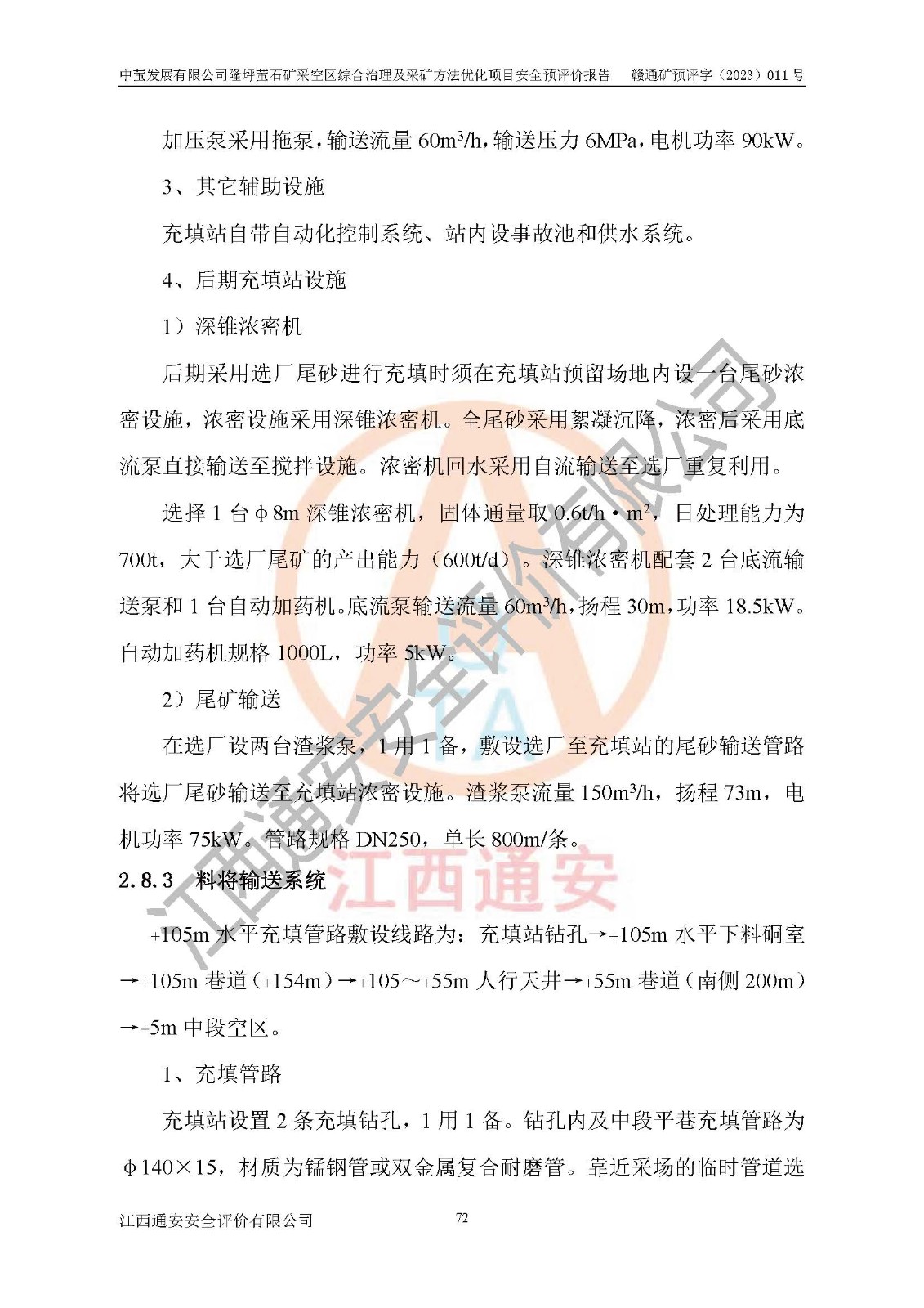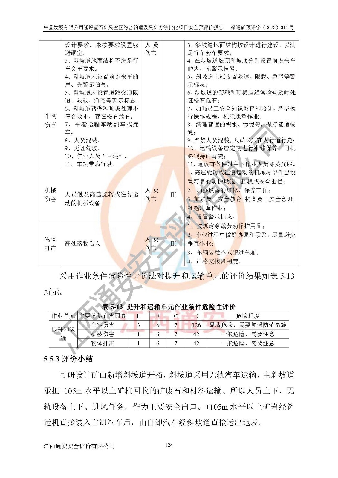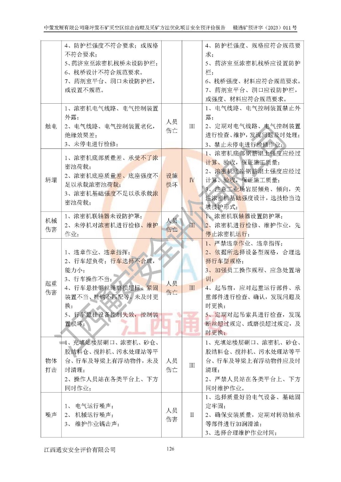 其它 | 1、该评价项目中存在的主要危险因素:滑坡坍塌、机械伤害、高处坠落、触电(雷击)、炸药爆炸、爆破伤害、冒顶片帮、起重伤害、**伤害、中毒窒息、物体打击、透水、淹溺、火灾等危险等级为Ⅲ~IV级;、粉尘、噪声与振动、高低温、γ辐射危害等级为Ⅱ;另外矿区还存在腐蚀、采光照明不良等危险、有害因素。 其中建设项目应重点防范的重大危险、有害因素有滑坡坍塌、机械伤害、高处坠落、爆破伤害、冒顶片帮、**伤害、中毒窒息、触电(雷击)、起重伤害等。 2、该矿山为非金属地下矿山,不存在瓦斯突出,非自燃发火危险的矿井,矿区工程及水文地质条件中等。生产场所、压力容器、压力管道未达到临界量,但冲击地压可能构成重大危险源。 建设项目拟定的优化开采方案、采用的采矿工艺及采空区综合治理方法的安全设施基本符合安全生产法律、法规和行业安全技术规程。在建设施工及生产运行中,如能严格执行**有关安全生产法律、法规和有关标准、规范,认真落实设计提出的安全措施,并合理采纳本报告中提出的安全对策措施及建议,项目的主要危险、有害因素可得到较好控制,安全生产风险在可接受范围。中萤发展有限公司隆坪萤石矿采空区综合治理及采矿方法优化项目从安全生产角度符合**有关安全生产法律、法规、规章、标准和规范的要求,风险可以接受。 | ||||