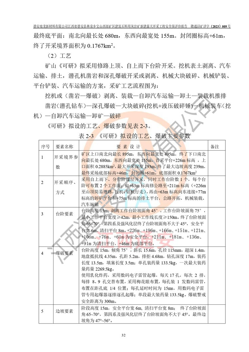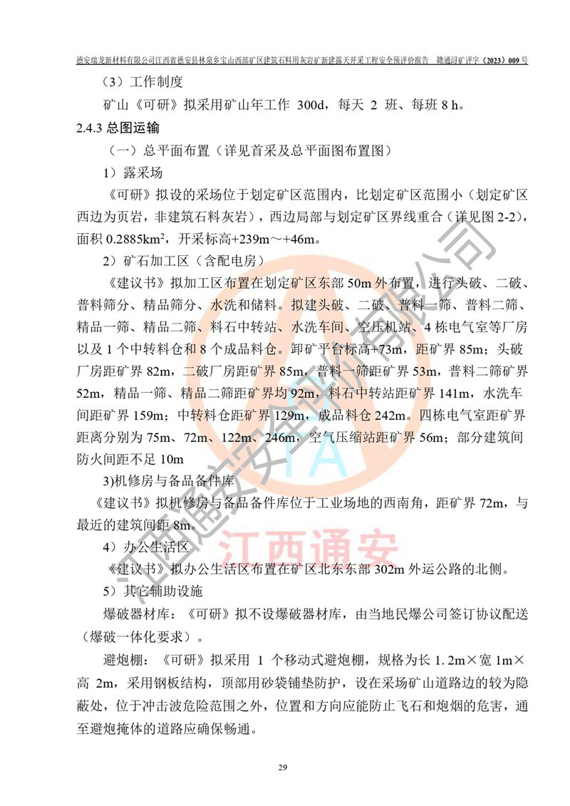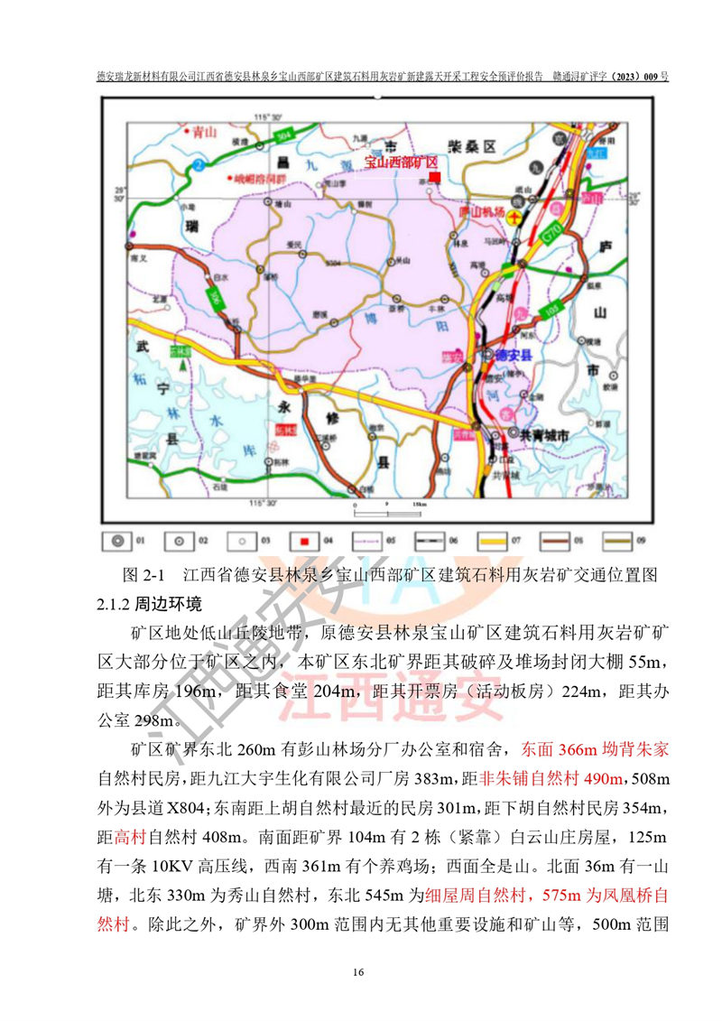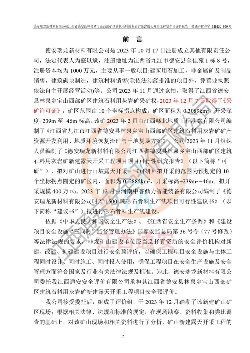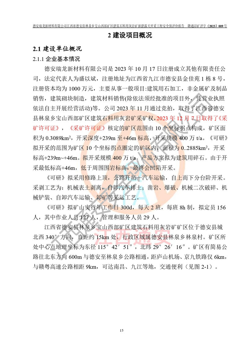 项目简介 | 德安瑞龙新材料有限公司是2023年10月17日注册成立其他有限责任公司,法定**人为盛以斌,注册地址为江西省九江市德安县金佳苑1栋8号,注册资本均为1000万元,主要从事一般项目:建筑用石加工,非金属矿及制品销售,建筑砌块制造,建筑材料销售(除依法须经批准的项目外,凭营业执照依法自主开展经营活动)等。公司2023年11月通过竞拍,取得了江西省德安县林泉乡宝山西部矿区建筑石料用灰岩矿采矿权,2023年12月7日取得了《采矿许可证》,矿区范围由10个坐标拐点构成,矿区面积为0.3089km2,开采深度+239m至+46m标高。该矿2023年2月由江西赣北地质工程勘察有限公司编制了《江西省九江市江西省德安县林泉乡宝山西部矿区建筑石料用灰岩矿矿产资源开发利用、地质环境恢复治理与土地复垦方案》,公司2023年11月组织人员编制了《德安瑞龙新材料有限公司江西省德安县林泉乡宝山西部矿区建筑石料用灰岩矿新建露天开采工程项目项目可行性研究报告》(以下简称“可研”),拟对矿山进行山坡露天开采。《可研》拟开采的范围为预划定的10个坐标拐点圈定的矿区内,面积为0..2885km2,开采标高+239m~+46m。拟开采规模400万t/a。2023年12月由河南中誉鼎力智能装备有限公司编制了《德安瑞龙新材料有限公司时产1500 吨砂石骨料生产线项目可行性建议书》(以下简称“建议书”)拟进行砂石骨料生产线建设 | |||||