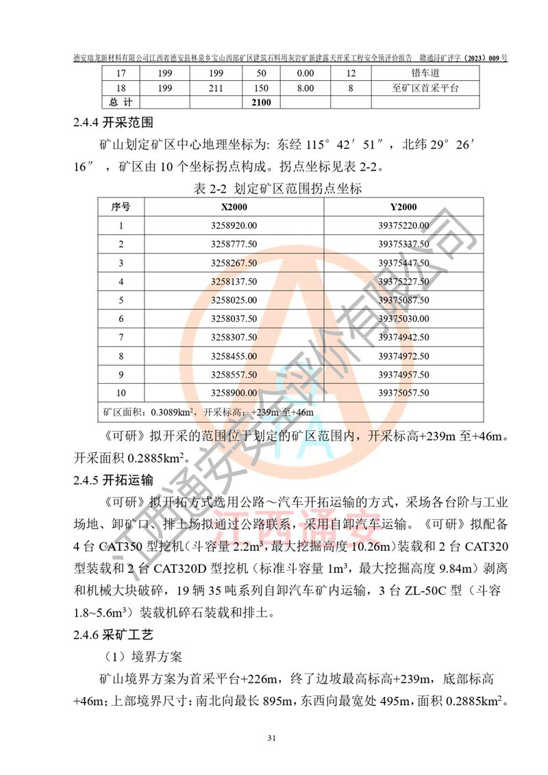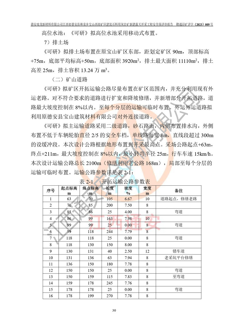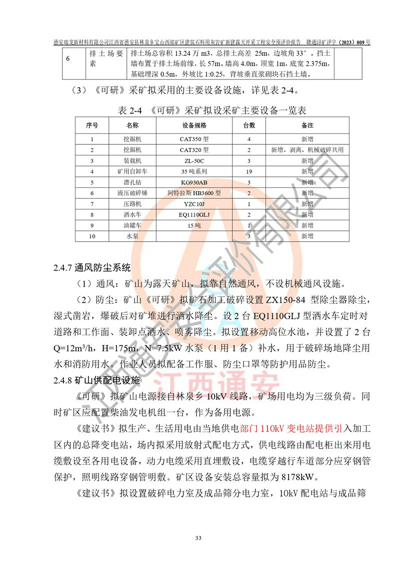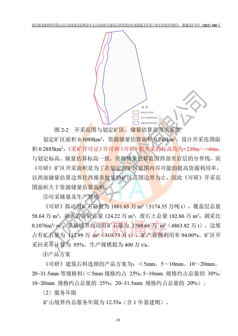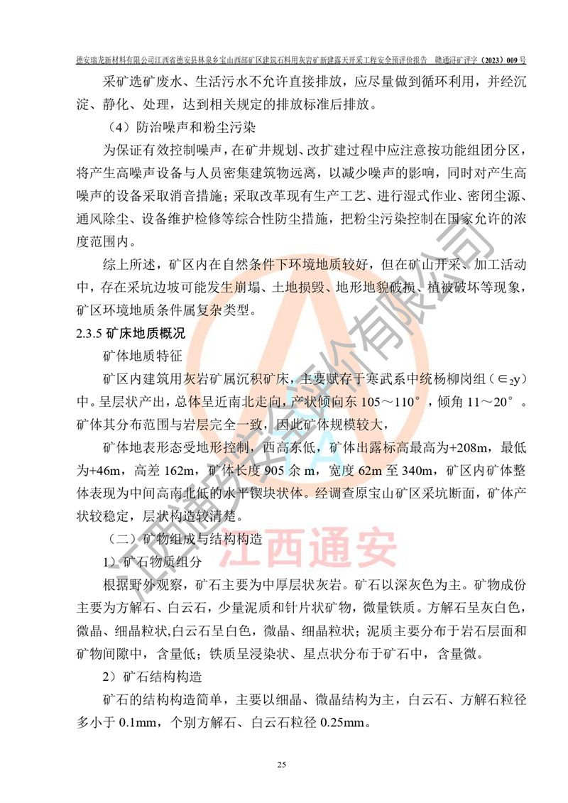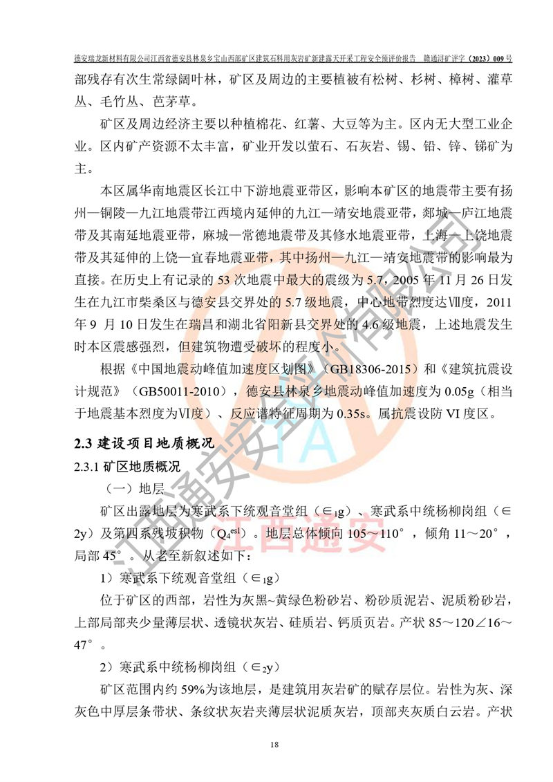 项目简介 | 德安瑞龙新材料有限公司是2023年10月17日注册成立其他有限责任公司,法定**人为盛以斌,注册地址为江西省九江市德安县金佳苑1栋8号,注册资本均为1000万元,主要从事一般项目:建筑用石加工,非金属矿及制品销售,建筑砌块制造,建筑材料销售(除依法须经批准的项目外,凭营业执照依法自主开展经营活动)等。公司2023年11月通过竞拍,取得了江西省德安县林泉乡宝山西部矿区建筑石料用灰岩矿采矿权,2023年12月7日取得了《采矿许可证》,矿区范围由10个坐标拐点构成,矿区面积为0.3089km2,开采深度+239m至+46m标高。该矿2023年2月由江西赣北地质工程勘察有限公司编制了《江西省九江市江西省德安县林泉乡宝山西部矿区建筑石料用灰岩矿矿产资源开发利用、地质环境恢复治理与土地复垦方案》,公司2023年11月组织人员编制了《德安瑞龙新材料有限公司江西省德安县林泉乡宝山西部矿区建筑石料用灰岩矿新建露天开采工程项目项目可行性研究报告》(以下简称“可研”),拟对矿山进行山坡露天开采。《可研》拟开采的范围为预划定的10个坐标拐点圈定的矿区内,面积为0..2885km2,开采标高+239m~+46m。拟开采规模400万t/a。2023年12月由河南中誉鼎力智能装备有限公司编制了《德安瑞龙新材料有限公司时产1500 吨砂石骨料生产线项目可行性建议书》(以下简称“建议书”)拟进行砂石骨料生产线建设 | |||||