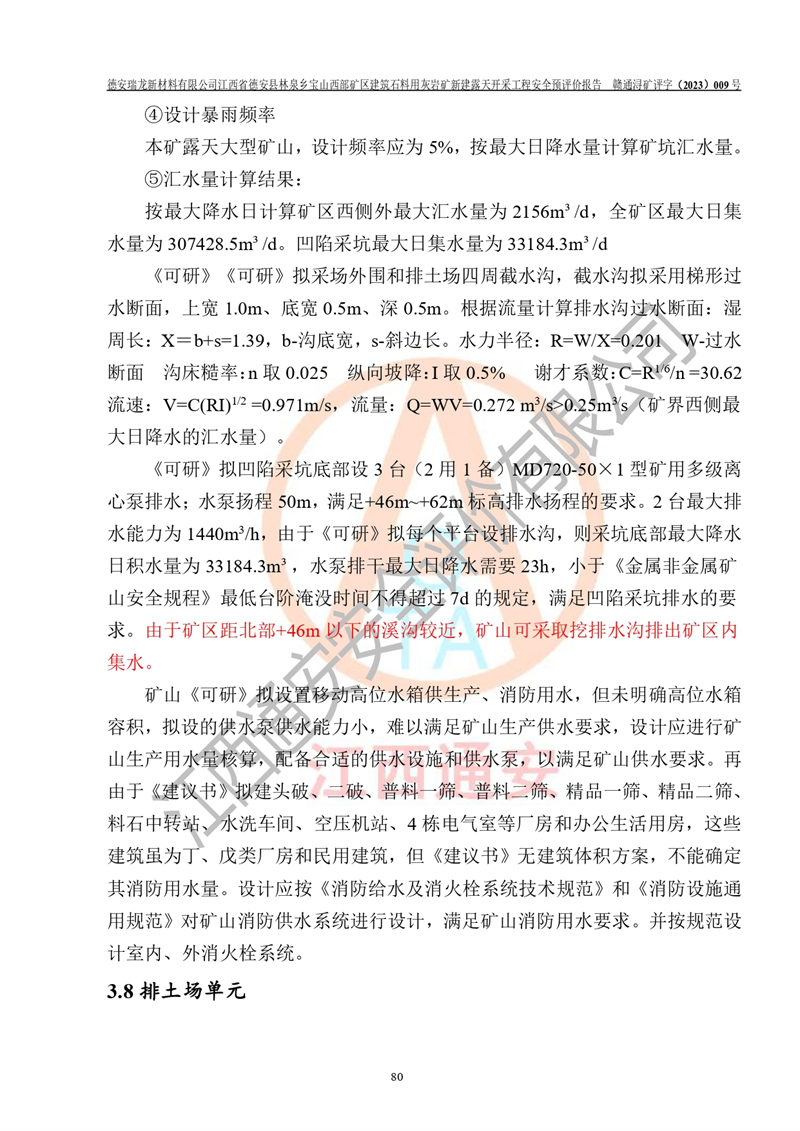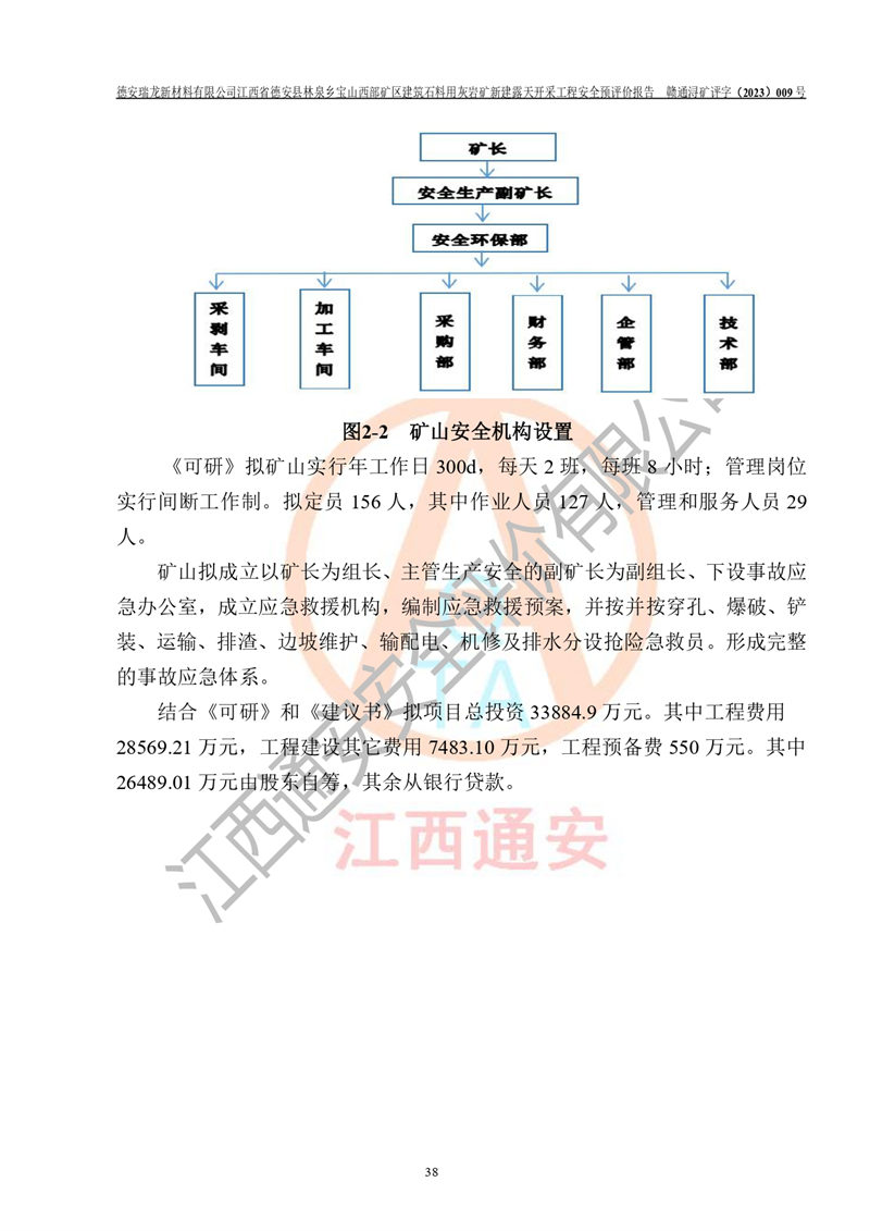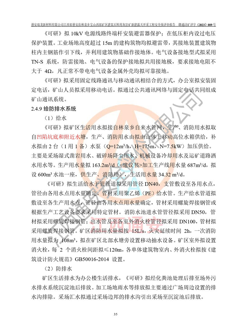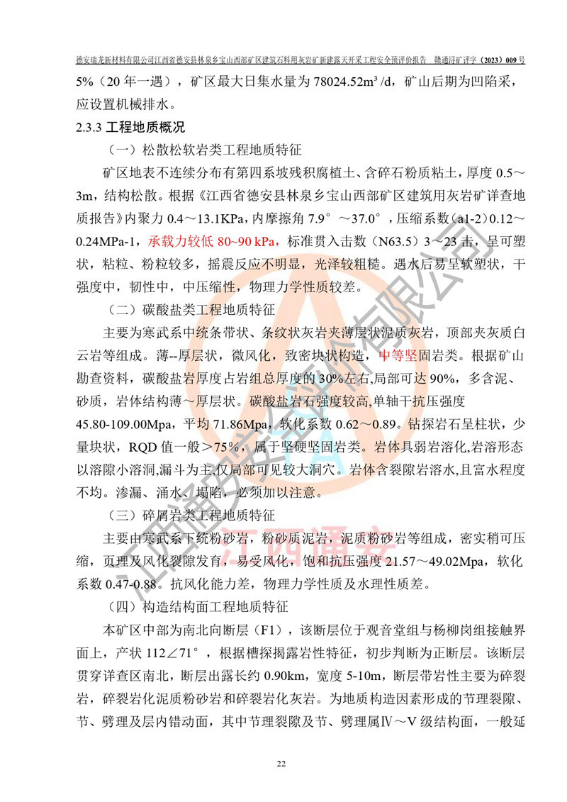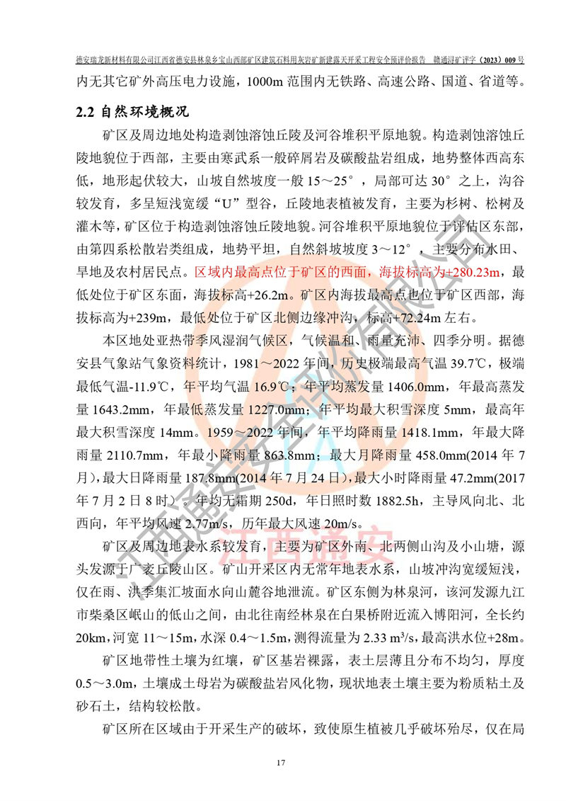 项目简介 | 德安瑞龙新材料有限公司是2023年10月17日注册成立其他有限责任公司,法定**人为盛以斌,注册地址为江西省九江市德安县金佳苑1栋8号,注册资本均为1000万元,主要从事一般项目:建筑用石加工,非金属矿及制品销售,建筑砌块制造,建筑材料销售(除依法须经批准的项目外,凭营业执照依法自主开展经营活动)等。公司2023年11月通过竞拍,取得了江西省德安县林泉乡宝山西部矿区建筑石料用灰岩矿采矿权,2023年12月7日取得了《采矿许可证》,矿区范围由10个坐标拐点构成,矿区面积为0.3089km2,开采深度+239m至+46m标高。该矿2023年2月由江西赣北地质工程勘察有限公司编制了《江西省九江市江西省德安县林泉乡宝山西部矿区建筑石料用灰岩矿矿产资源开发利用、地质环境恢复治理与土地复垦方案》,公司2023年11月组织人员编制了《德安瑞龙新材料有限公司江西省德安县林泉乡宝山西部矿区建筑石料用灰岩矿新建露天开采工程项目项目可行性研究报告》(以下简称“可研”),拟对矿山进行山坡露天开采。《可研》拟开采的范围为预划定的10个坐标拐点圈定的矿区内,面积为0..2885km2,开采标高+239m~+46m。拟开采规模400万t/a。2023年12月由河南中誉鼎力智能装备有限公司编制了《德安瑞龙新材料有限公司时产1500 吨砂石骨料生产线项目可行性建议书》(以下简称“建议书”)拟进行砂石骨料生产线建设 | |||||