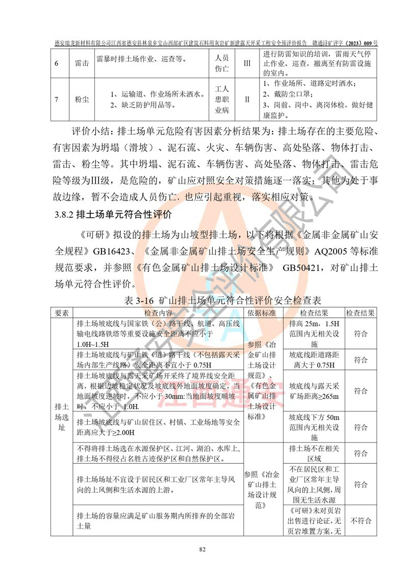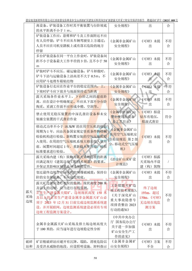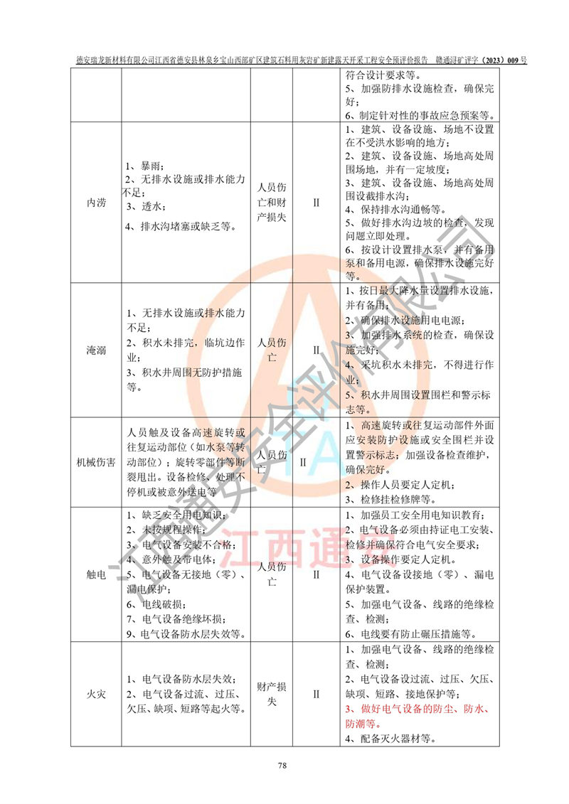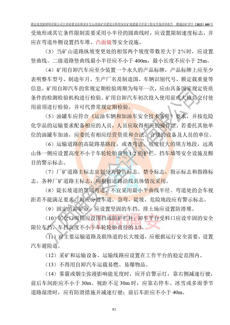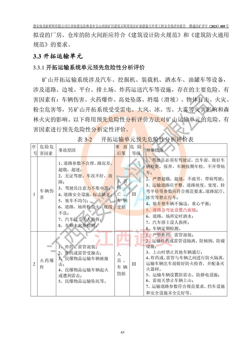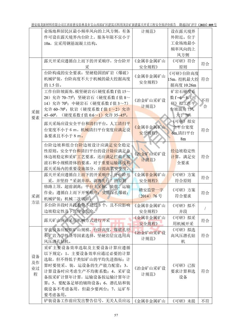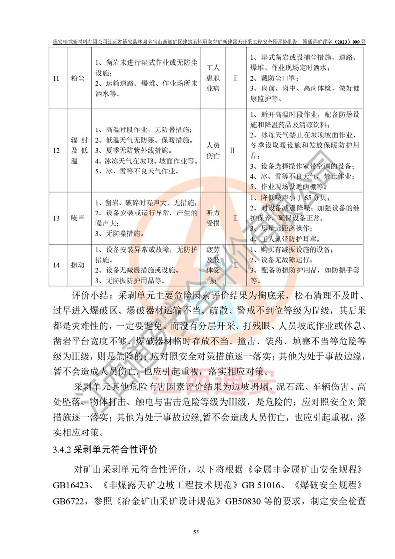 评价结论 | 总体结论:德安瑞龙新材料有限公司江西省德安县林泉乡宝山西部矿区建筑石料用灰岩矿新建露天开采工程项目潜在火药与雷管爆炸、放炮、坍塌(滑坡)、泥石流、触电、火灾、**伤害、高处坠落、物体打击、容器爆炸、机械伤害、中毒与窒息、淹溺、粉尘、高低温、噪声、振动等危险、有害因素,落实《可研》、《建议书》和本报告提出的安全措施和对策,风险可控,能达到可接受范围。 江西省德安县林泉乡宝山西部矿区建筑石料用灰岩矿新建露天开采工程项目露天开采工程落实《可研》、《建议书》和本报告提出的安全措施和对策,能够满足**有关法律、法规、规章、标准和规范的要求,可以进行建设。 | |||||