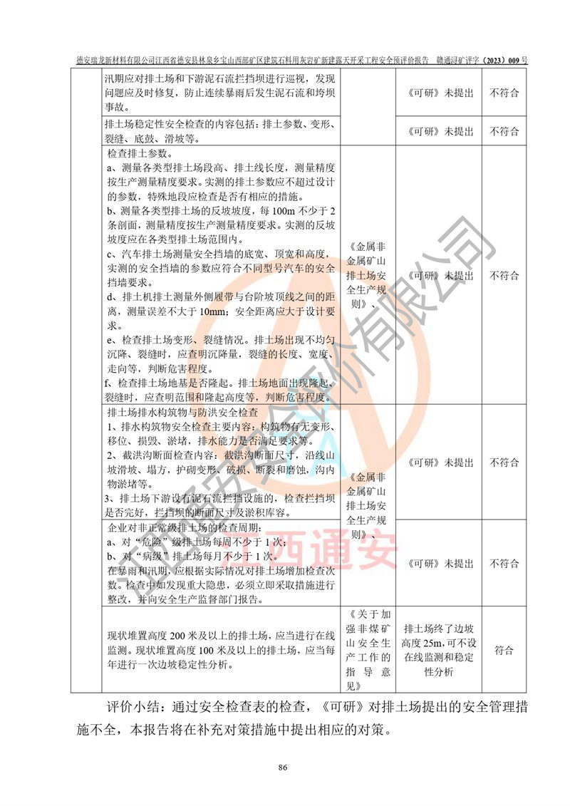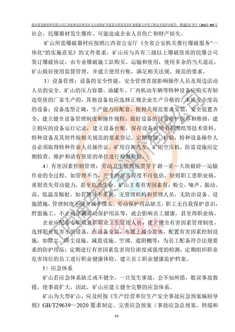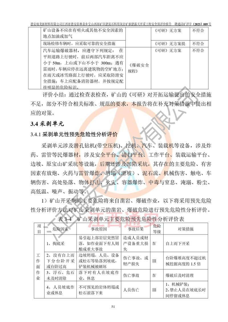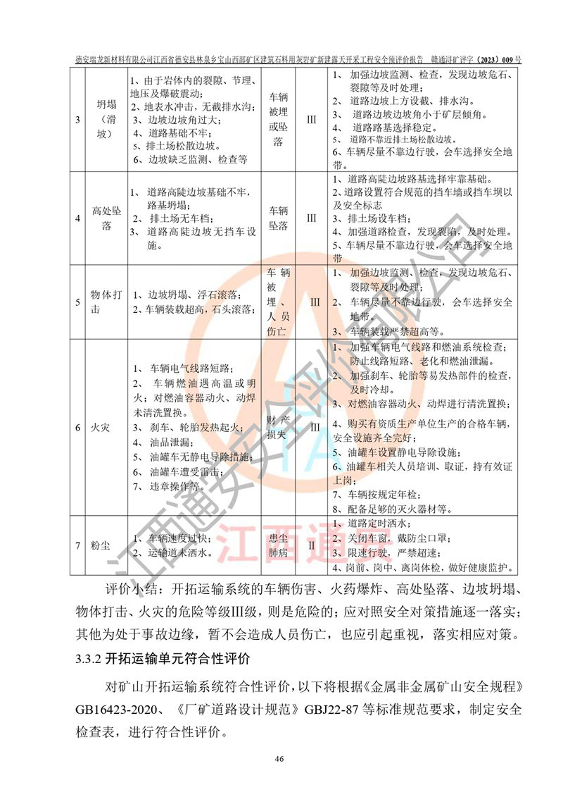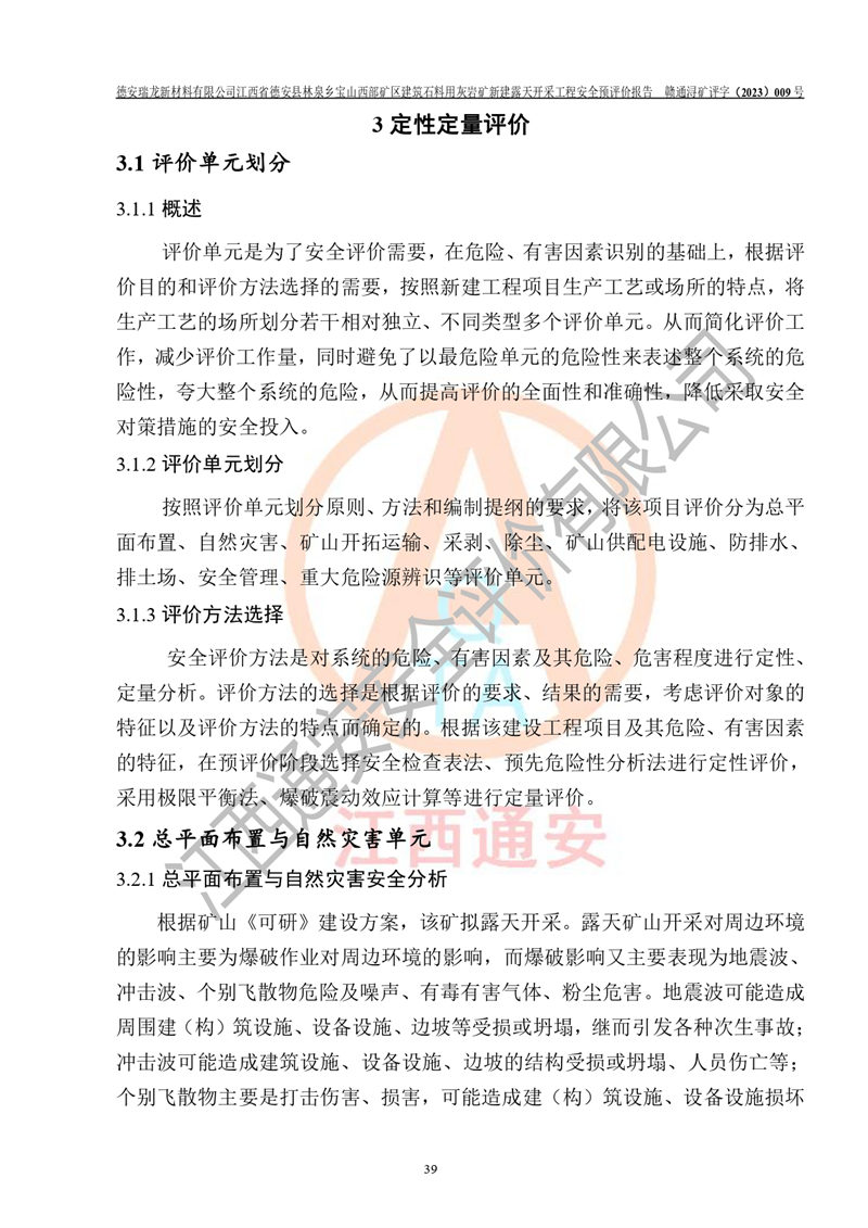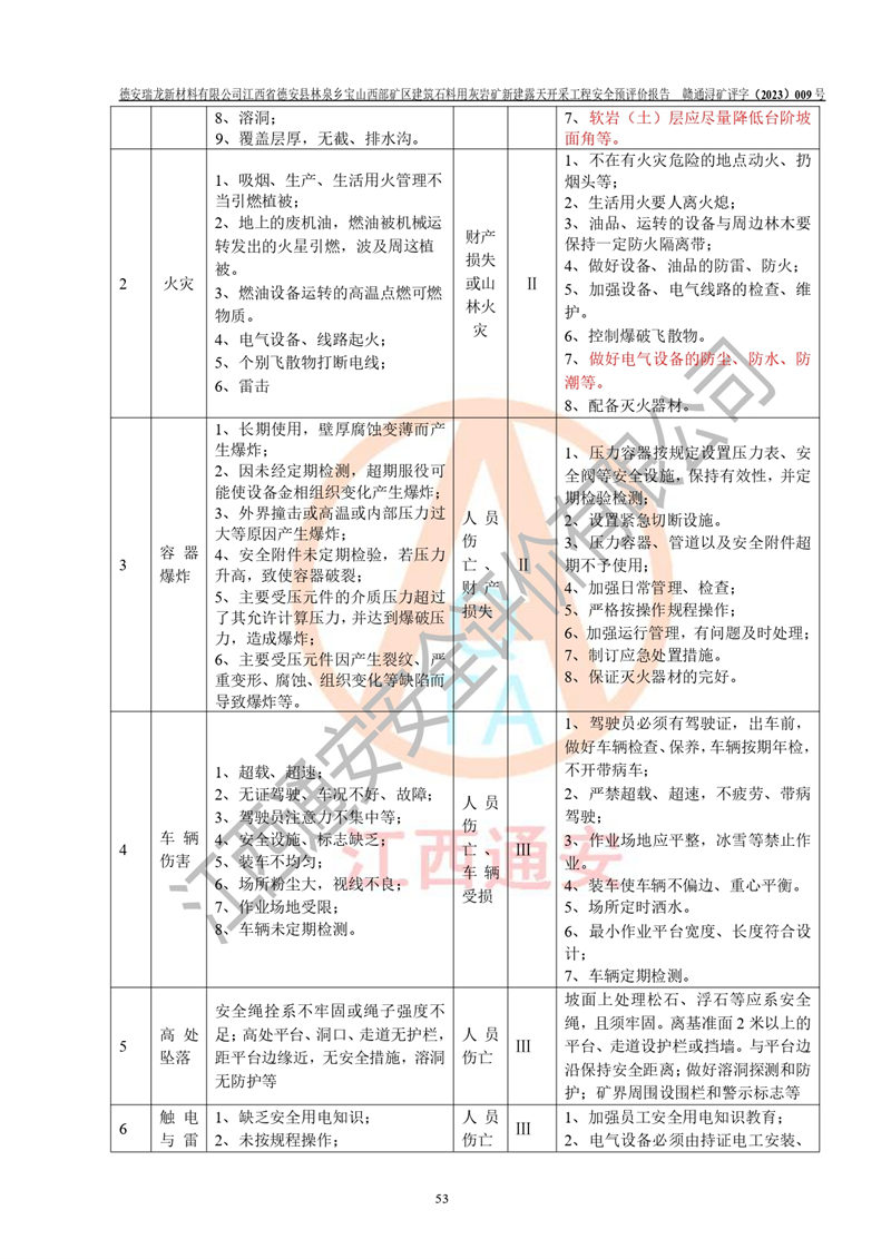 评价结论 | 总体结论:德安瑞龙新材料有限公司江西省德安县林泉乡宝山西部矿区建筑石料用灰岩矿新建露天开采工程项目潜在火药与雷管爆炸、放炮、坍塌(滑坡)、泥石流、触电、火灾、**伤害、高处坠落、物体打击、容器爆炸、机械伤害、中毒与窒息、淹溺、粉尘、高低温、噪声、振动等危险、有害因素,落实《可研》、《建议书》和本报告提出的安全措施和对策,风险可控,能达到可接受范围。 江西省德安县林泉乡宝山西部矿区建筑石料用灰岩矿新建露天开采工程项目露天开采工程落实《可研》、《建议书》和本报告提出的安全措施和对策,能够满足**有关法律、法规、规章、标准和规范的要求,可以进行建设。 | |||||