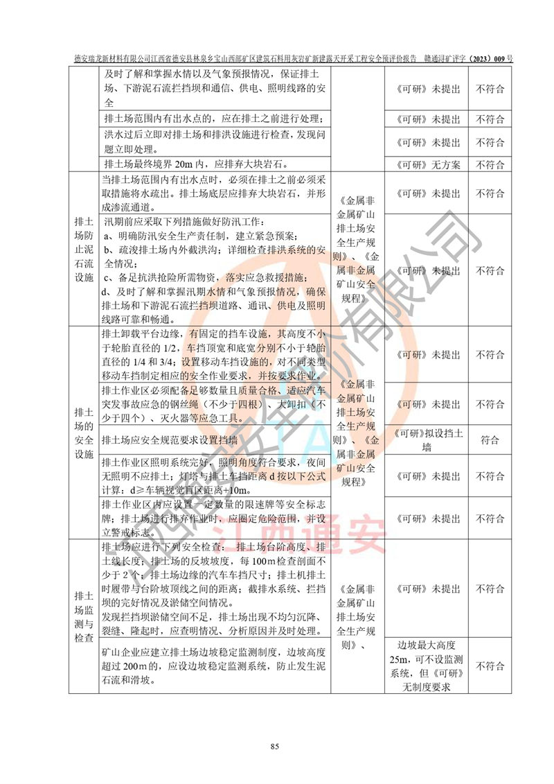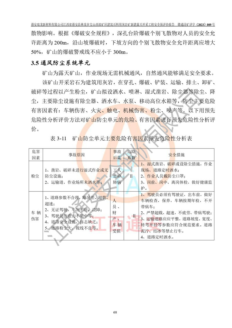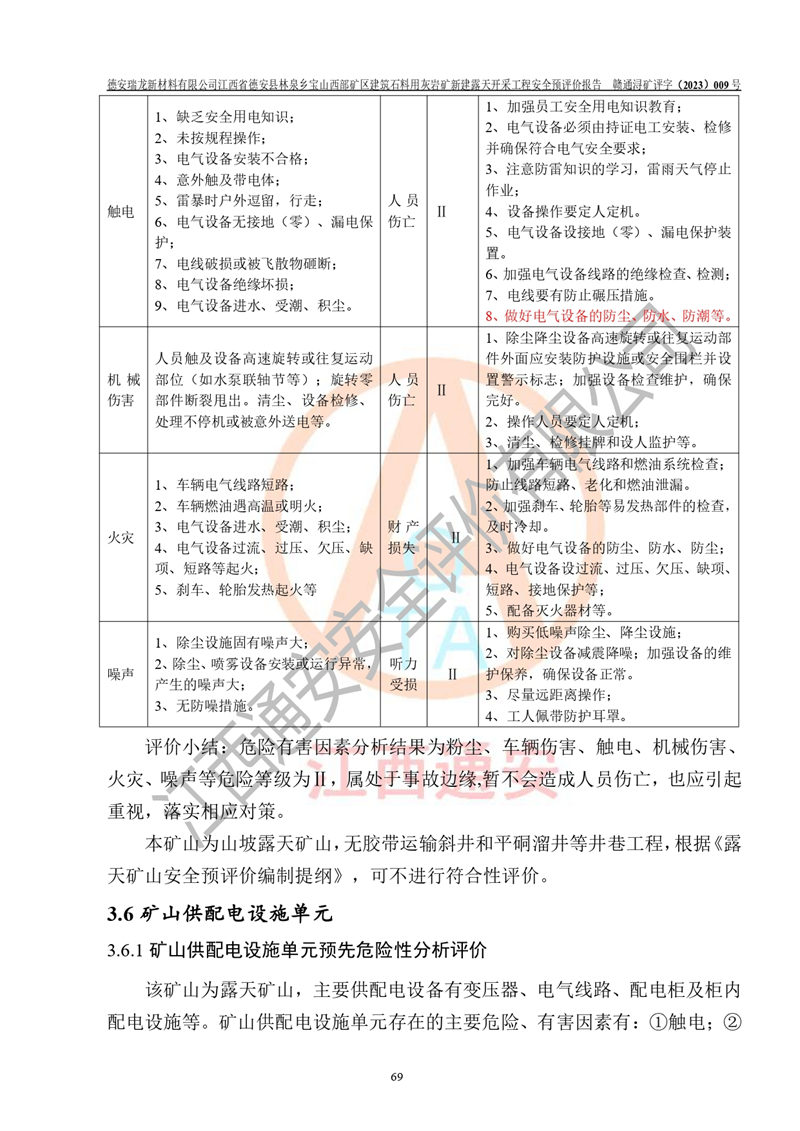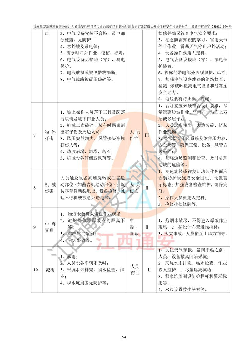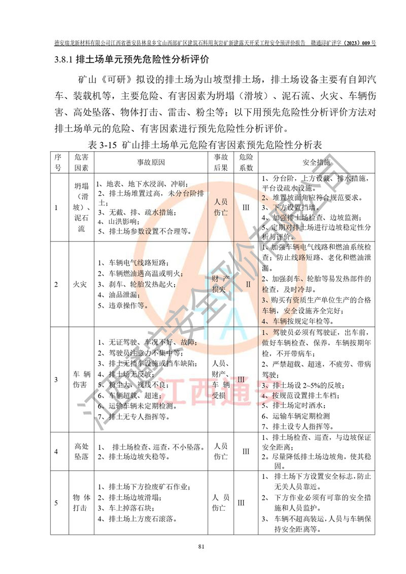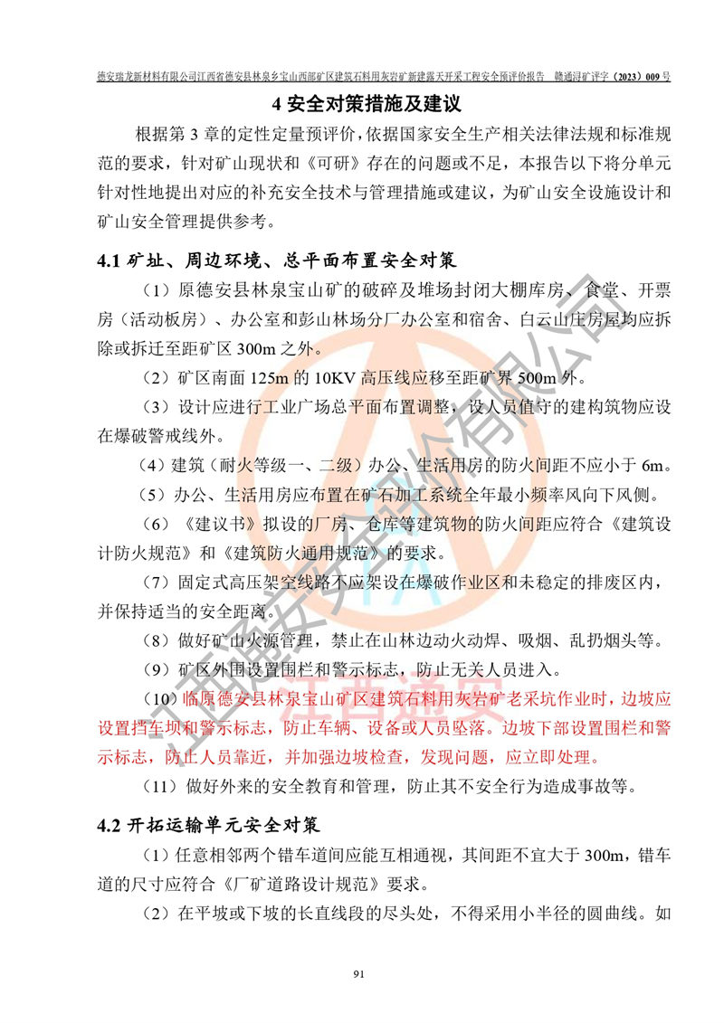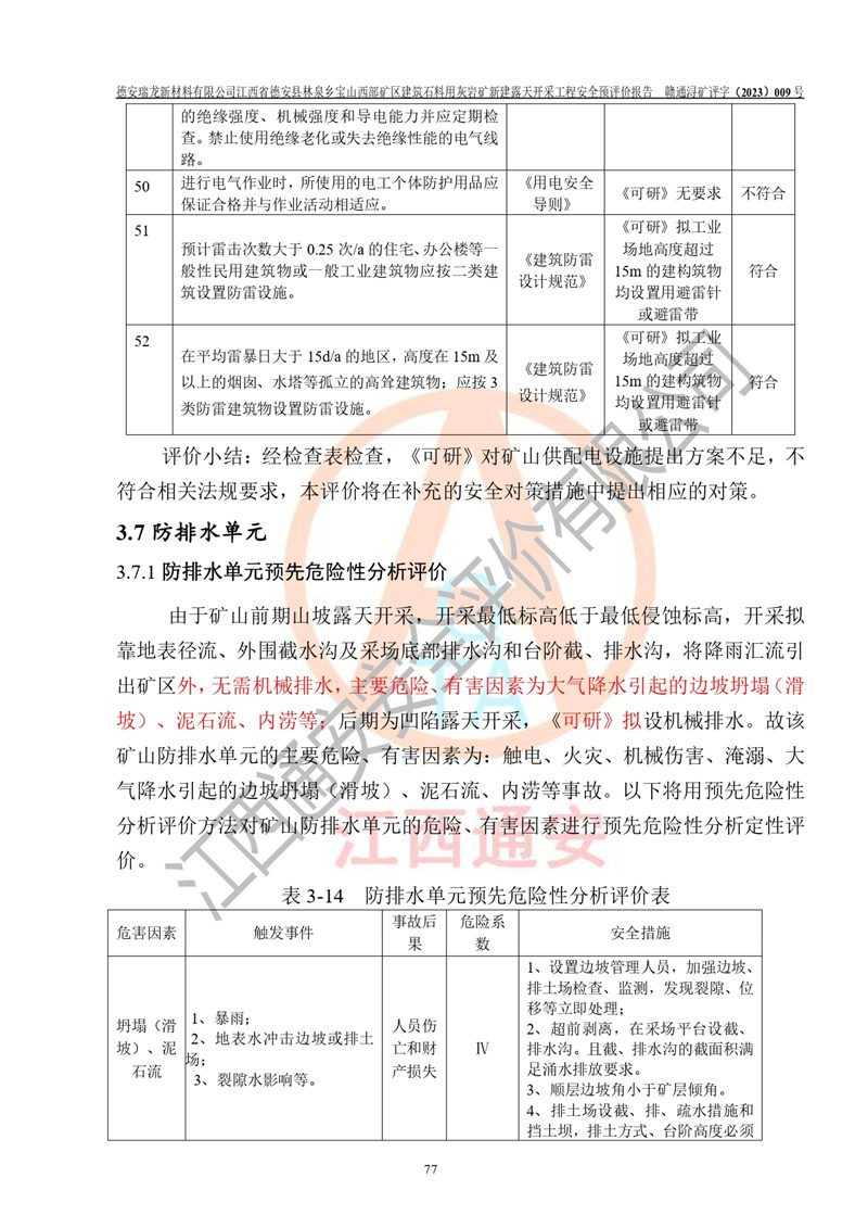 评价结论 | 总体结论:德安瑞龙新材料有限公司江西省德安县林泉乡宝山西部矿区建筑石料用灰岩矿新建露天开采工程项目潜在火药与雷管爆炸、放炮、坍塌(滑坡)、泥石流、触电、火灾、**伤害、高处坠落、物体打击、容器爆炸、机械伤害、中毒与窒息、淹溺、粉尘、高低温、噪声、振动等危险、有害因素,落实《可研》、《建议书》和本报告提出的安全措施和对策,风险可控,能达到可接受范围。 江西省德安县林泉乡宝山西部矿区建筑石料用灰岩矿新建露天开采工程项目露天开采工程落实《可研》、《建议书》和本报告提出的安全措施和对策,能够满足**有关法律、法规、规章、标准和规范的要求,可以进行建设。 | |||||