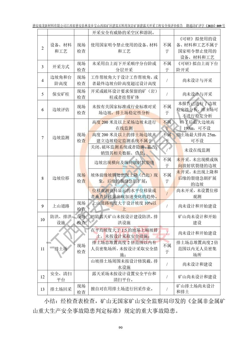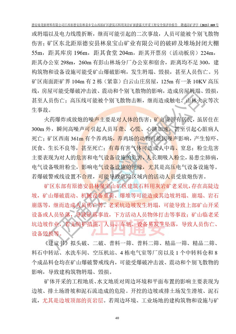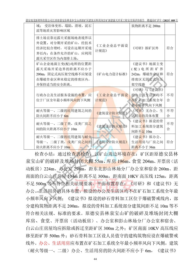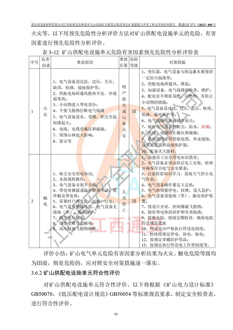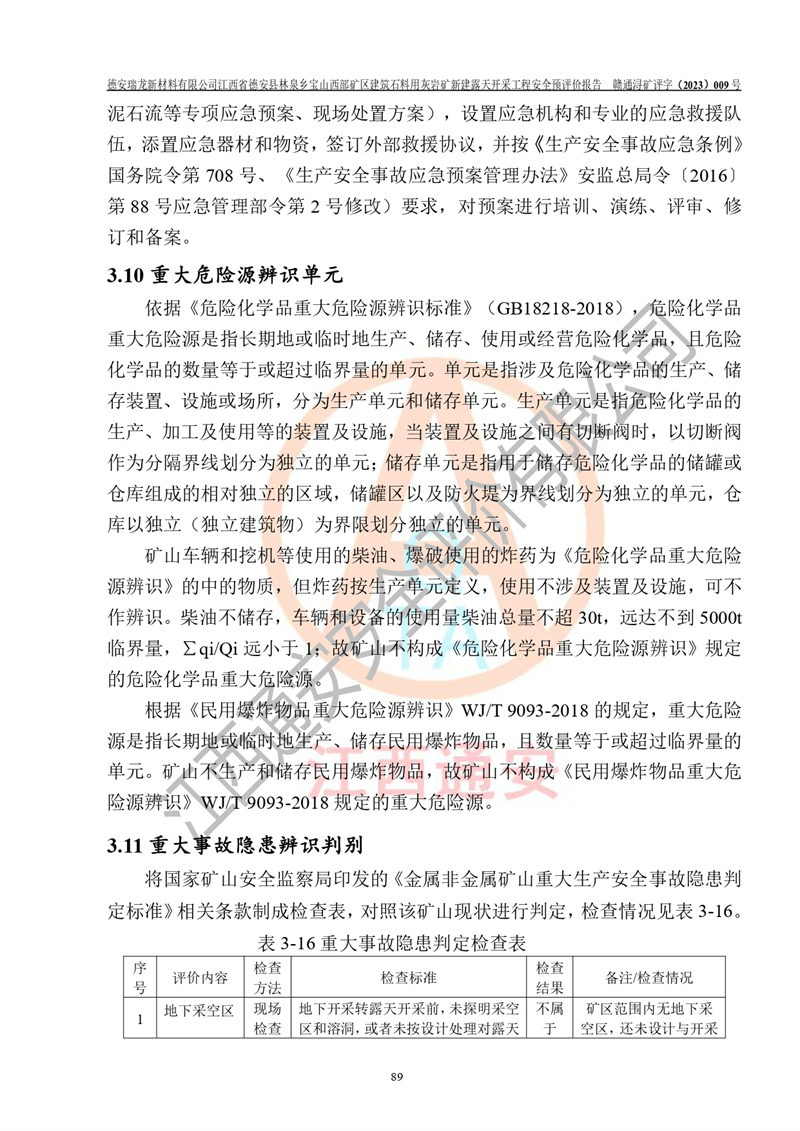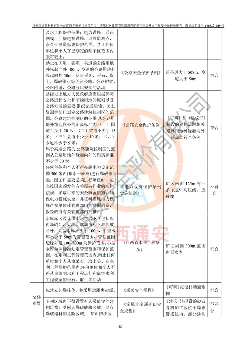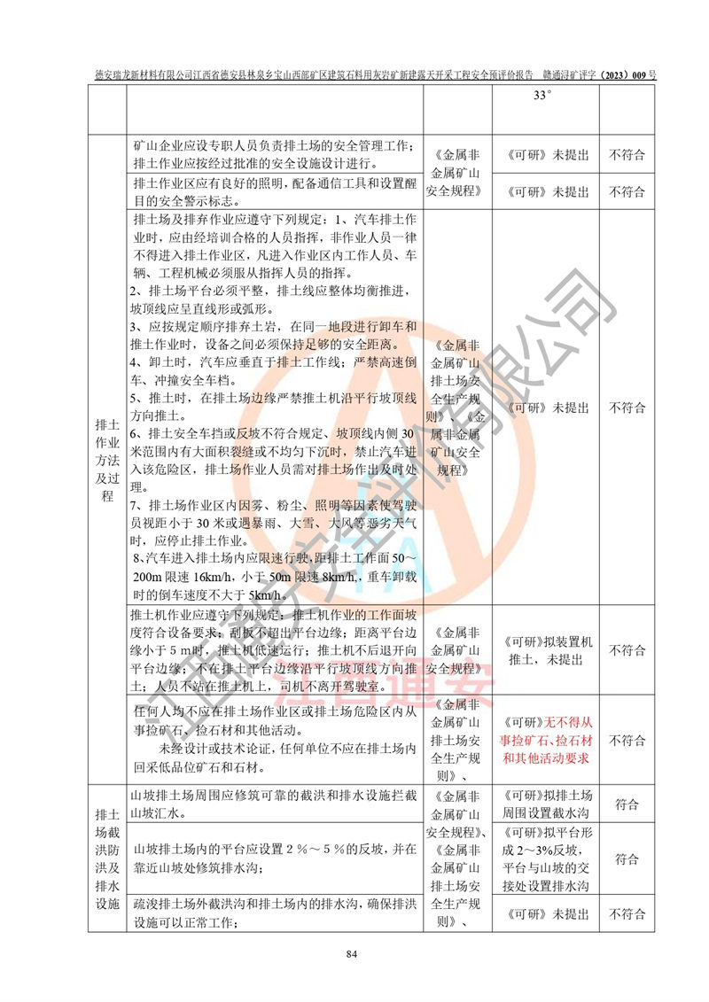 评价结论 | 总体结论:德安瑞龙新材料有限公司江西省德安县林泉乡宝山西部矿区建筑石料用灰岩矿新建露天开采工程项目潜在火药与雷管爆炸、放炮、坍塌(滑坡)、泥石流、触电、火灾、**伤害、高处坠落、物体打击、容器爆炸、机械伤害、中毒与窒息、淹溺、粉尘、高低温、噪声、振动等危险、有害因素,落实《可研》、《建议书》和本报告提出的安全措施和对策,风险可控,能达到可接受范围。 江西省德安县林泉乡宝山西部矿区建筑石料用灰岩矿新建露天开采工程项目露天开采工程落实《可研》、《建议书》和本报告提出的安全措施和对策,能够满足**有关法律、法规、规章、标准和规范的要求,可以进行建设。 | |||||
