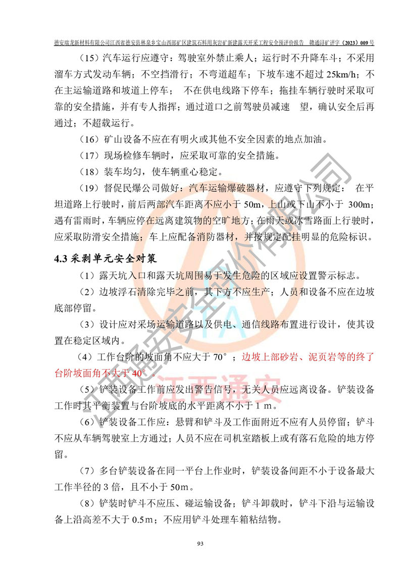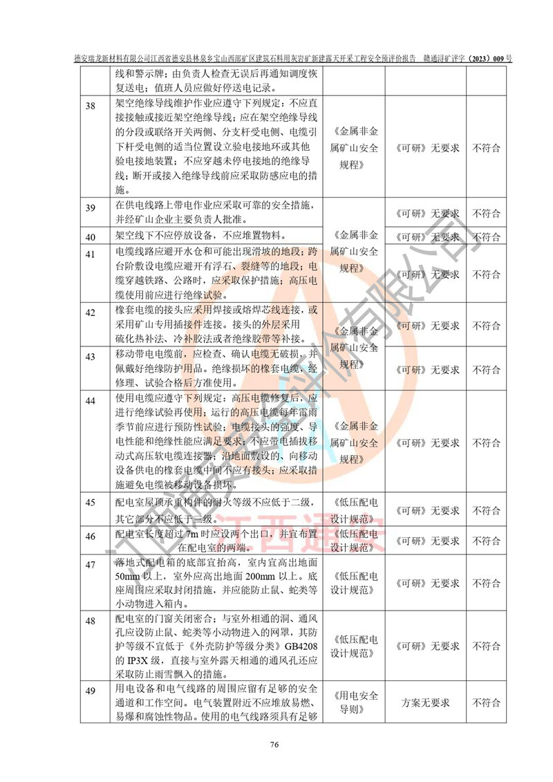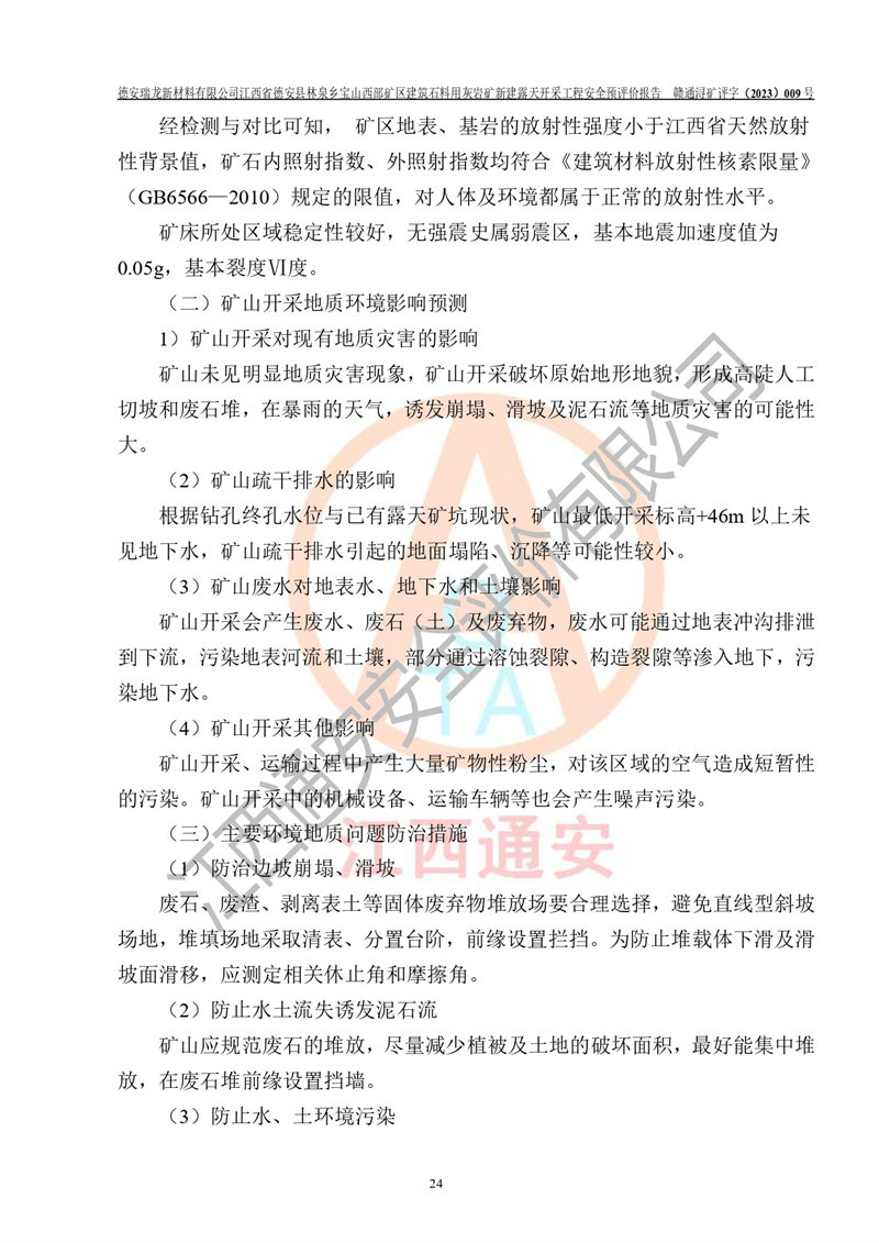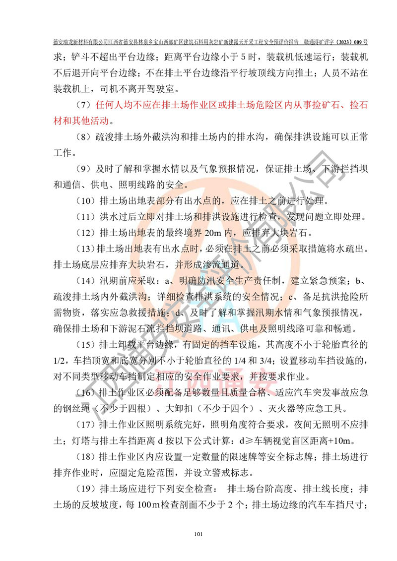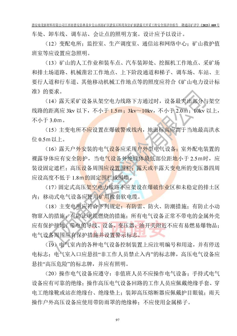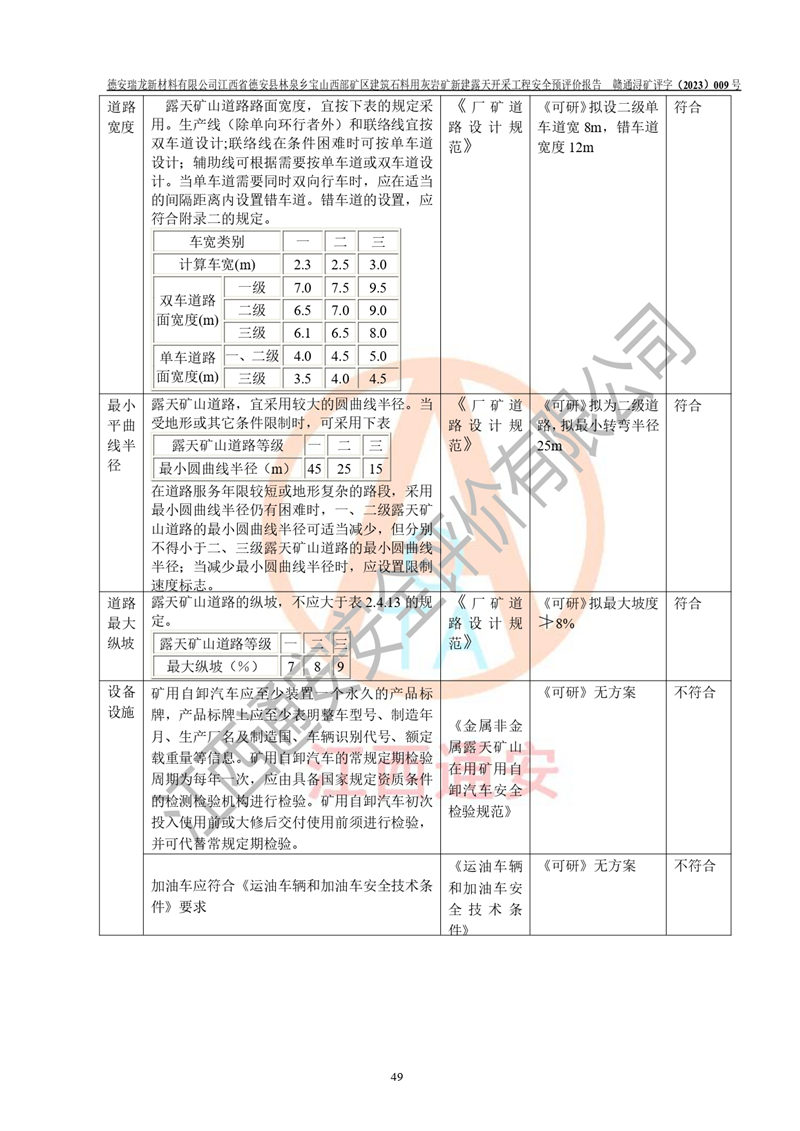 评价结论 | 总体结论:德安瑞龙新材料有限公司江西省德安县林泉乡宝山西部矿区建筑石料用灰岩矿新建露天开采工程项目潜在火药与雷管爆炸、放炮、坍塌(滑坡)、泥石流、触电、火灾、**伤害、高处坠落、物体打击、容器爆炸、机械伤害、中毒与窒息、淹溺、粉尘、高低温、噪声、振动等危险、有害因素,落实《可研》、《建议书》和本报告提出的安全措施和对策,风险可控,能达到可接受范围。 江西省德安县林泉乡宝山西部矿区建筑石料用灰岩矿新建露天开采工程项目露天开采工程落实《可研》、《建议书》和本报告提出的安全措施和对策,能够满足**有关法律、法规、规章、标准和规范的要求,可以进行建设。 | |||||
