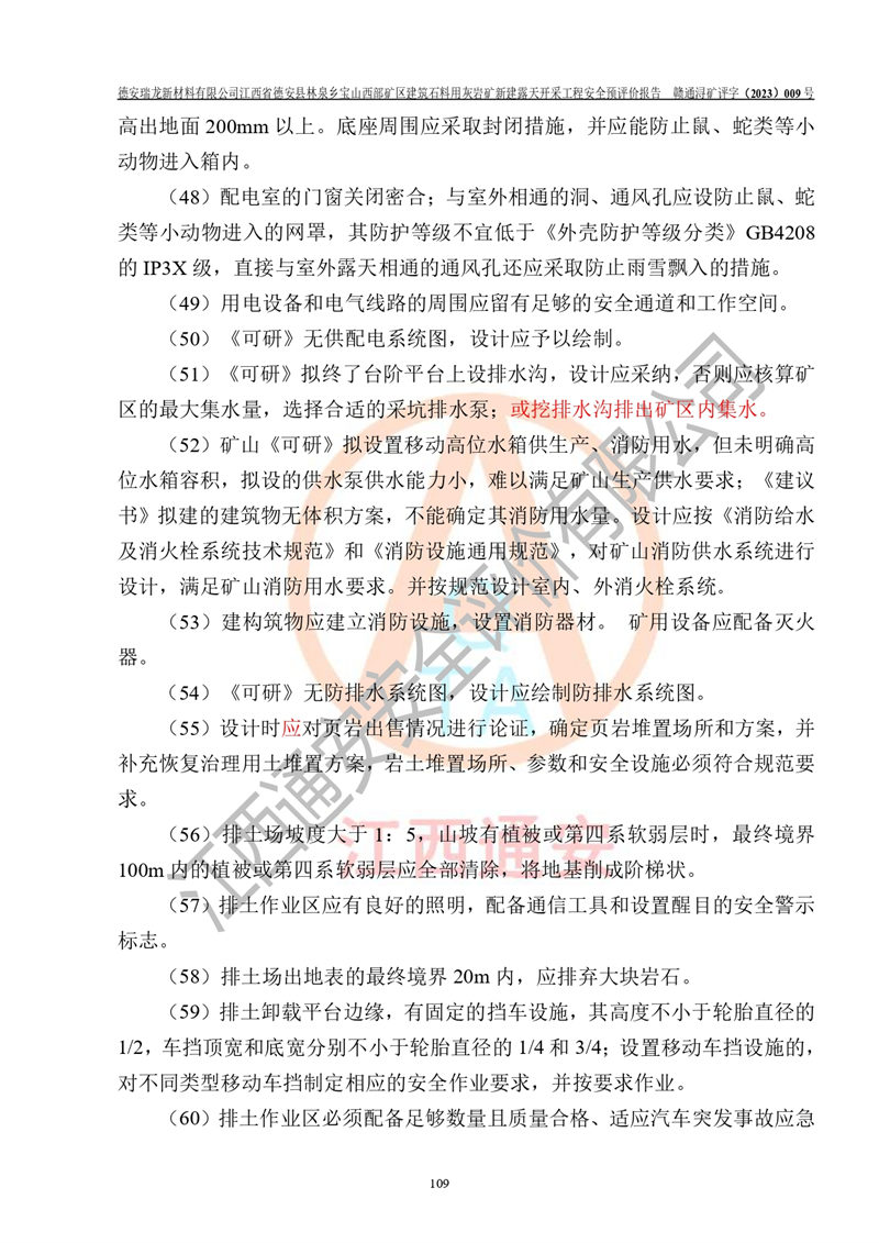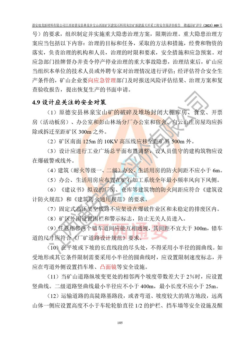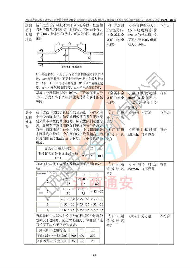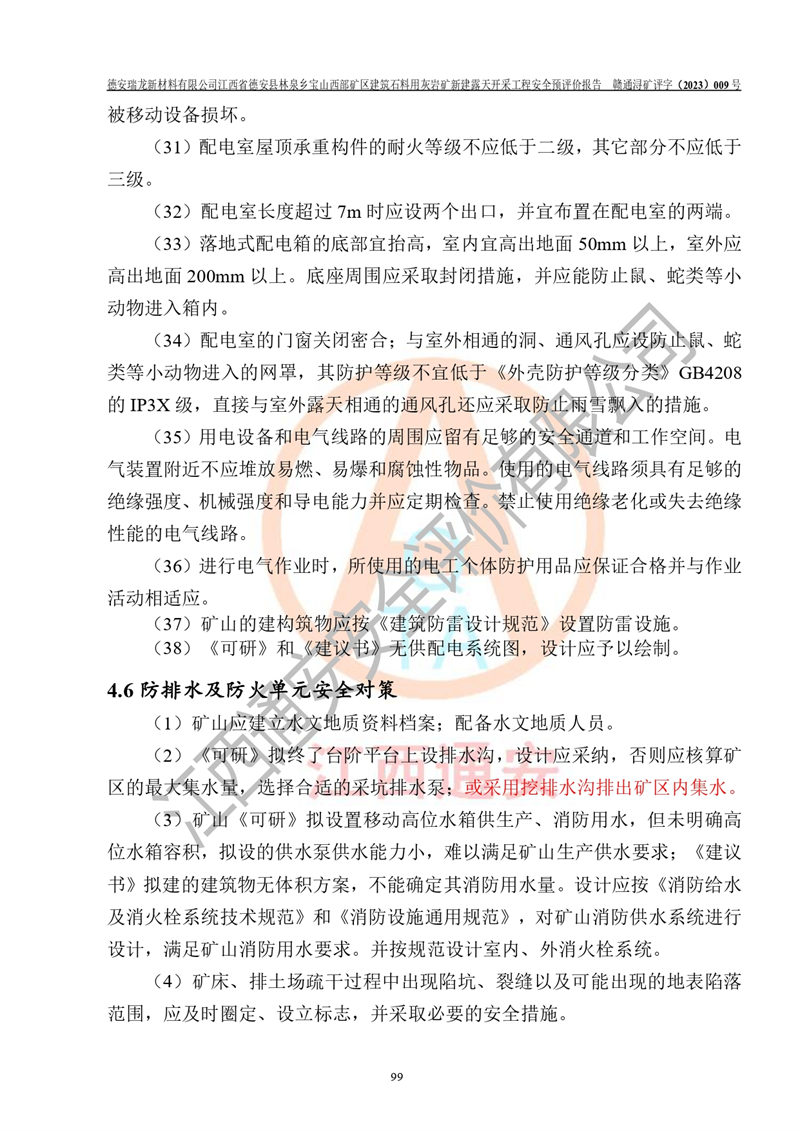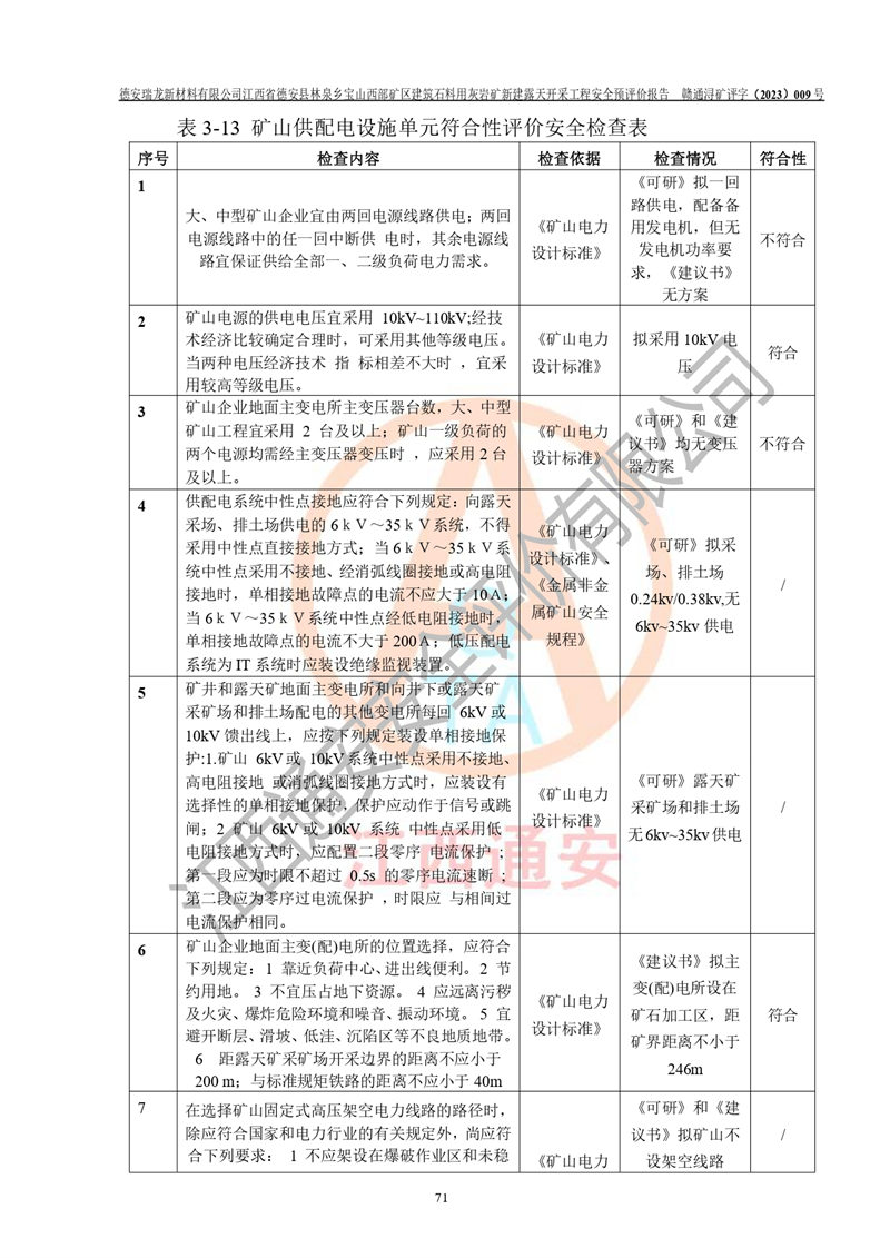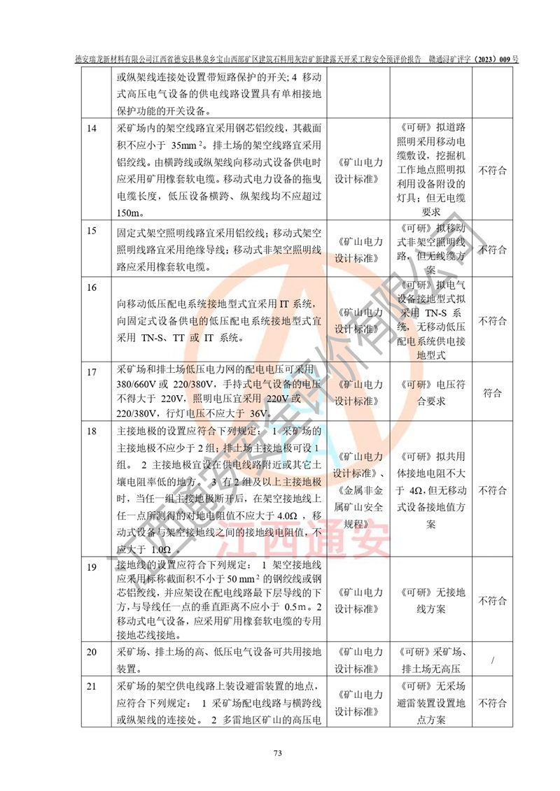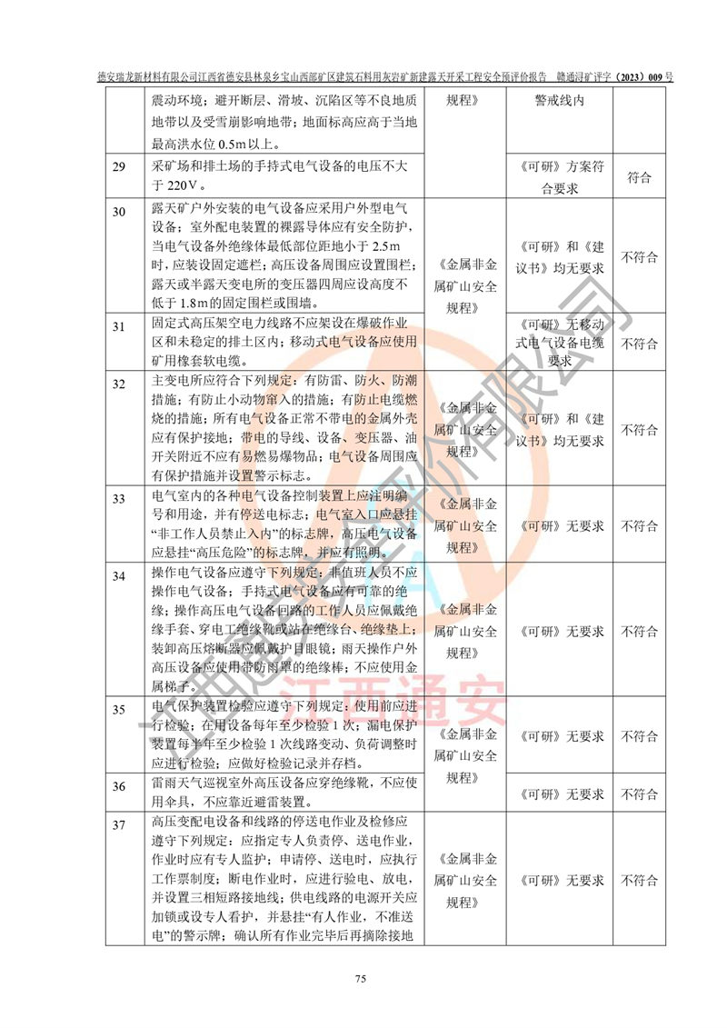 评价结论 | 总体结论:德安瑞龙新材料有限公司江西省德安县林泉乡宝山西部矿区建筑石料用灰岩矿新建露天开采工程项目潜在火药与雷管爆炸、放炮、坍塌(滑坡)、泥石流、触电、火灾、**伤害、高处坠落、物体打击、容器爆炸、机械伤害、中毒与窒息、淹溺、粉尘、高低温、噪声、振动等危险、有害因素,落实《可研》、《建议书》和本报告提出的安全措施和对策,风险可控,能达到可接受范围。 江西省德安县林泉乡宝山西部矿区建筑石料用灰岩矿新建露天开采工程项目露天开采工程落实《可研》、《建议书》和本报告提出的安全措施和对策,能够满足**有关法律、法规、规章、标准和规范的要求,可以进行建设。 | |||||