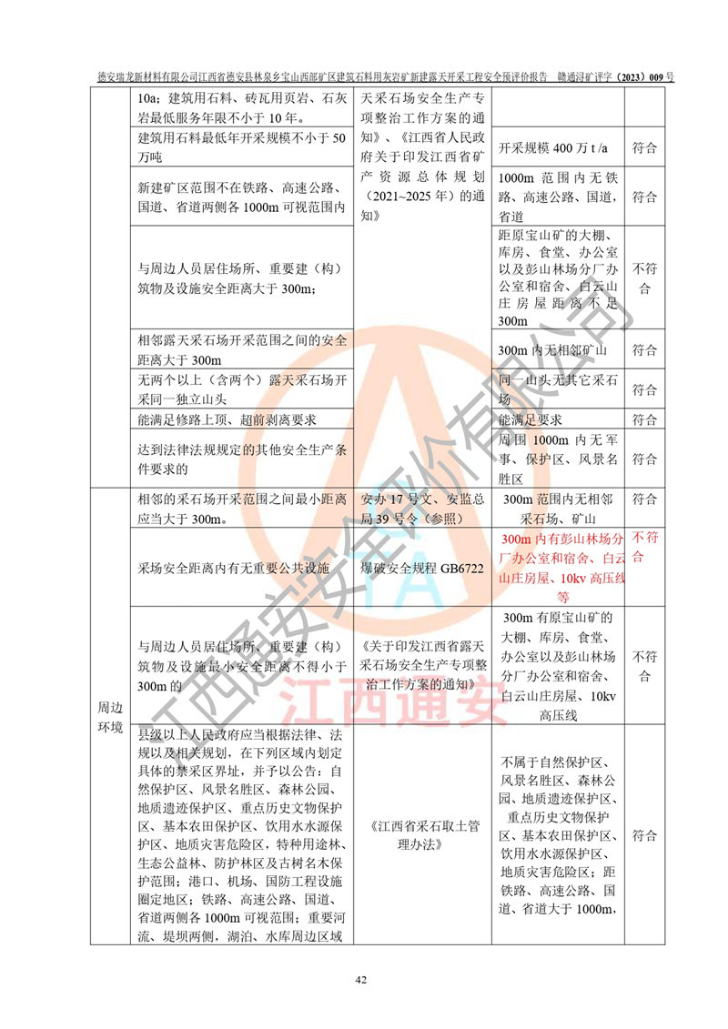 勘察现场发现的问题及安全对策措施 | 序号问题对策1原德安县林泉宝山矿的破碎及堆场封闭大棚库房、食堂、开票房(活动板房)、办公室,距矿界不足300m拆迁至300m之外2彭山林场分厂办公室和宿舍距矿界不足300m拆迁至300m之外3白云山庄房屋距矿界不足300m拆迁至300m之外4矿区南面125m有一条10KV高压线拆迁至500m之外