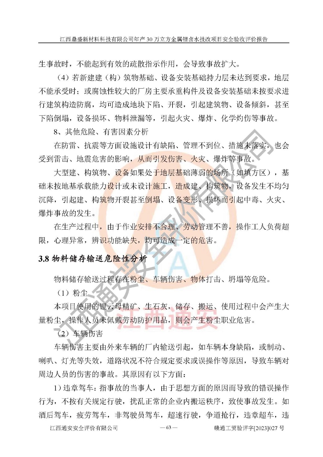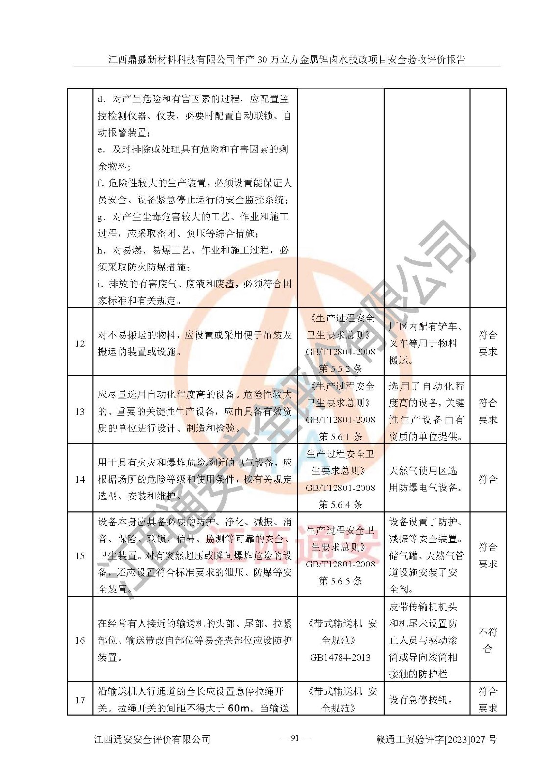 其它 | 根据《中华人民共和国安全生产法》、《新建项目安全设施“三同时”监督管理办法》(原**安全生产监督管理总局令第77号修订)等法律法规的要求,对江西鼎盛新材料科技有限公司年产 30 万立方金属锂卤水技改项目安全验收的基本条件进行分析,结果如下: 1)本项目在初步设计及建设过程中基本能贯彻执行**、地方及有关部门的安全生产法律法规、标准要求,取得了**相关部门的许可、备案。项目的设计、施工等单位均有相应资质。 2)本项目址选符合要求;总平面布置合理,主要建筑的防火间距符合符合《建筑设计防火规范》(GB50016-2014,2018版)、《工业企业总平面设计规范》(GB50187-2012)有关规范、标准的要求。 3)本项目生产工艺成熟、试运行正常,试运行中过程中工艺和装置、设备(设施)安全、可靠,未发生安全事故。 4)本项目的特种设备由有资质单位设计、制造、安装,特种设备经宜春市特种设备检验中心检验合格,符合《中华人民共和国特种设备安全法》、《特种设备安全监察条例》(中华人民共和国***令第549号)的规定。特种设备作业人员、特种作业人员均持证上岗。 5)企业安全管理人员取得了江西省亿源企业咨询服务有限公司颁发的培训证书,主要负责人暂未取得证书,特种作业人员操作证在**期内,其他从业人员经安全培训符合,取得上岗证。 6)企业建立有安全管理制度,制定有各类人员的安全生产责任制、各项安全管理制度和操作规程。按照**有关规定编制了事故应急救援预案并进行了备案,并定期进行演练等,符合要求。 7)本项目作业条件危险性分析结果:在选定的单元的危险程度均为“可能危险,需要注意”或“稍有危险,可以接受”,作业条件相对安全。 评价结论: 江西鼎盛新材料科技有限公司年产 30 万立方金属锂卤水技改项目的安全设施及安全管理符合**及有关部门关于安全生产法律、法规、标准的要求,该项目试生产以来,工艺设备、安全设施及企业安全管理机制等运行正常,安全设施、措施达到设计要求和预期结果,可以满足建设项目安全生产的要求,安全生产管理**,具备竣工验收条件。 | ||||